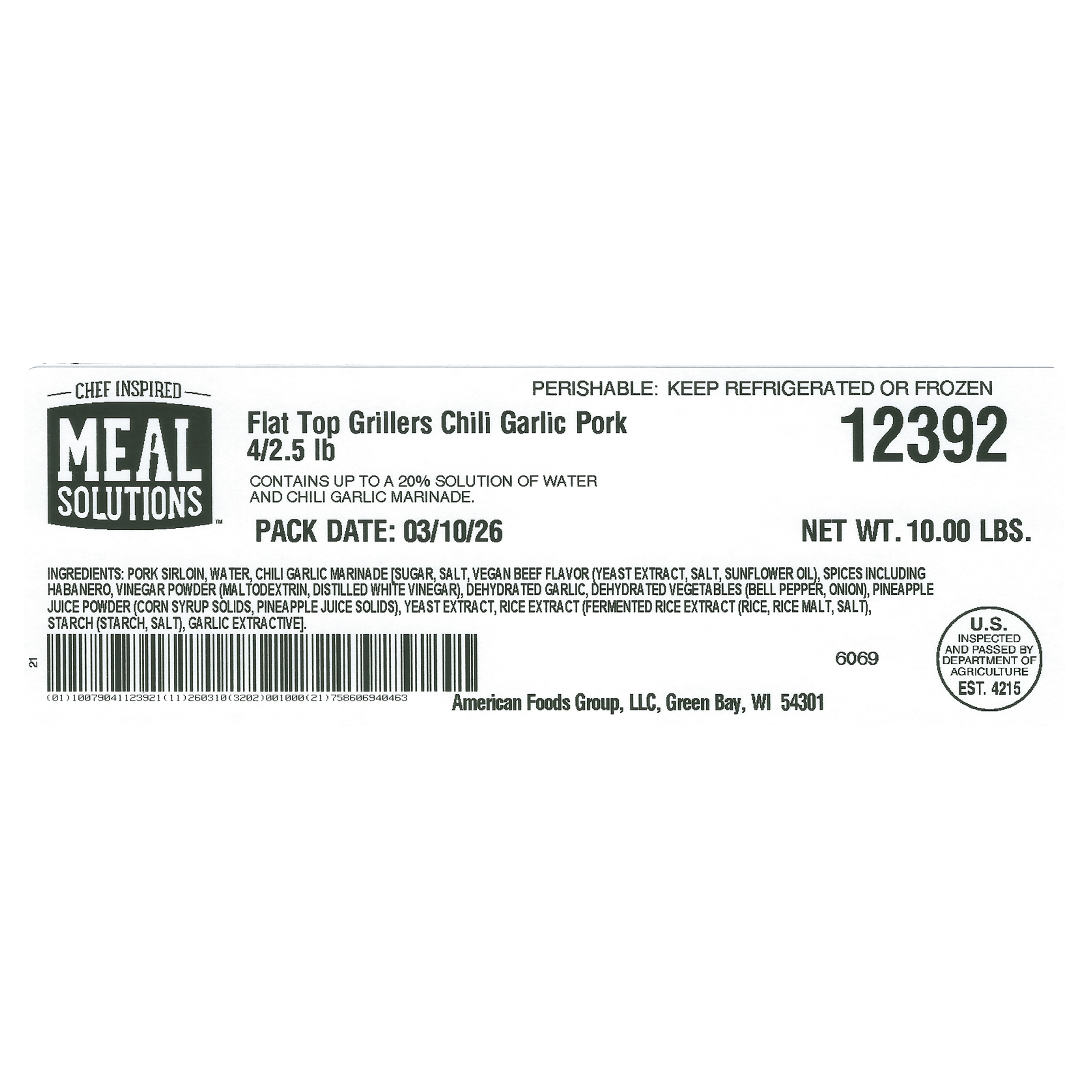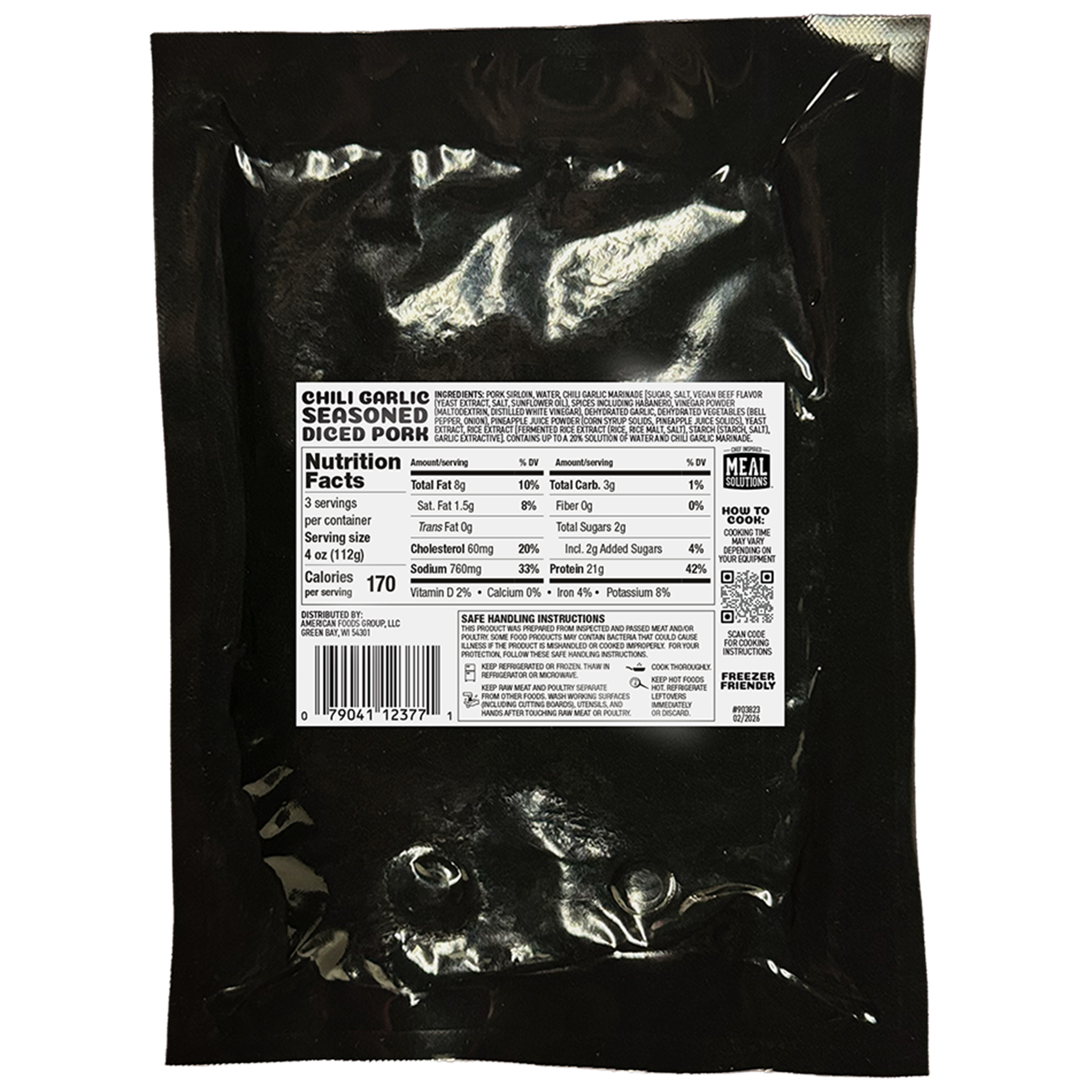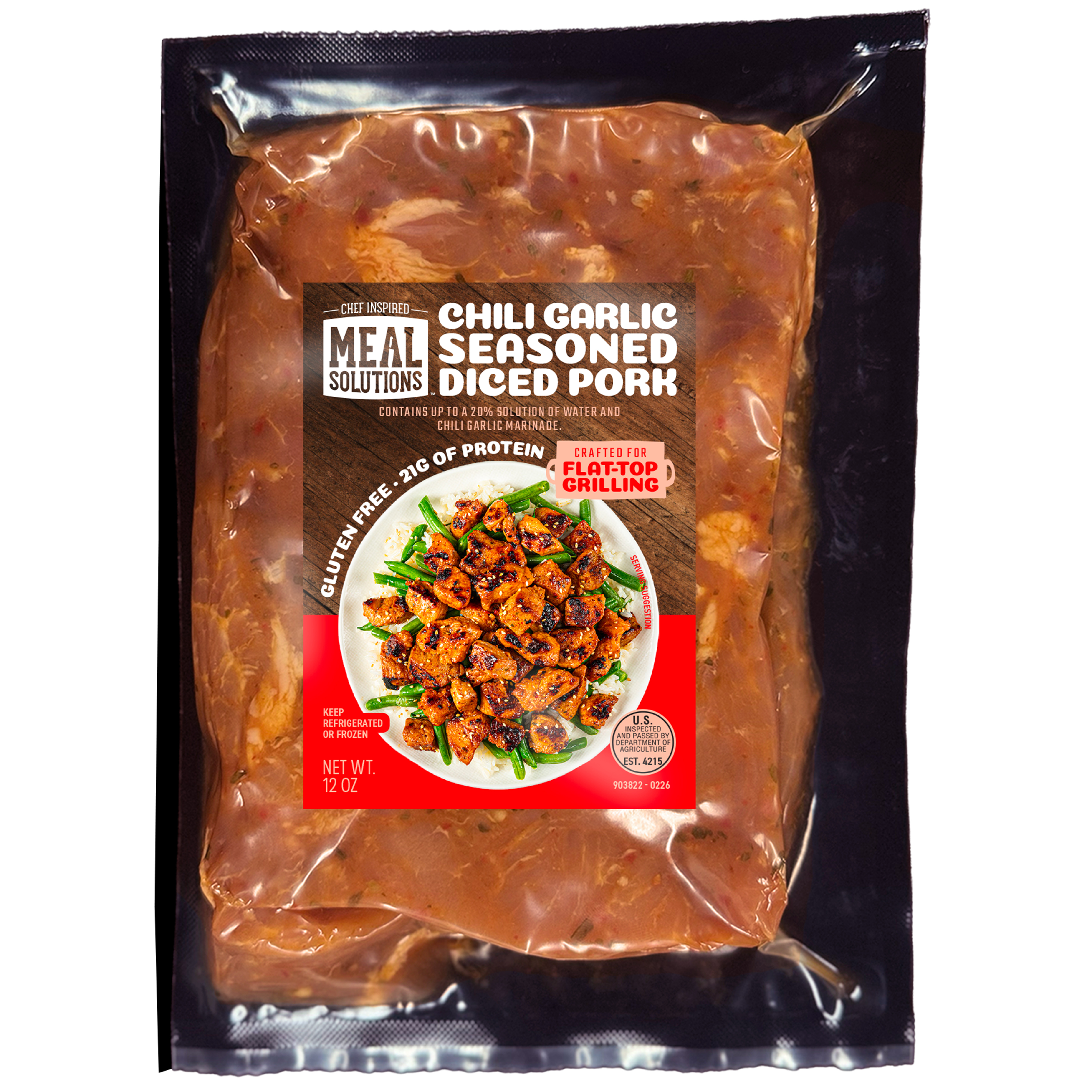 Meal Solutions Chili Garlic Seasoned Diced Pork, 4-2.5 Pound Per 10 Pound Net Weight Master Case.
