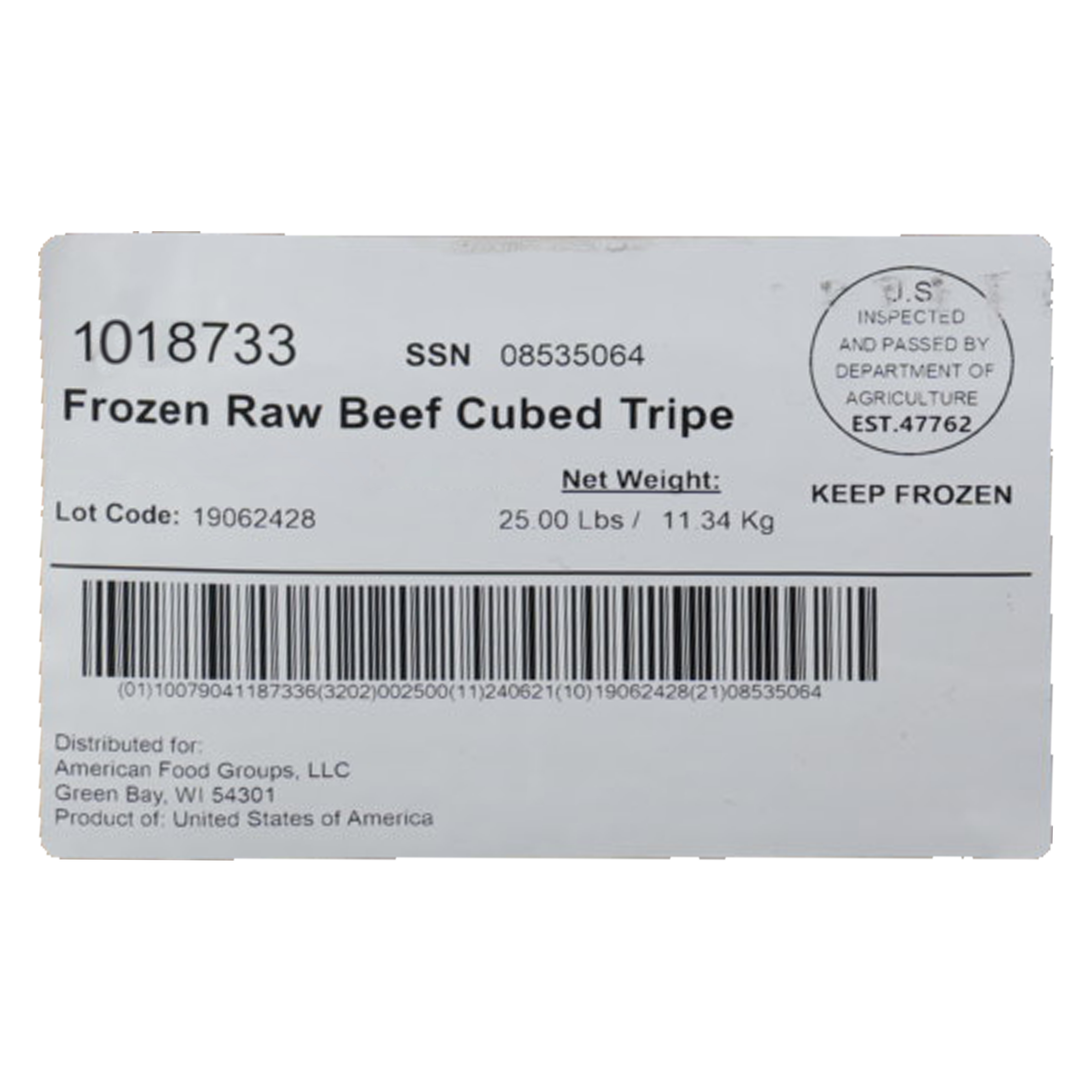 Skylark Frozen Raw Cut Beef Tripe, 25 Pound Net Weight Master Case, Multiple Pieces Per Bag