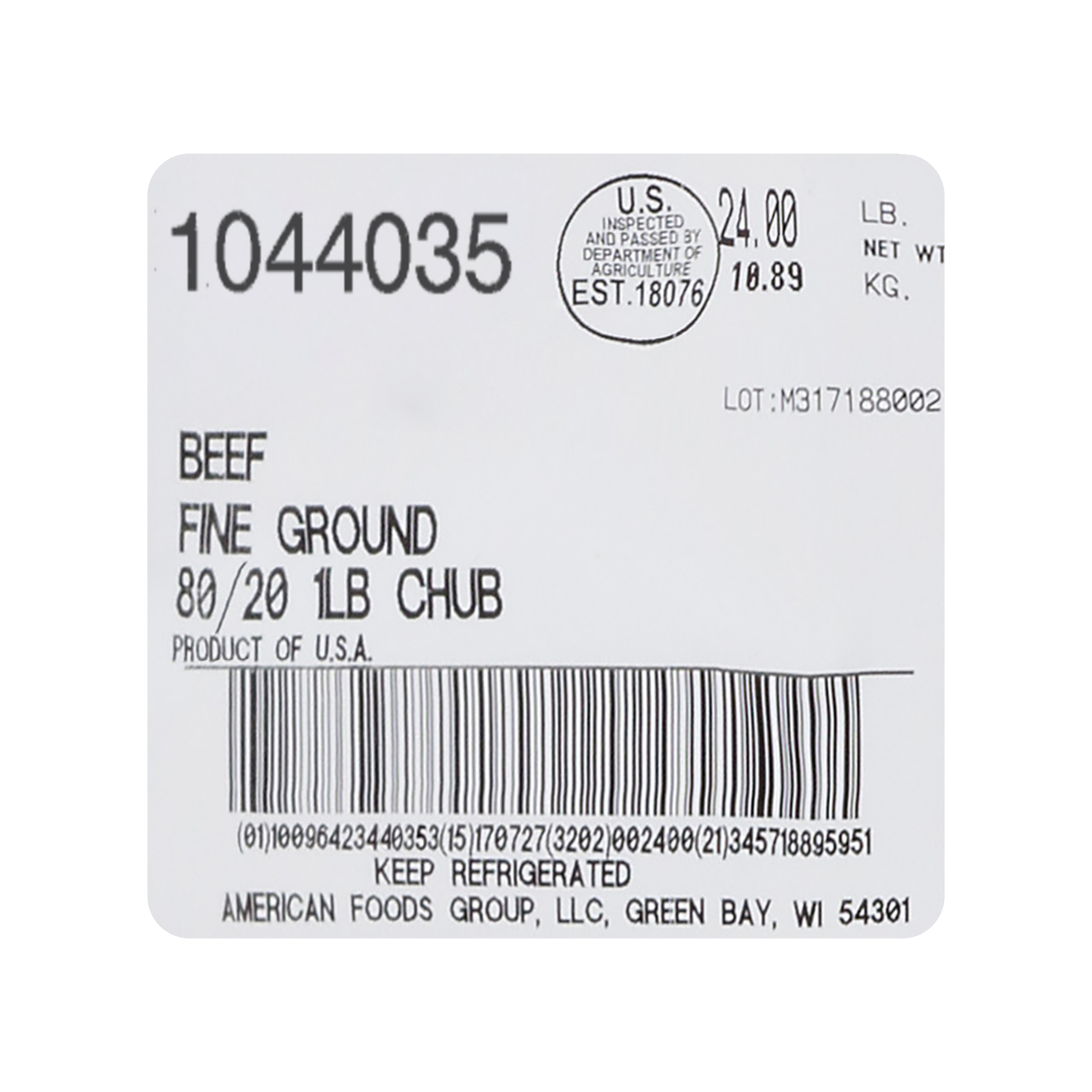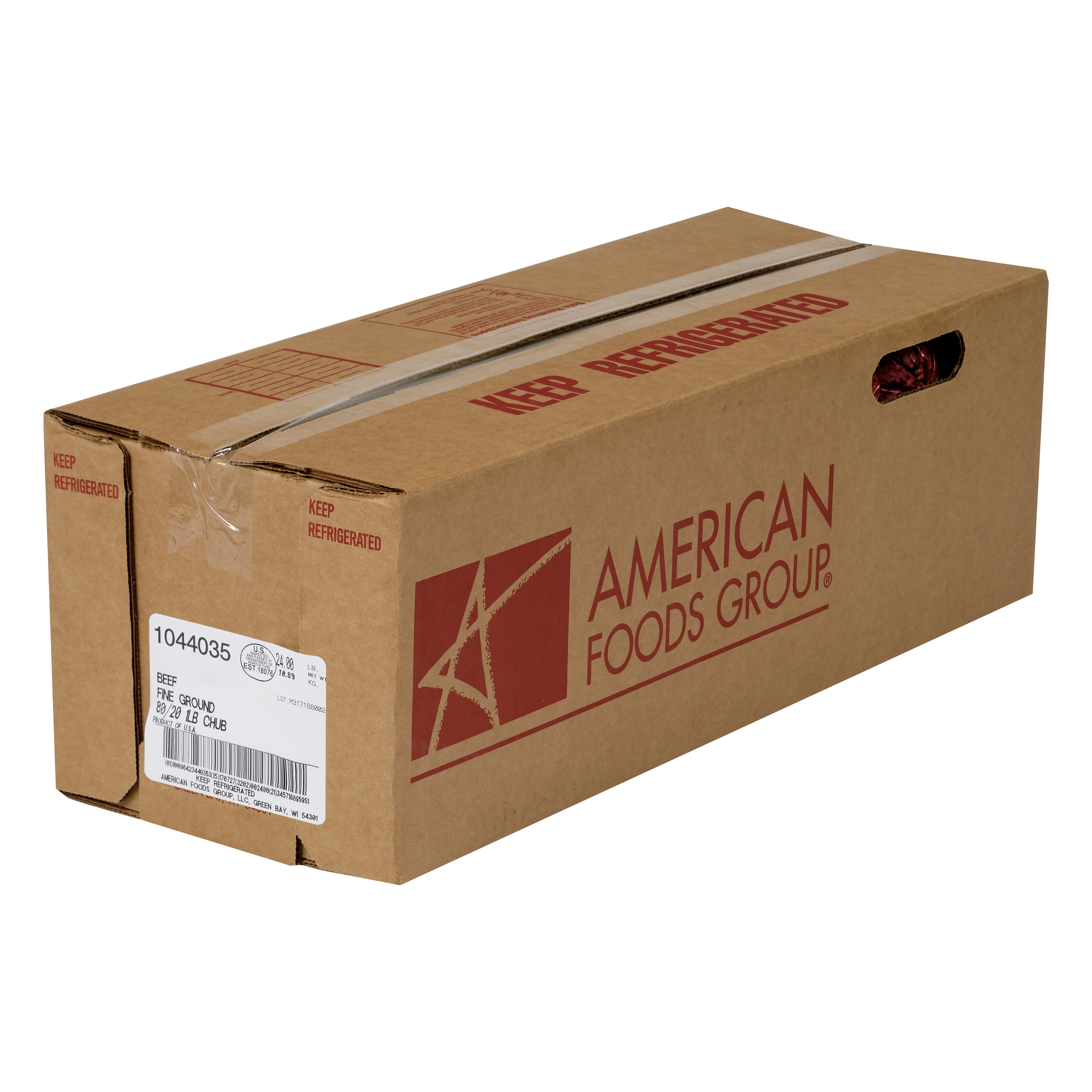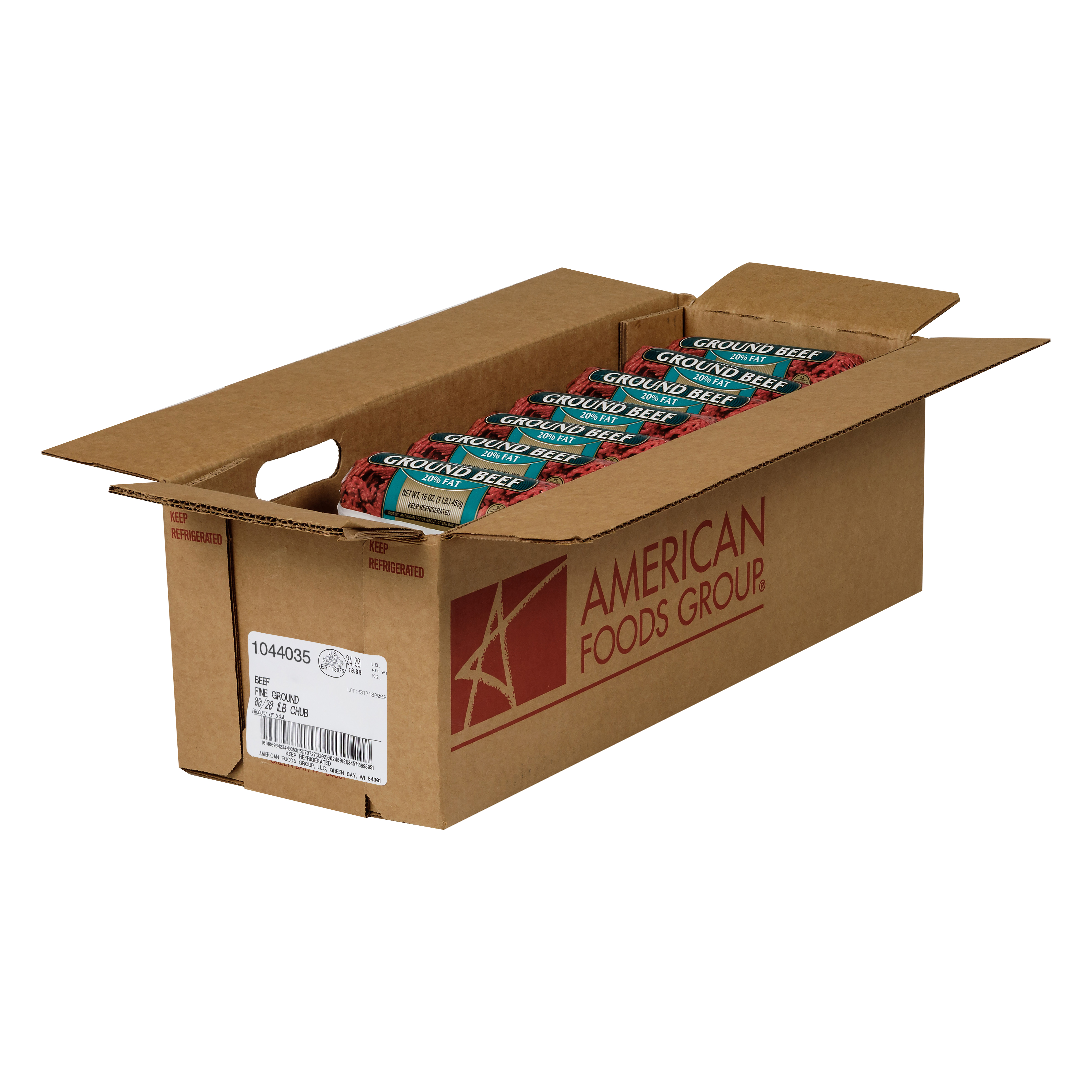 American Foods Group Frozen Fine Ground Beef, 80 Percent Lean 20 Percent Fat, 24-1 Pound Chubs Per 24 Pound Net Weight Master Case