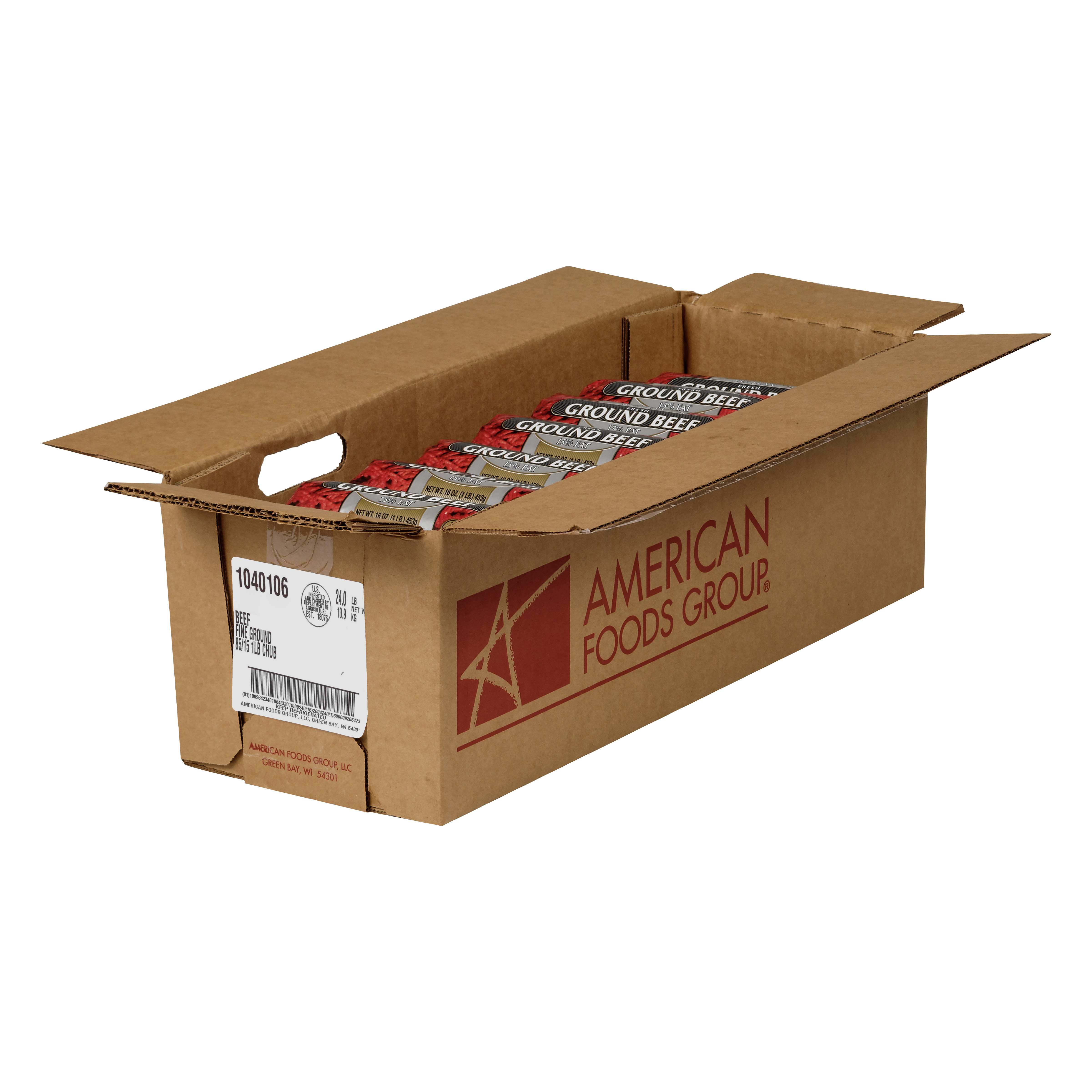 American Foods Group Fresh Fine Ground Beef, 85 Percent Lean 15 Percent Fat, 24-1 Pound Chubs Per 24 Pound Net Weight Master Case
