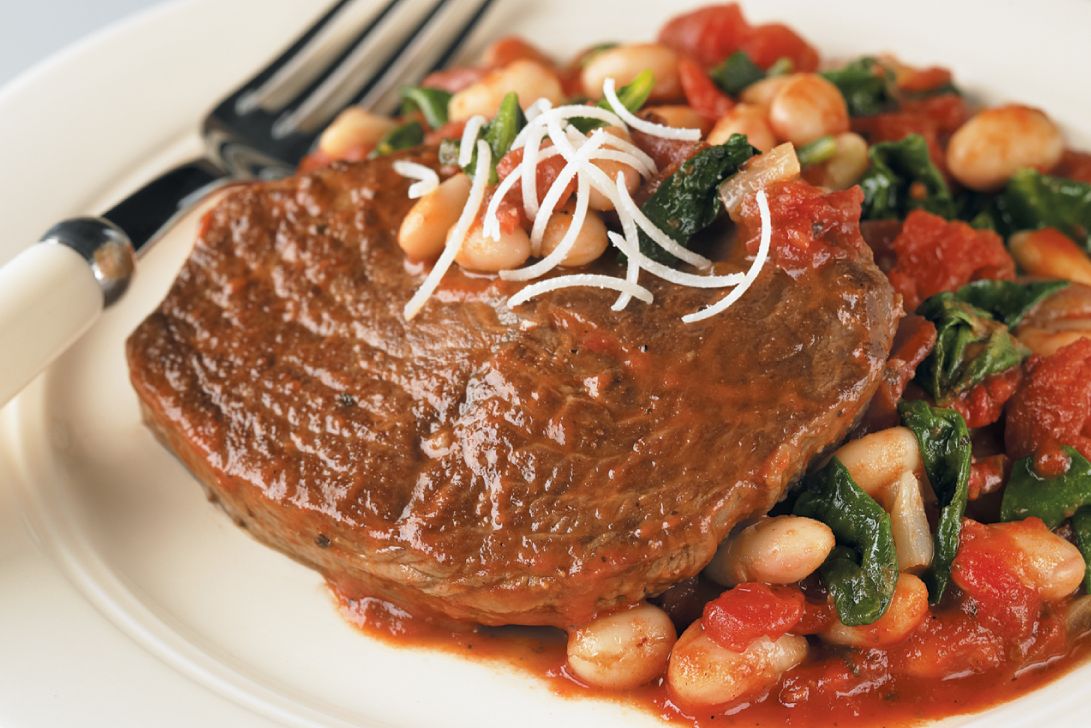 Enjoy the flavors of Tuscany with beef Chuck Tender Steaks slow-cooked with white beans and spinach. Top this with Parmesan cheese for a delicious meal any night of the week.