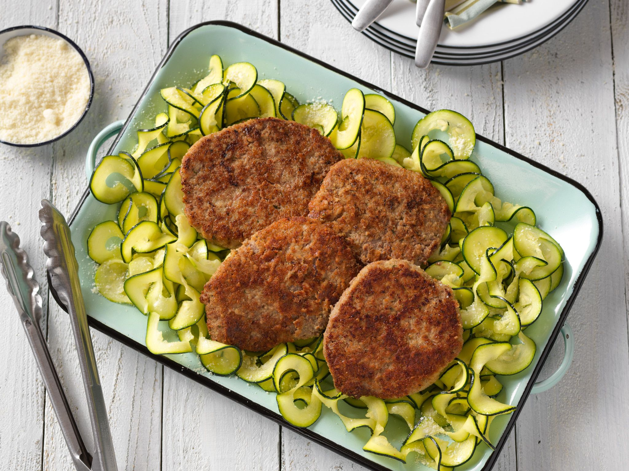 A Parmesan cheese and bread crumb coating give these Cubed Steaks a familiar crunch, while beautiful zucchini ribbons provide a fresh side dish.
