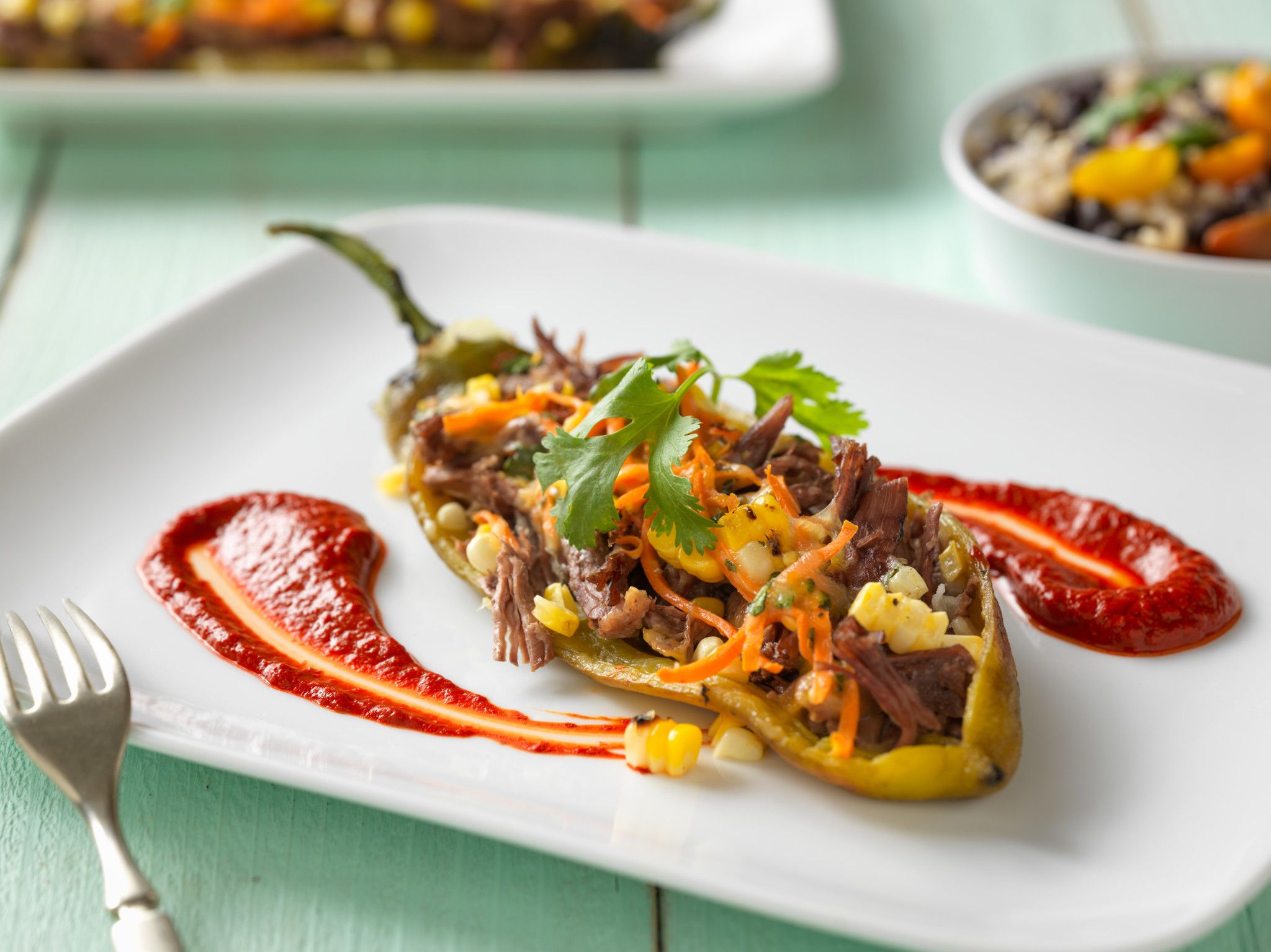 Coat 13 x 9-inch glass baking dish with cooking spray. Cut corn from cob (about 1 cup). Combine cheese, corn, carrot and cilantro in medium bowl; mix well. Divide shredded beef among 6 Anaheim peppers; top with cheese filling. Fold pepper around filling. Place stuffed chiles, side by side in prepared baking dish, nesting chiles together as needed. Bake in 400°F oven 10 to 15 minutes or until internal temperature reaches 165°F and cheese is melted. - Meanwhile, to prepare Guajillo Chile Sauce, drain soaking water from rehydrated guajillo peppers, reserving 1/2 cup water. Place peppers in blender or food processor container. Add reserved 1/2 cup soaking water and remaining 1/2 teaspoon salt. Cover; pulse on and off until mixture is smooth. Process 1 minute more. Strain through fine mesh strainer.