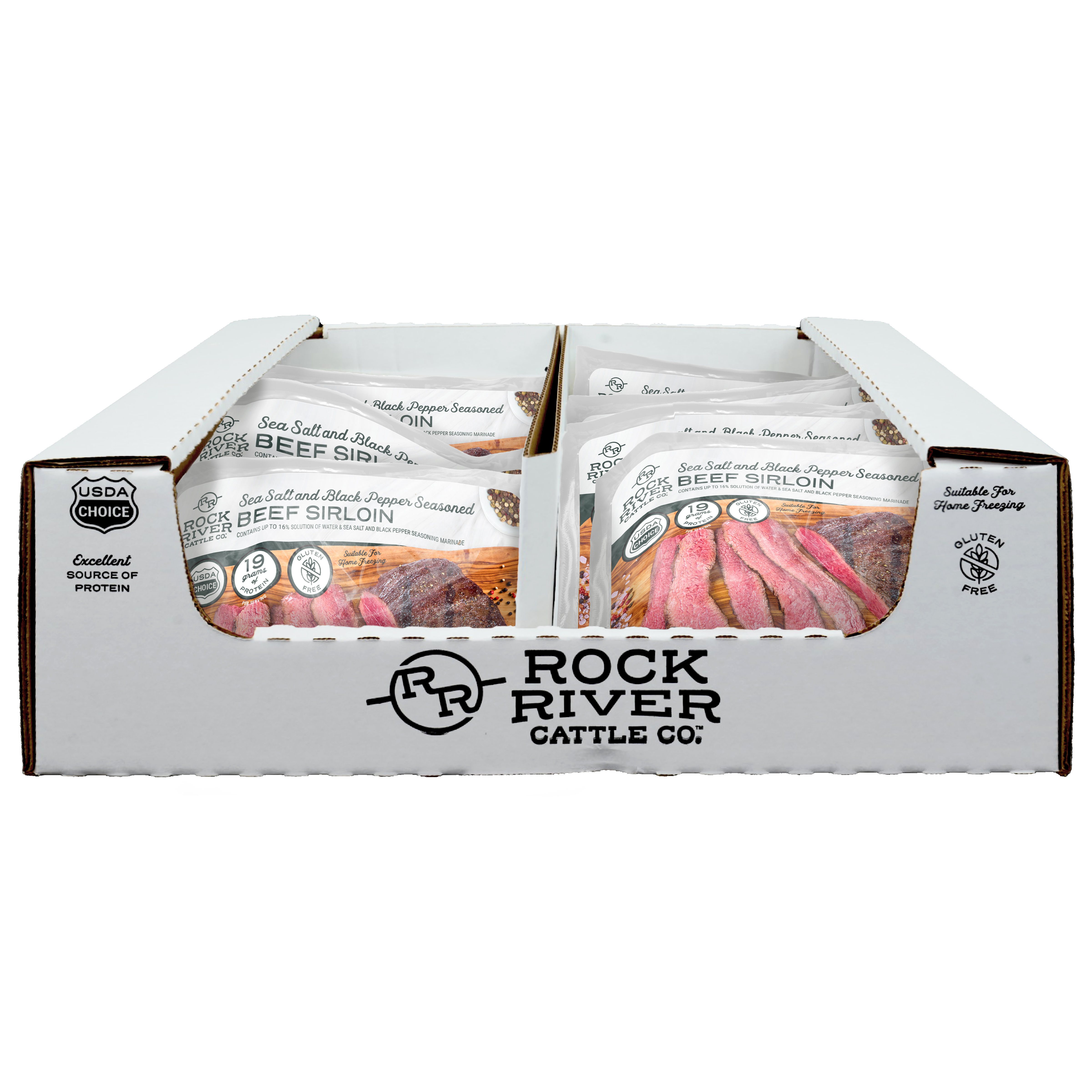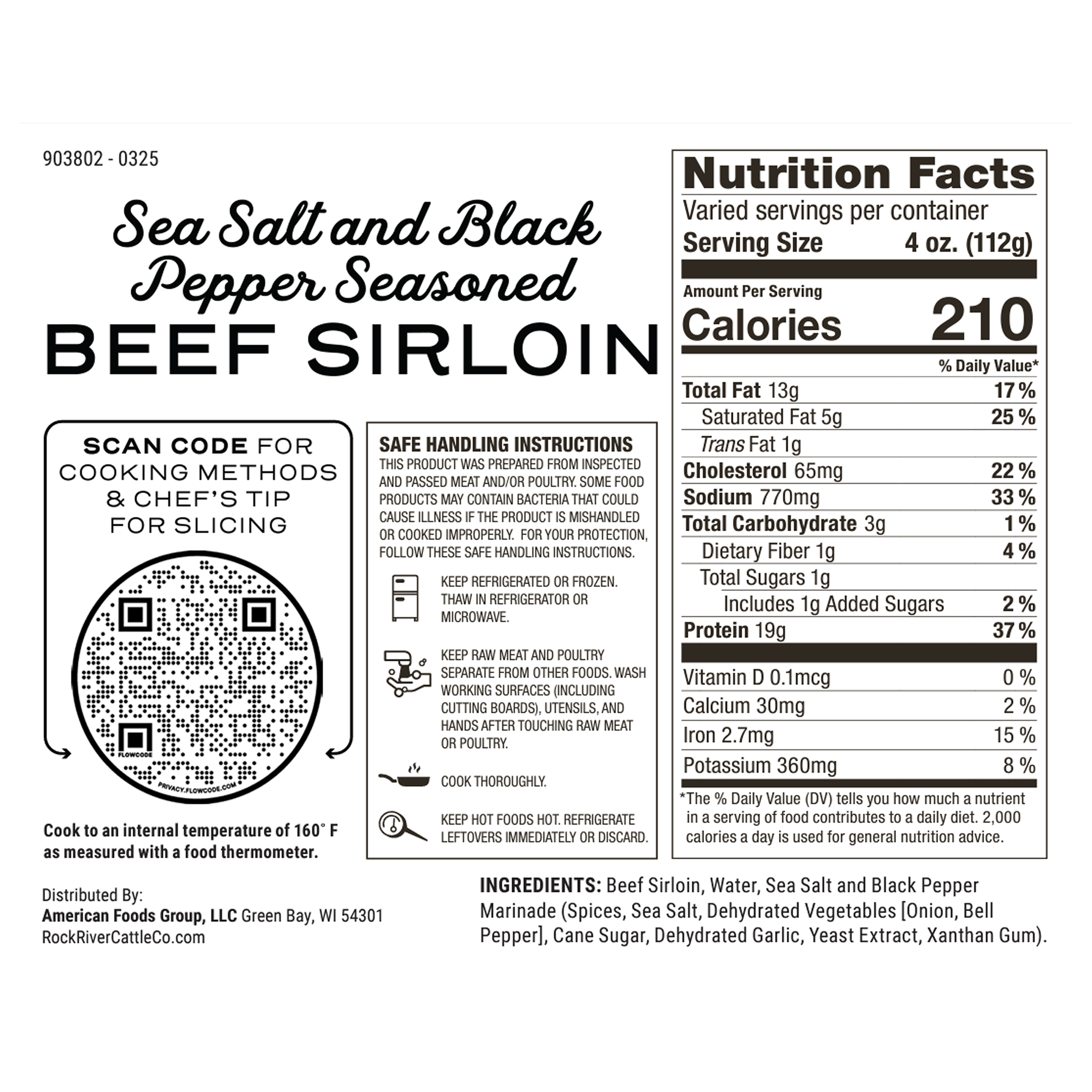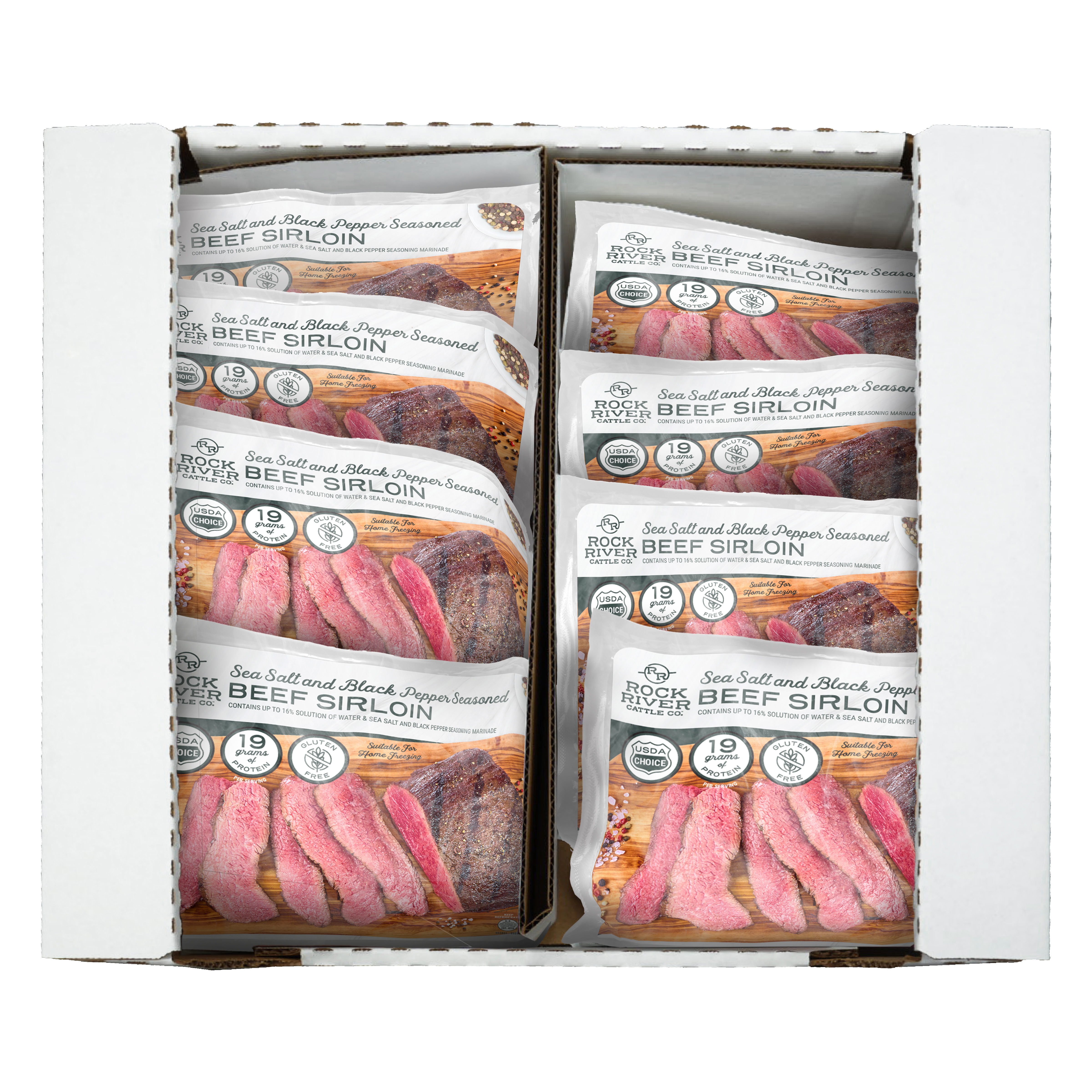 DESCRIPTION – This lean, tender cut of beef is seasoned to perfection with a premium blend of sea salt and black pepper. The sea salt enhances the beef's natural flavors, creating a savory foundation, while the black pepper adds a subtle warmth and spice. These simple yet extraordinary seasonings elevate every bite, enhancing this sirloin steak’s rich, juicy profile to deliver a delicious dining experience.