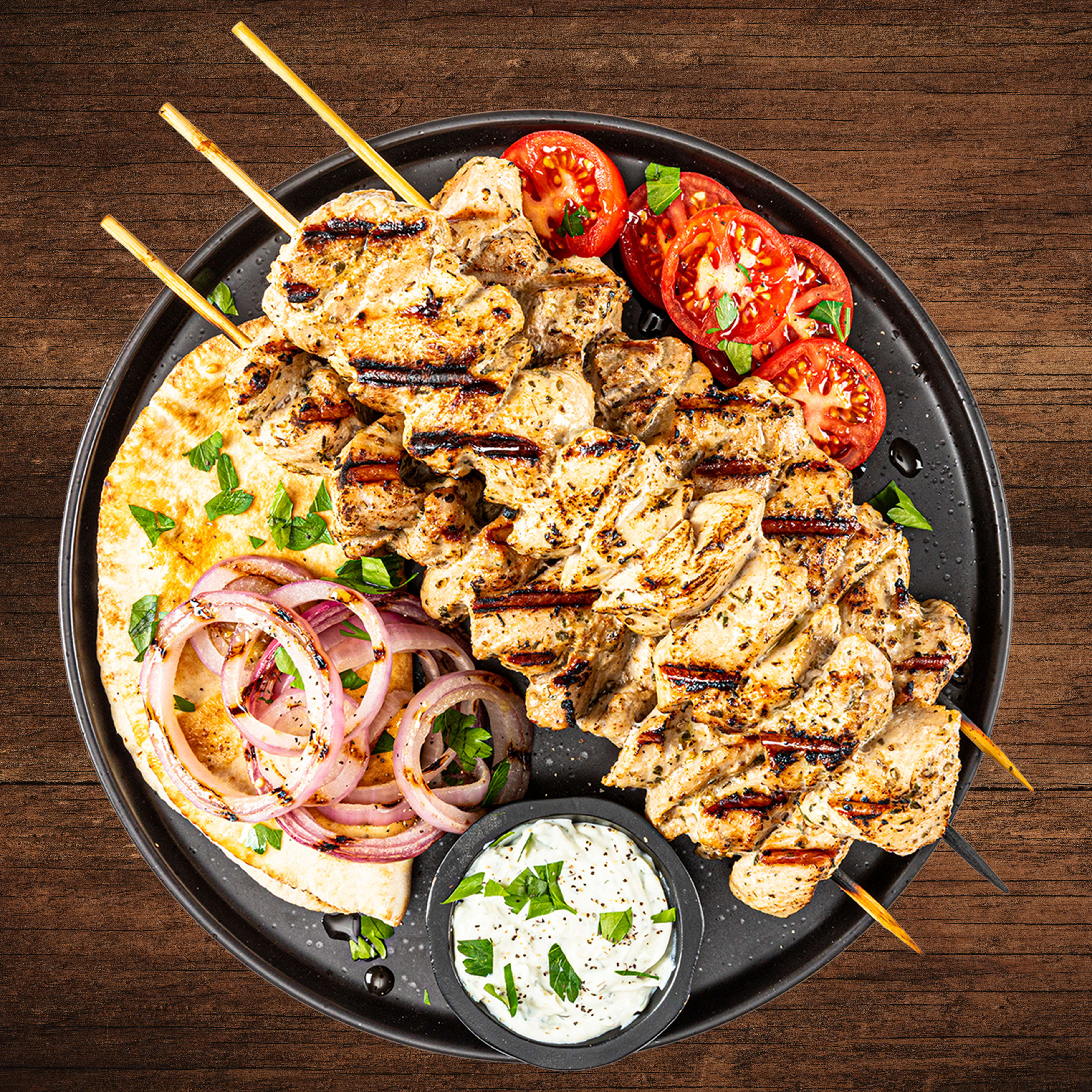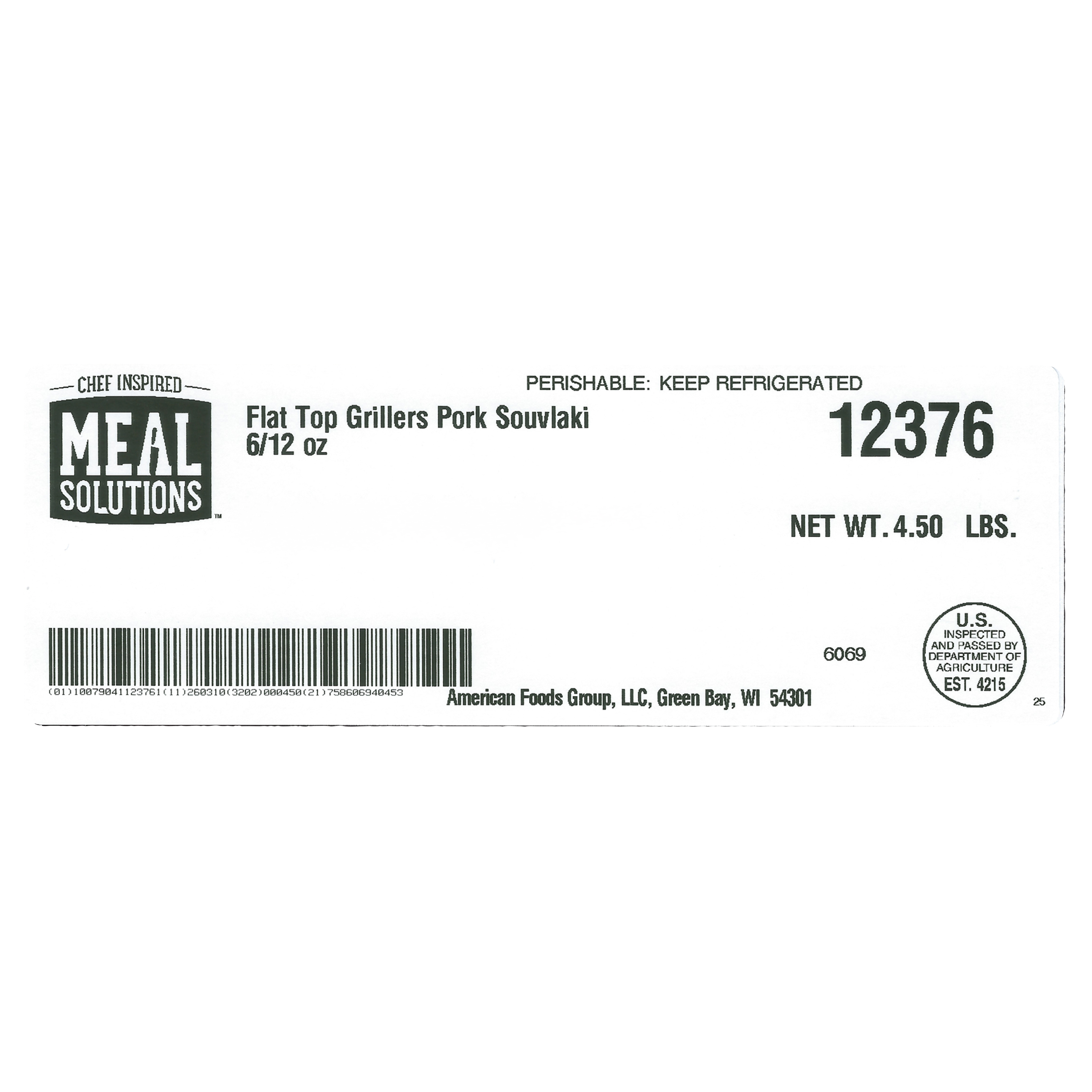 PORK SIRLOIN, WATER, OLIVE OIL, SOUVLAKI MARINADE (SALT, SUGAR, DEHYDRATED GARLIC, SPICES, MALTODEXTRIN, LEMON JUICE CONCENTRATE, PAPRIKA, NATURAL FLAVOR, CANOLA OIL). CONTAINS UP TO A 20% SOLUTION OF WATER, OLIVE OIL AND SOUVLAKI MARINADE. COATED WITH SEASONINGS.
