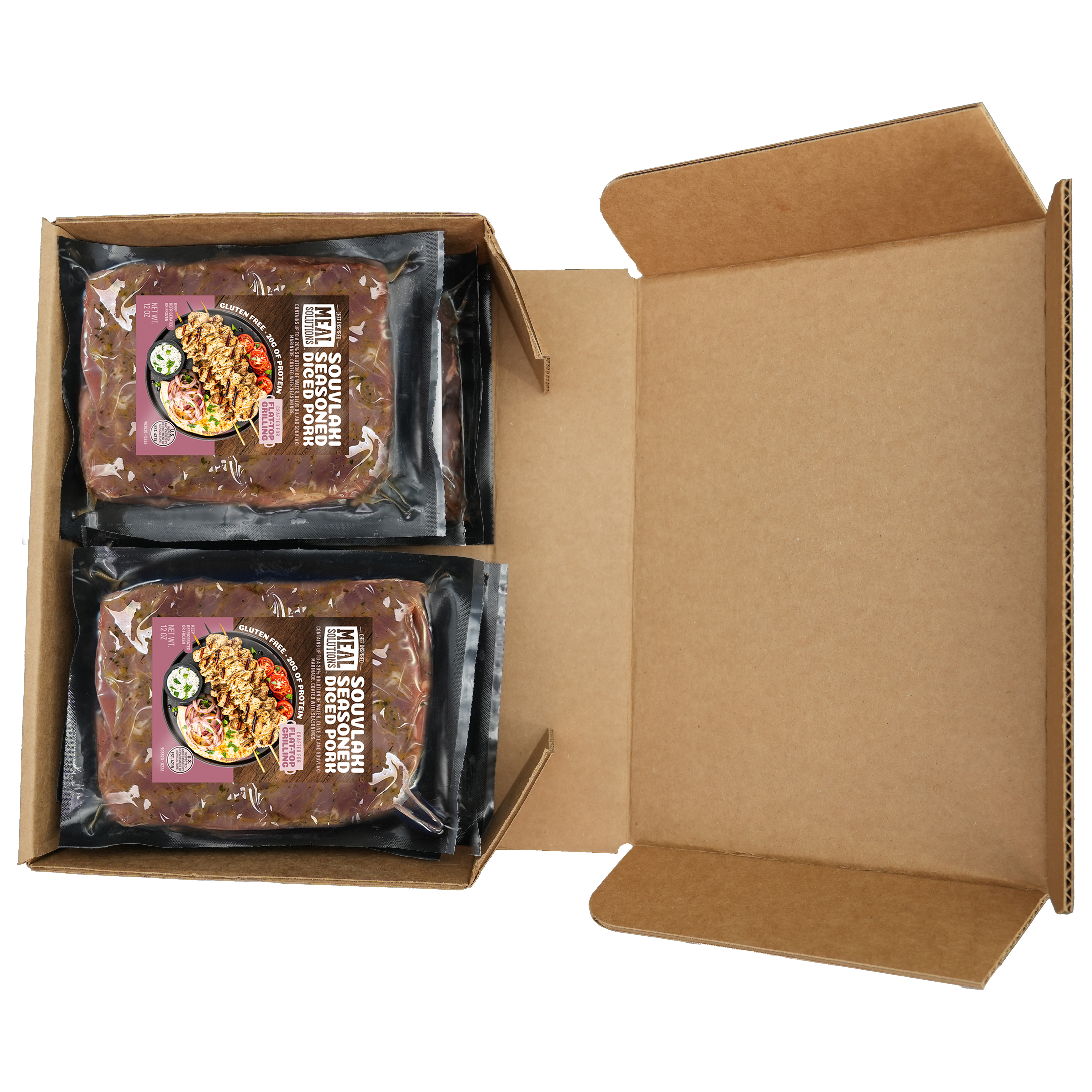 Fresh Souvlaki Seasoned Diced Pork, 6-12 Ounce Per 10 Pound Net Weight Master Case.