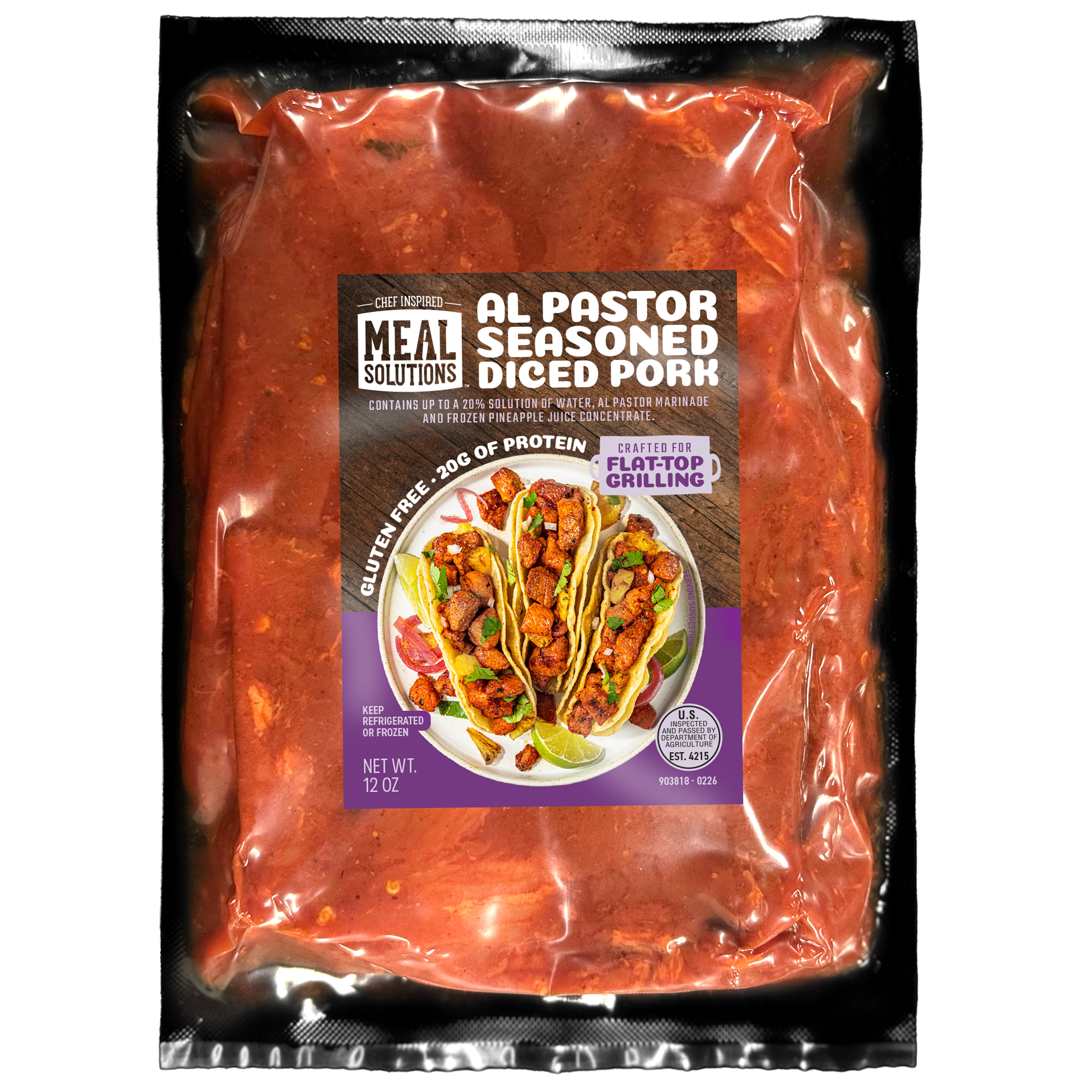 Meal Solutions Al Pastor Seasoned Diced Pork, 4-2.5 Pound Per 10 Pound Net Weight Master Case.