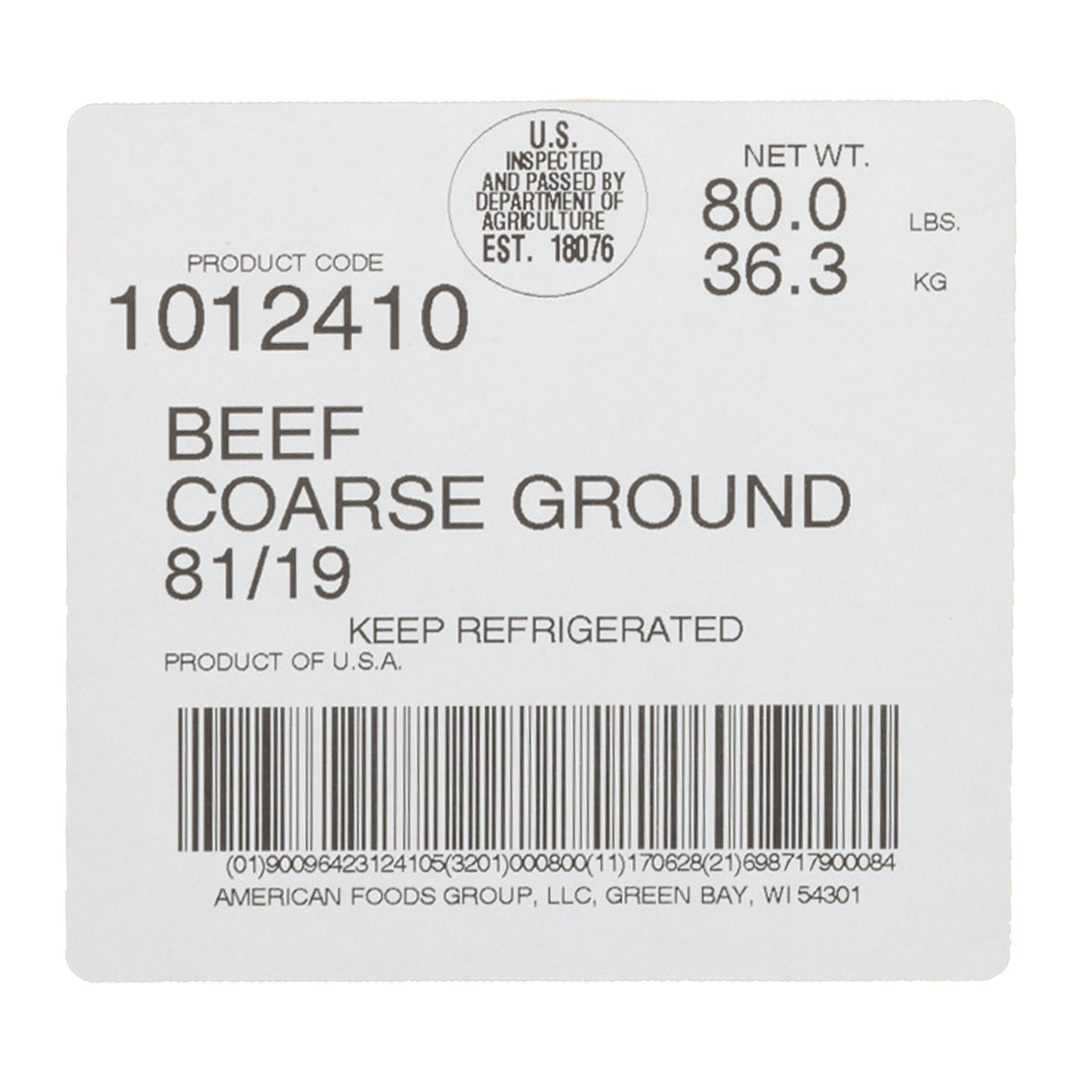 American Foods Group Fresh Coarse Ground Beef, 81 Percent Lean 19 Percent Fat, 8-10 Pound Chubs Per 80 Pound Average Weight Master Case