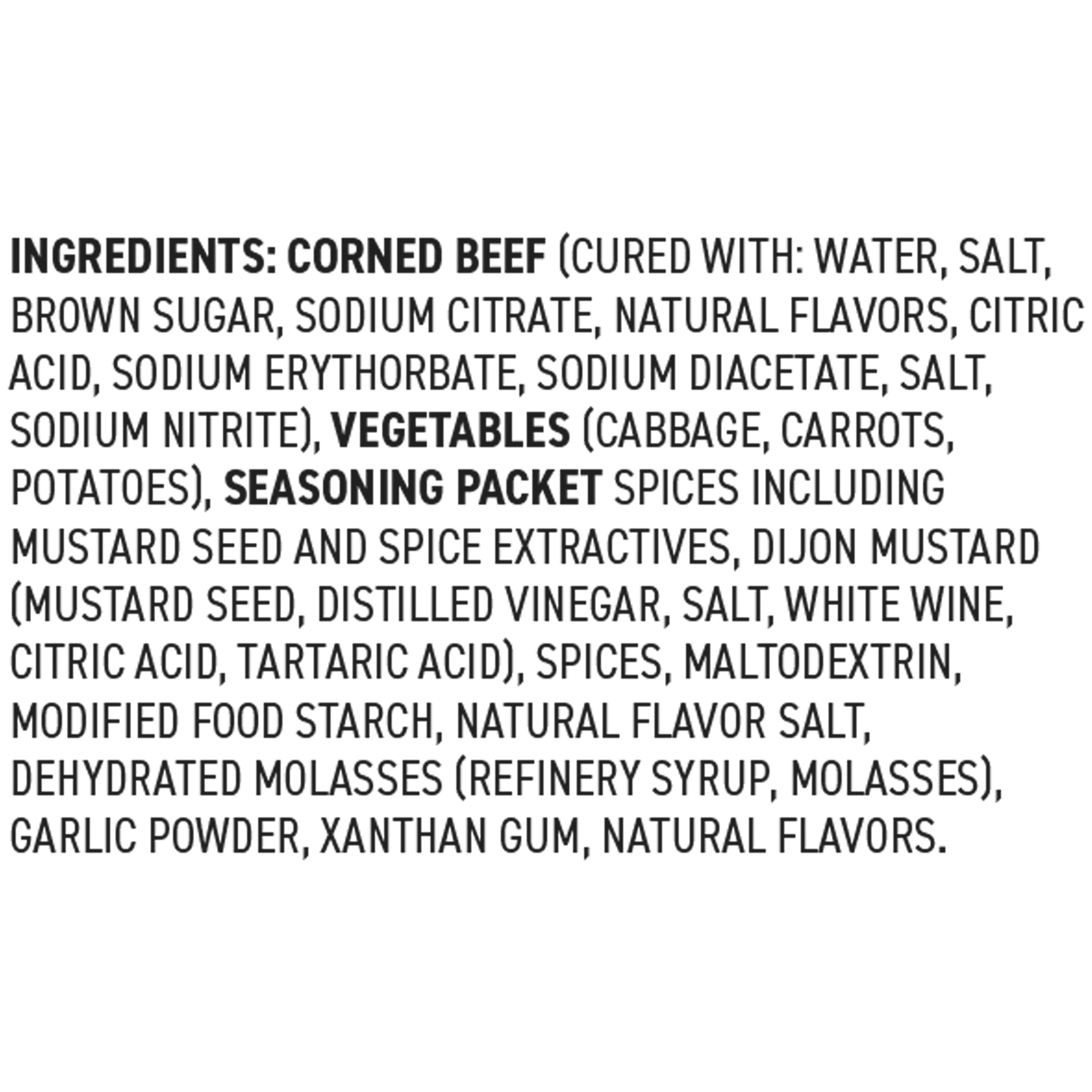 Corned Beef (Cured With: Water, Salt, Brown Sugar, Sodium Citrate, Natural Flavors, Citric Acid, Sodium Erythorbate, Sodium Diacetate, Salt, Sodium Nitrite), Vegetables (Cabbage, Carrots, Potatoes), Seasoning Packet Spices Including Mustard Seed And Spice Extractives, Dijon Mustard (Mustard Seed, Distilled Vinegar, Salt, White Wine, Citric Acid, Tartaric Acid), Spices, Maltodextrin, Modified Food Starch, Natural Flavor Salt, Dehydrated Molasses (Refinery Syrup, Molasses), Garlic Powder, Xanthan Gum, Natural Flavors.