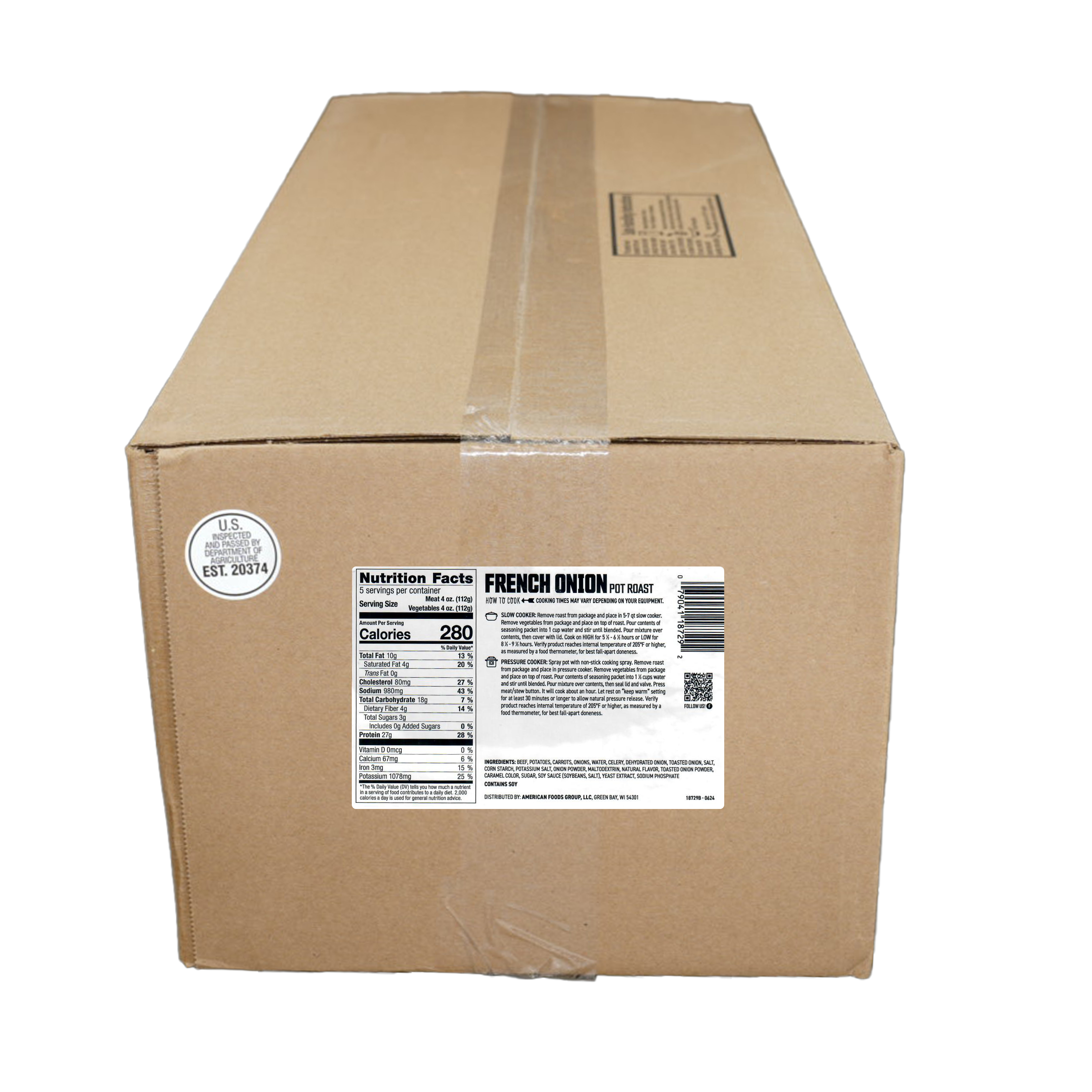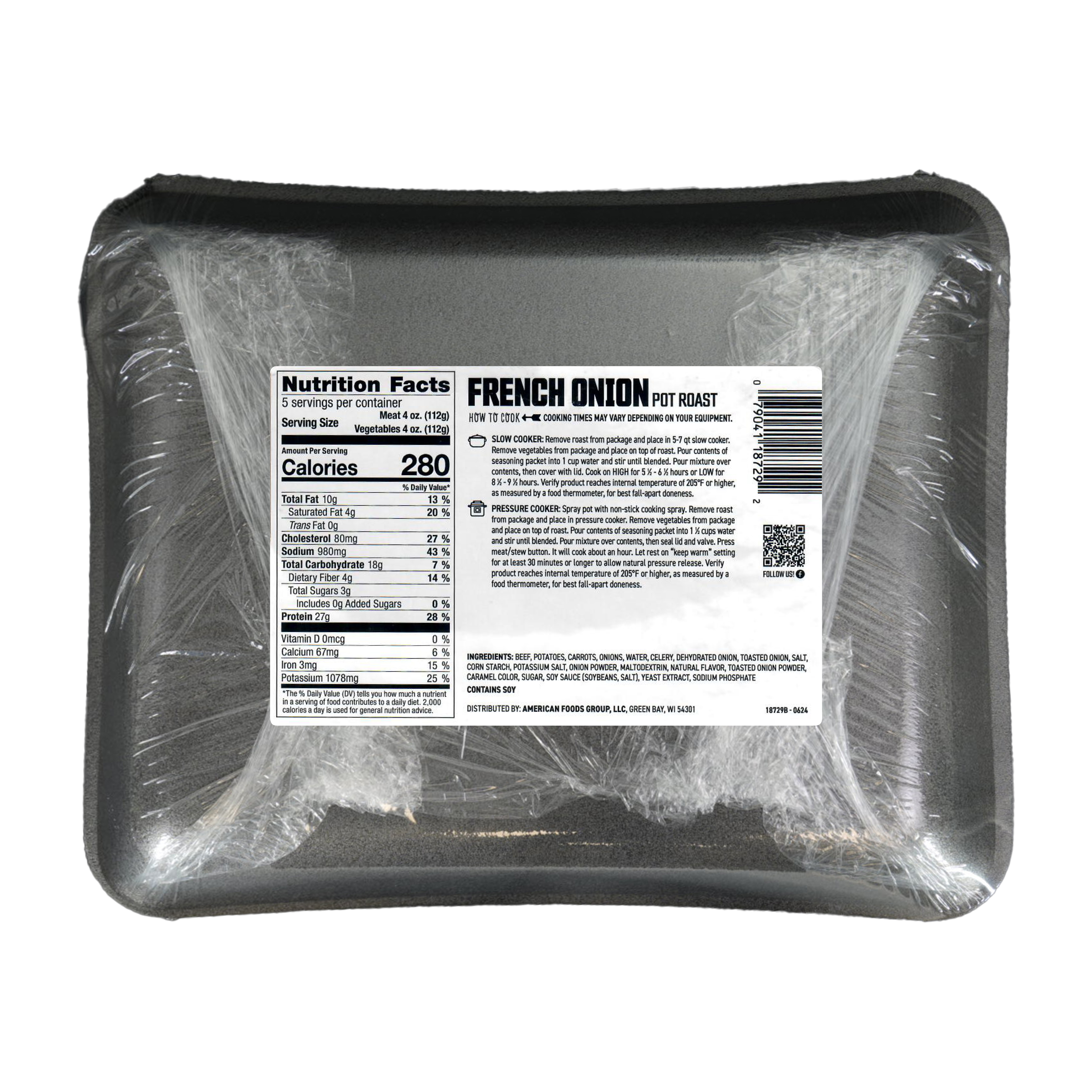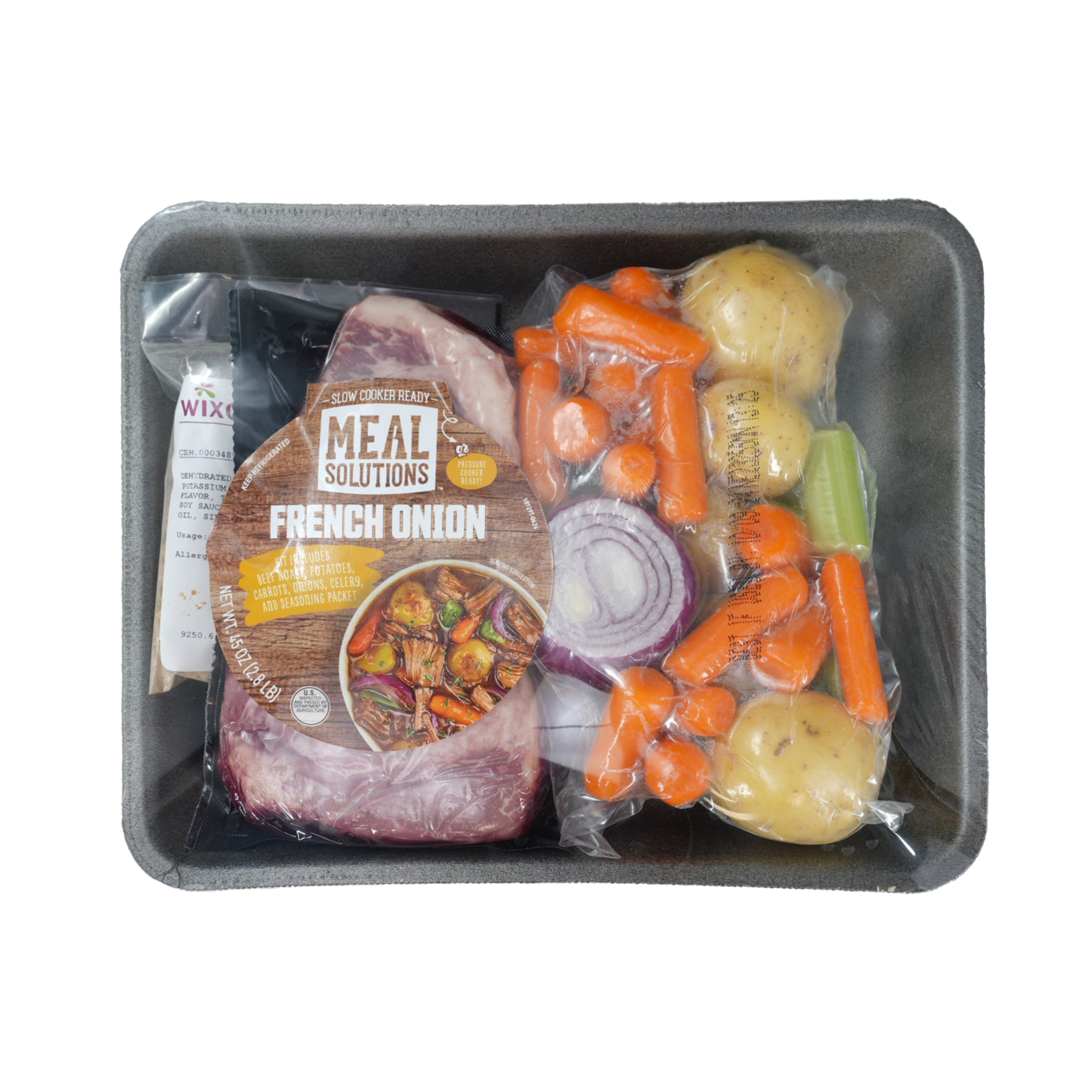 Meal Solutions French Onion Beef Meal Kits, 4-45 Ounce Meal Kits Per 11.1875 Net Weight Master Case. Kit Includes, 22 Ounces Beef Bottom Flat Roast, 21 Ounces Vegetable Mix, 2 Ounce Seasoning Packet.