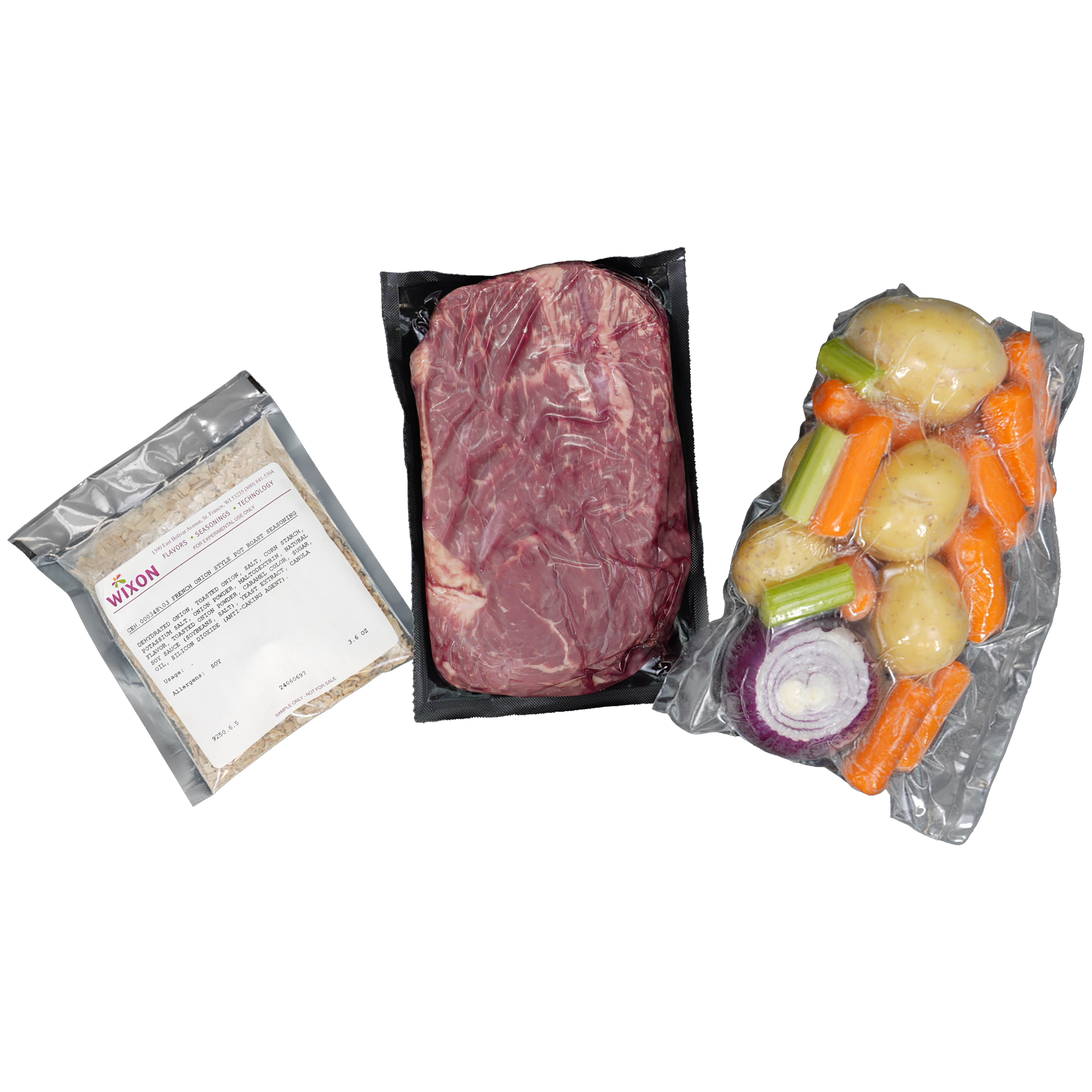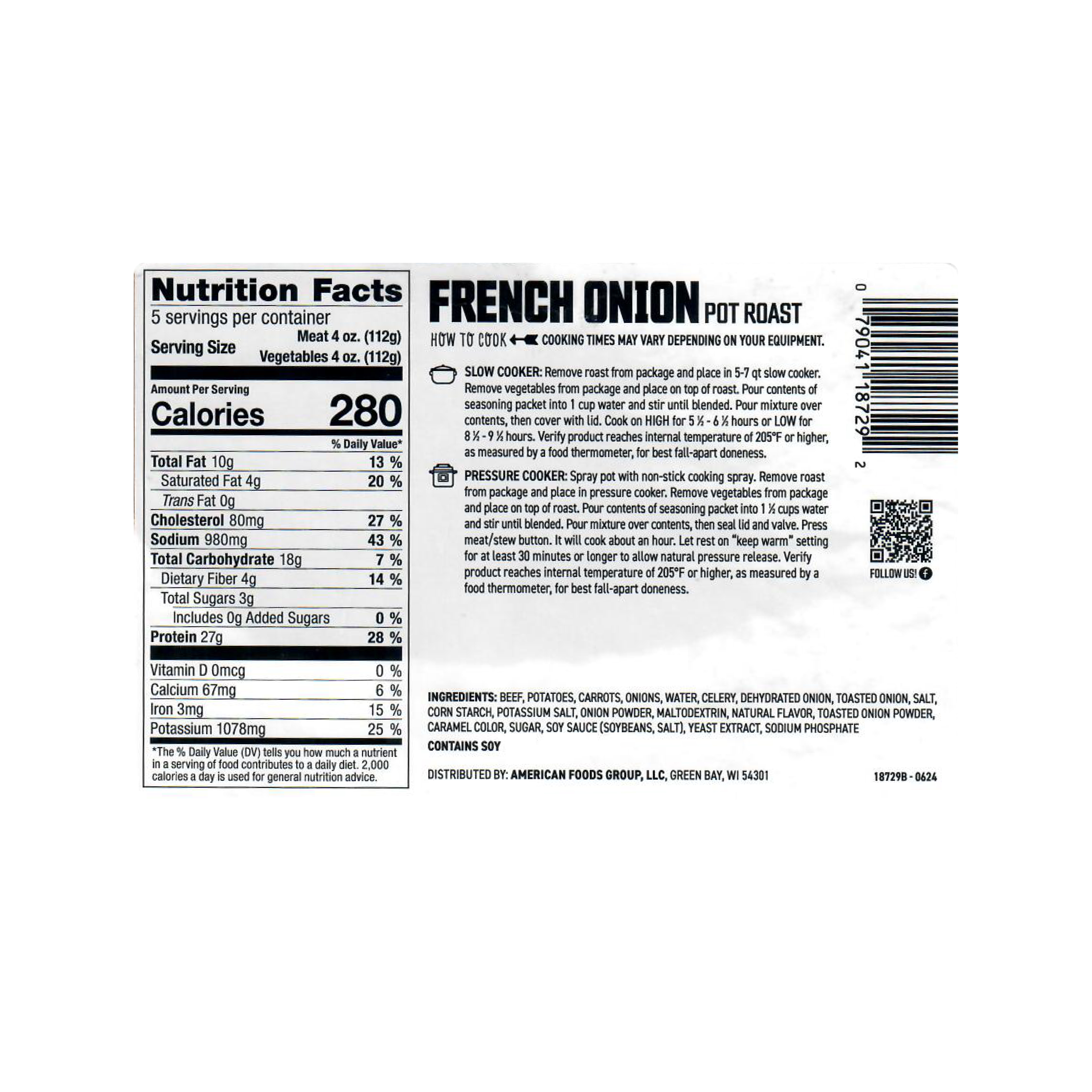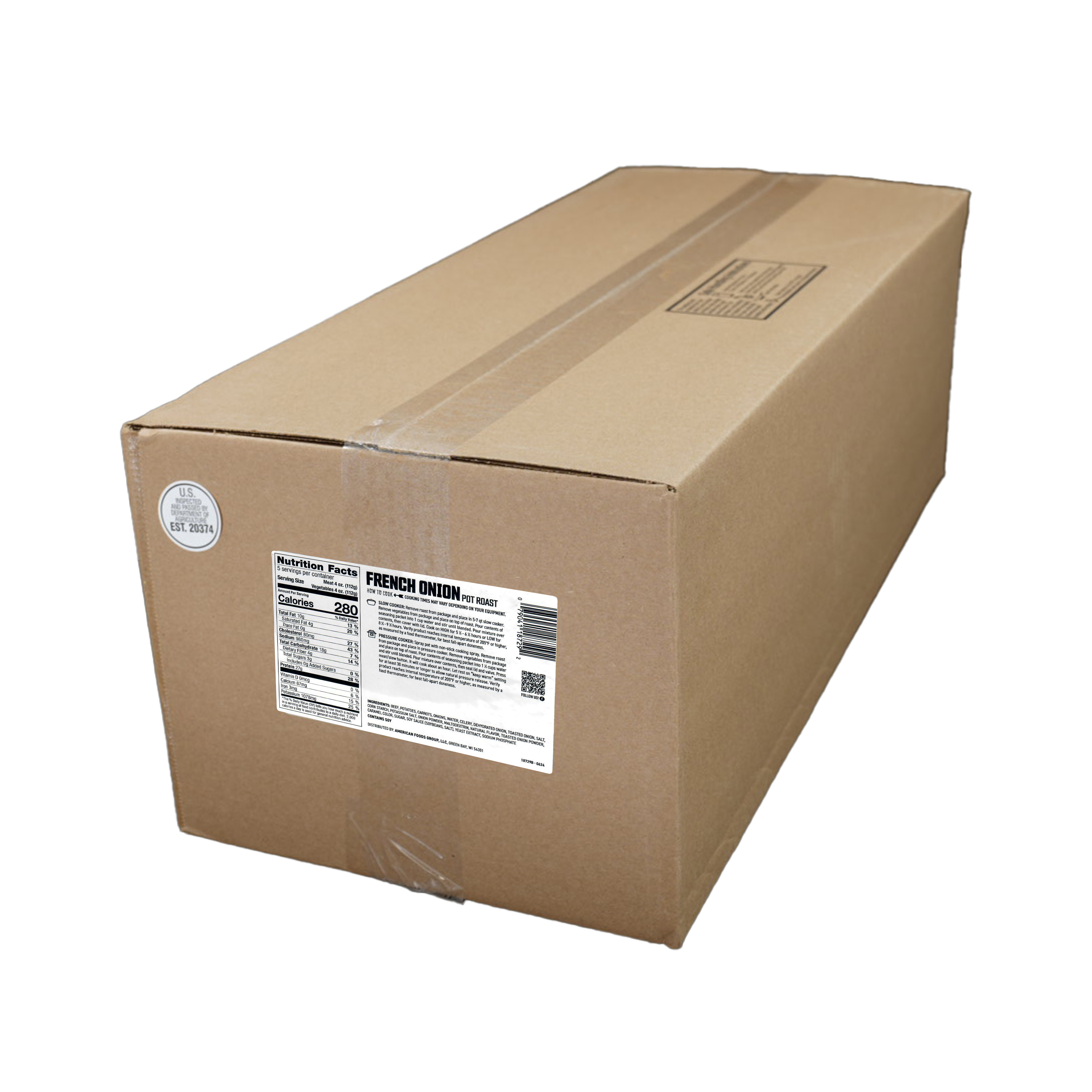 Meal Solutions French Onion Beef Meal Kits, 4-45 Ounce Meal Kits Per 11.1875 Net Weight Master Case. Kit Includes, 22 Ounces Beef Bottom Flat Roast, 21 Ounces Vegetable Mix, 2 Ounce Seasoning Packet.