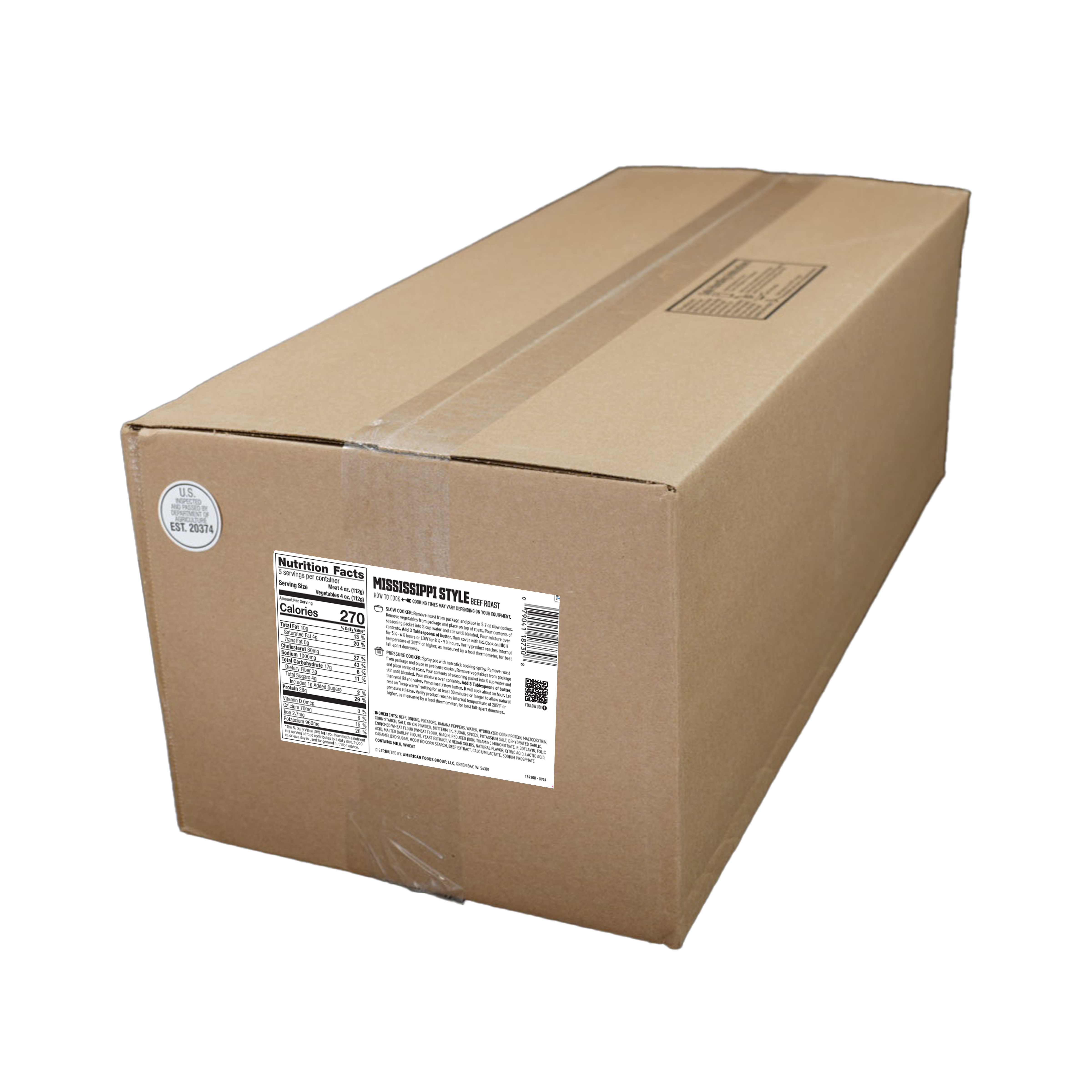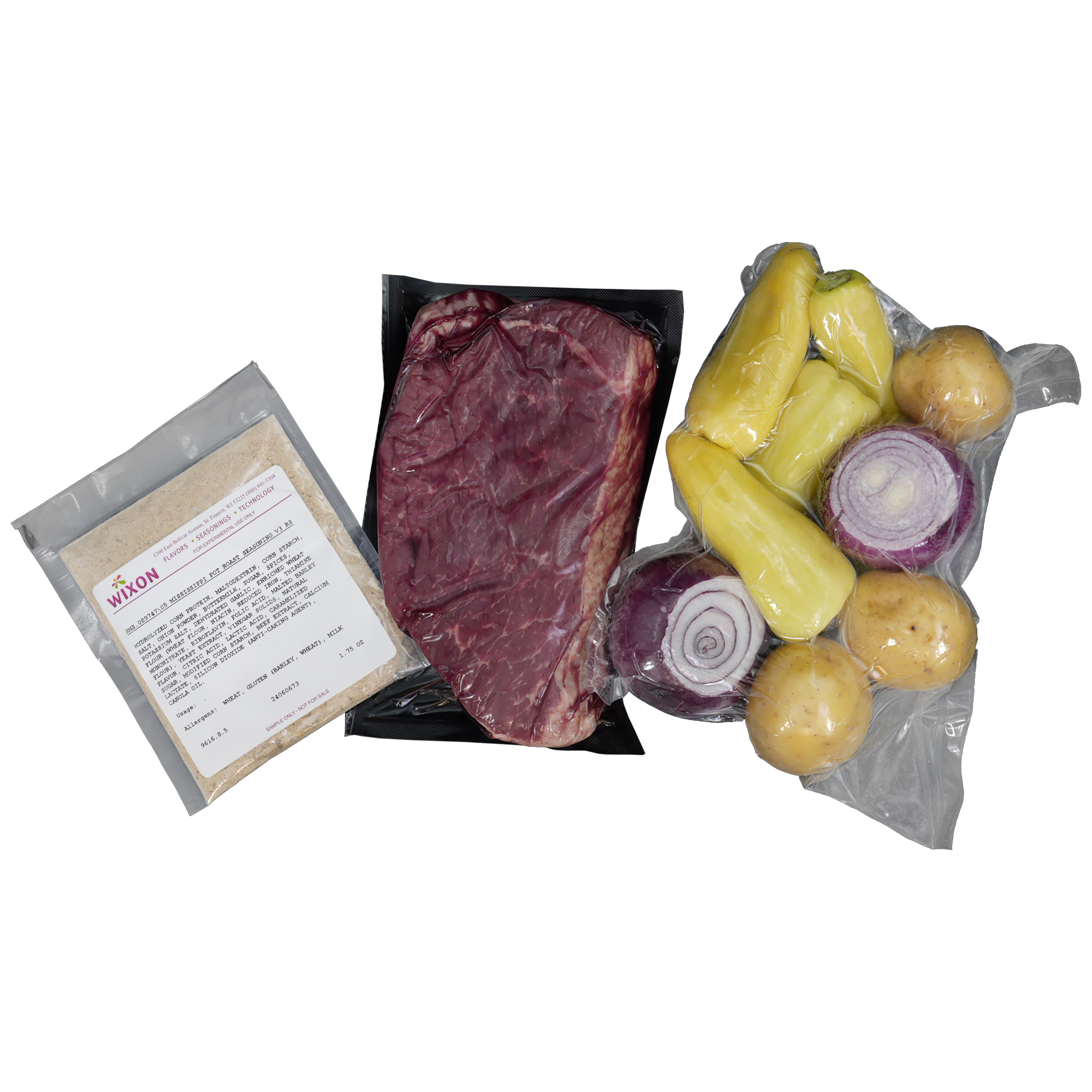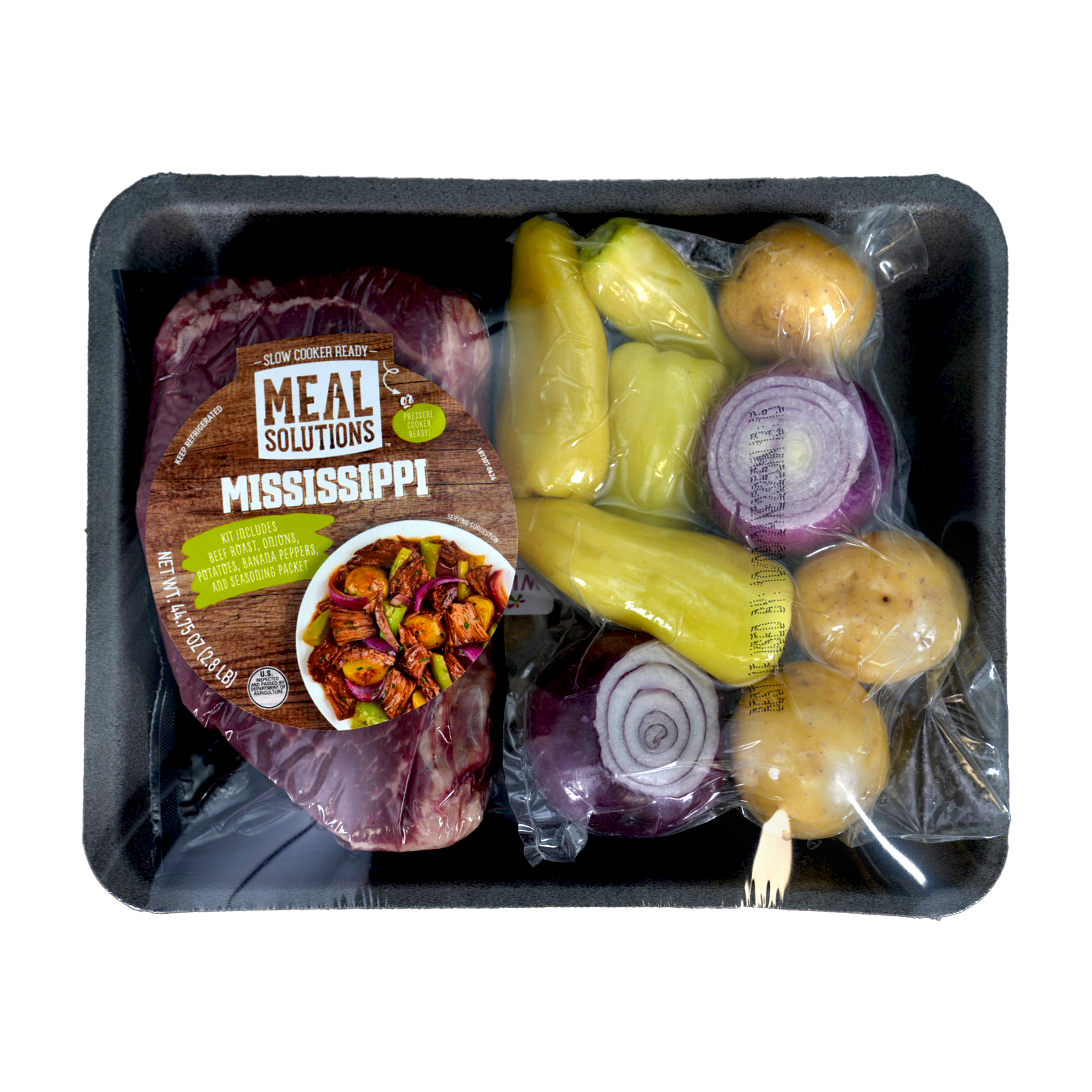 Meal Solutions Mississippi Style Beef Meal Kits, 4-44.75 Ounce Meal Kits Per 11.1875 Net Weight Master Case. Kit Includes, 22 Ounces Beef Bottom Flat Roast, 21 Ounces Vegetable Mix, 1.75 Ounce Seasoning Packet.