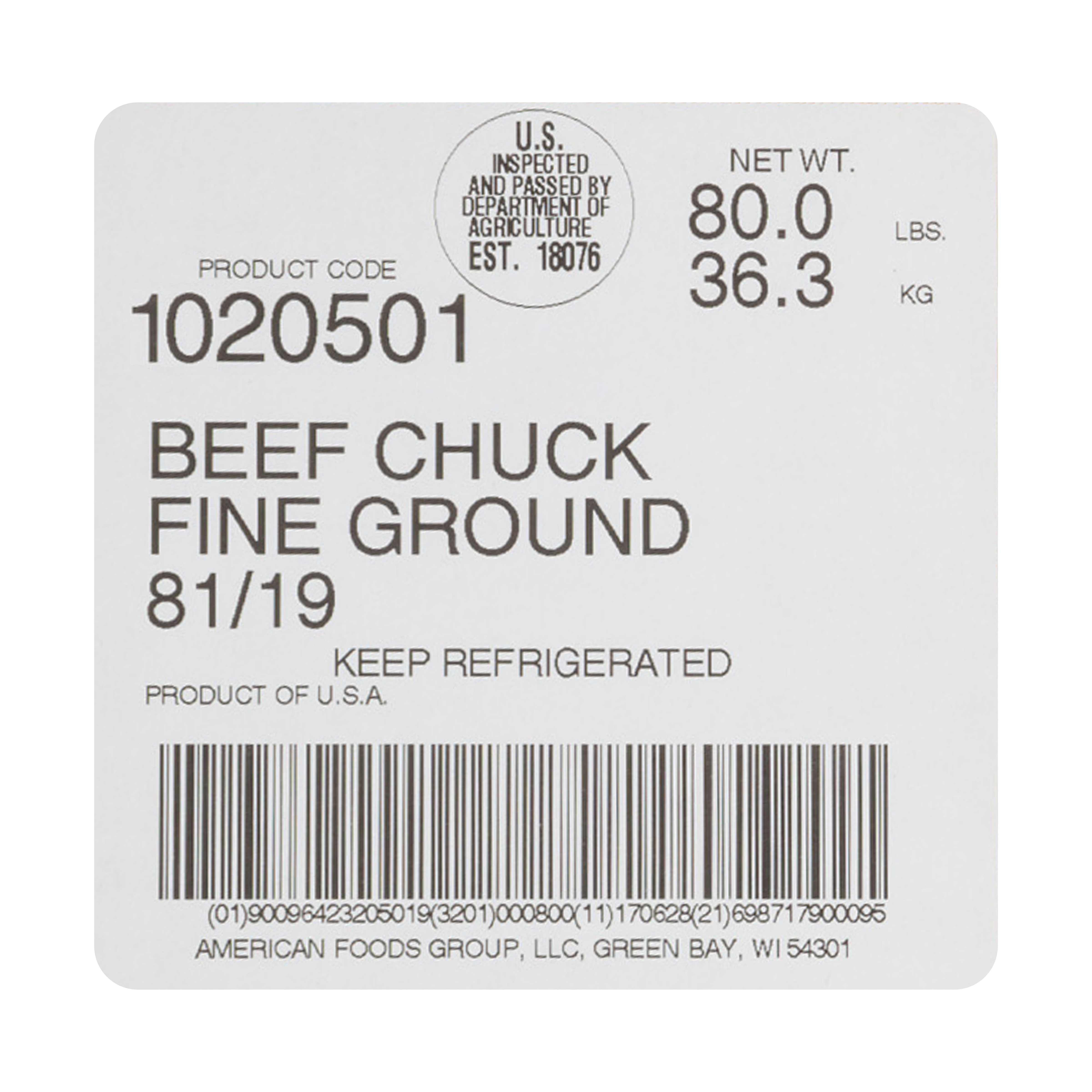 American Foods Group Fresh Fine Ground Beef Chuck, 81 Percent Lean 19 Percent Fat, 8-10 Pound Chubs Per 80 Pound Average Weight Master Case