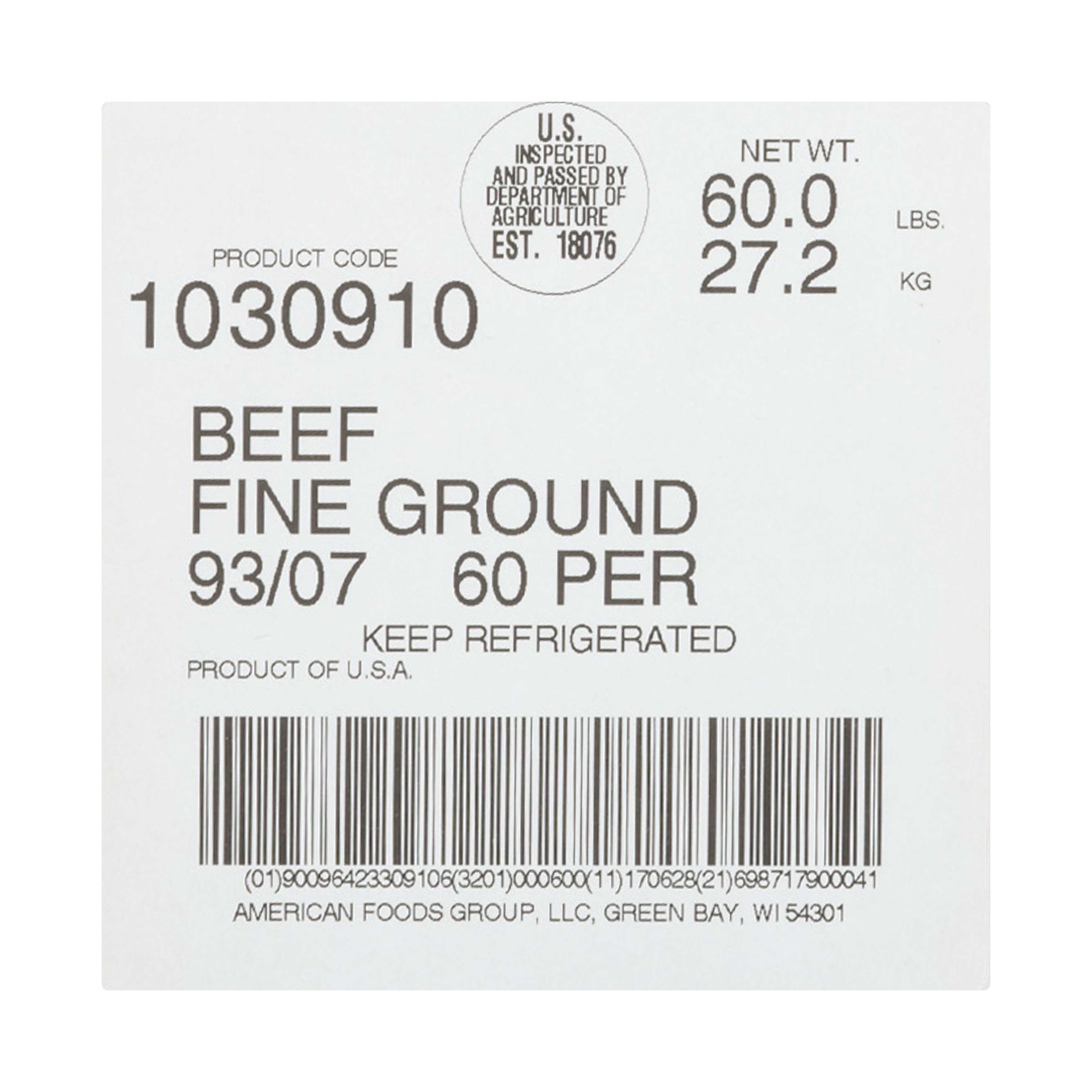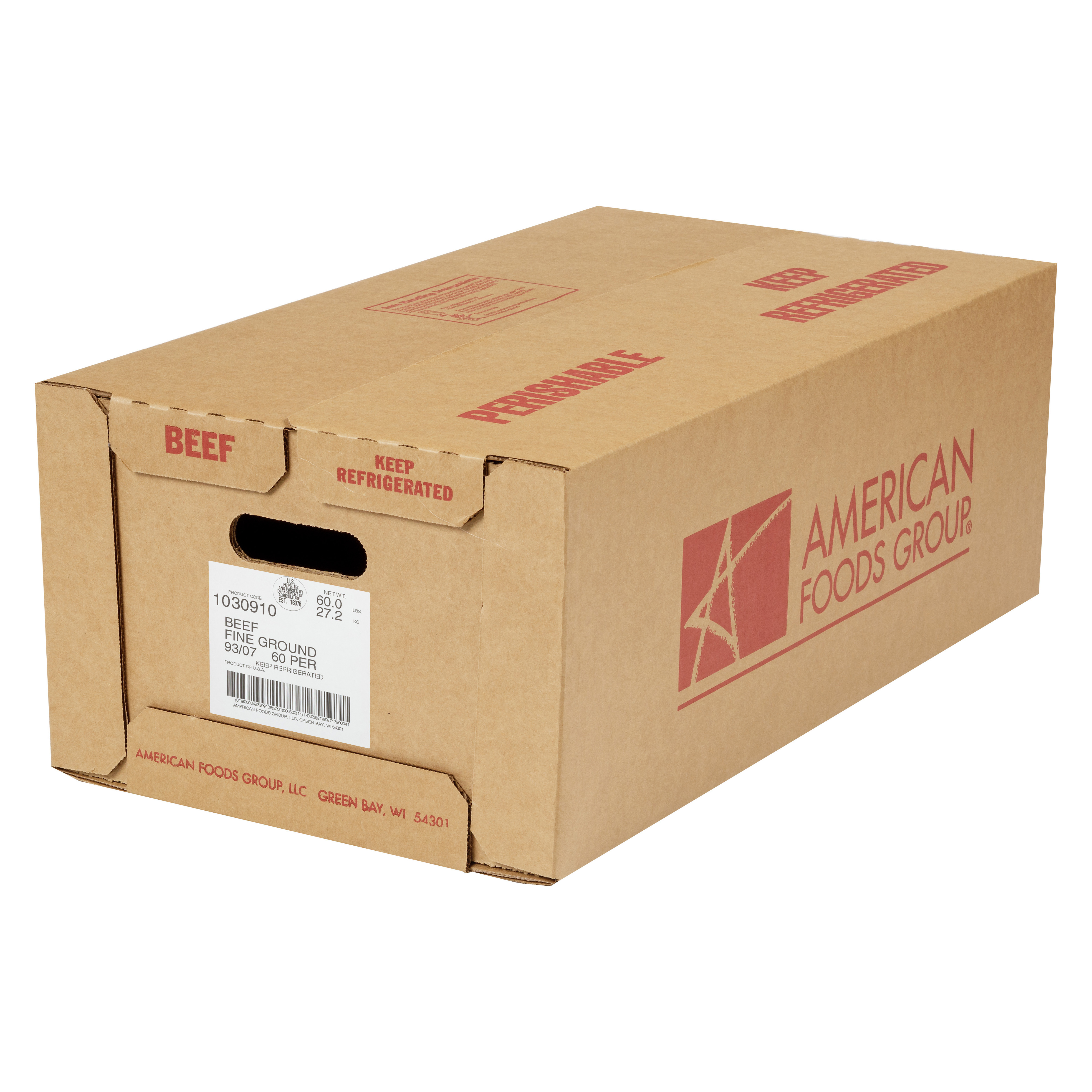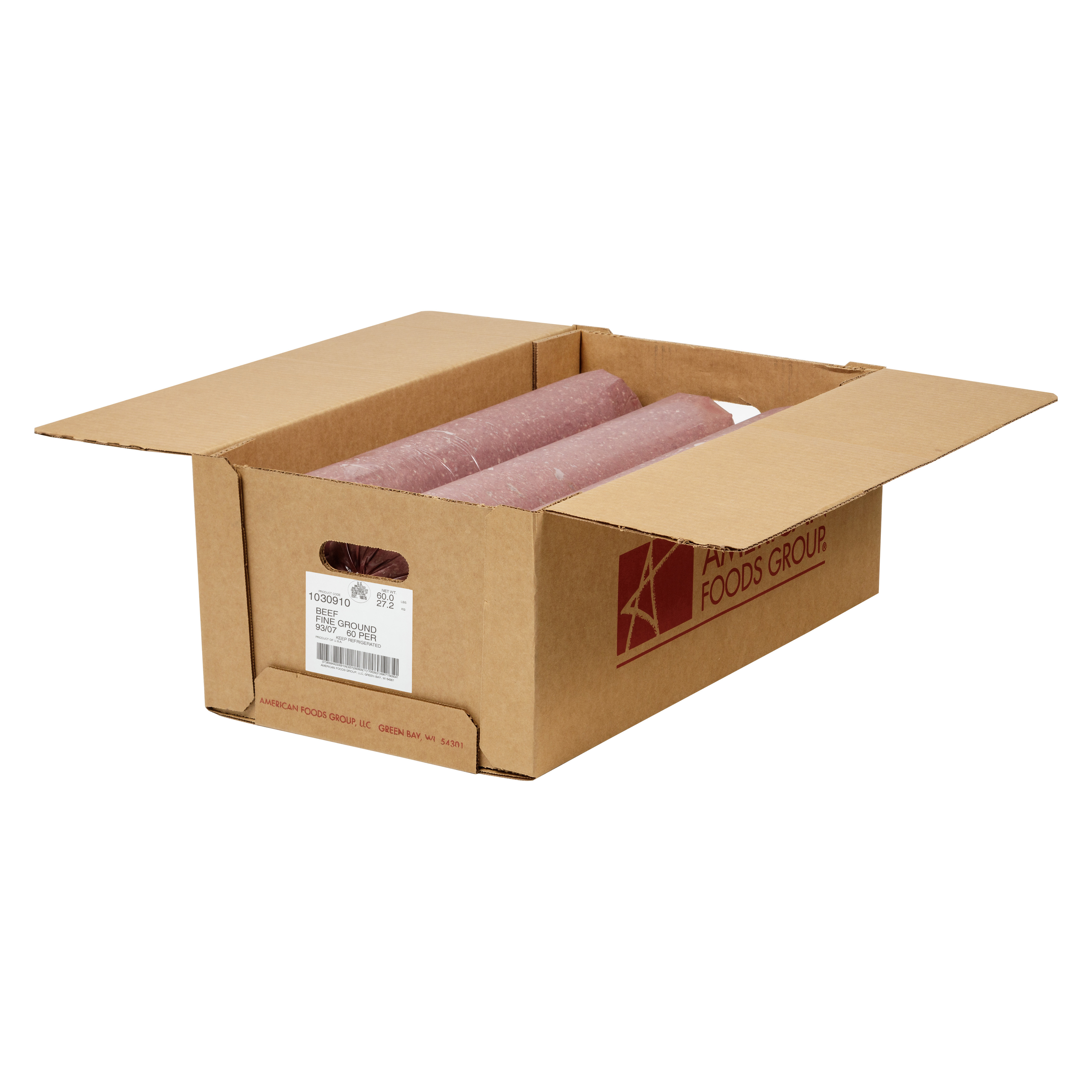 American Foods Group Fresh Fine Ground Beef, 93 Percent Lean 7 Percent Fat, 6-10 Pound Chubs Per 60 Pound Average Weight Master Case