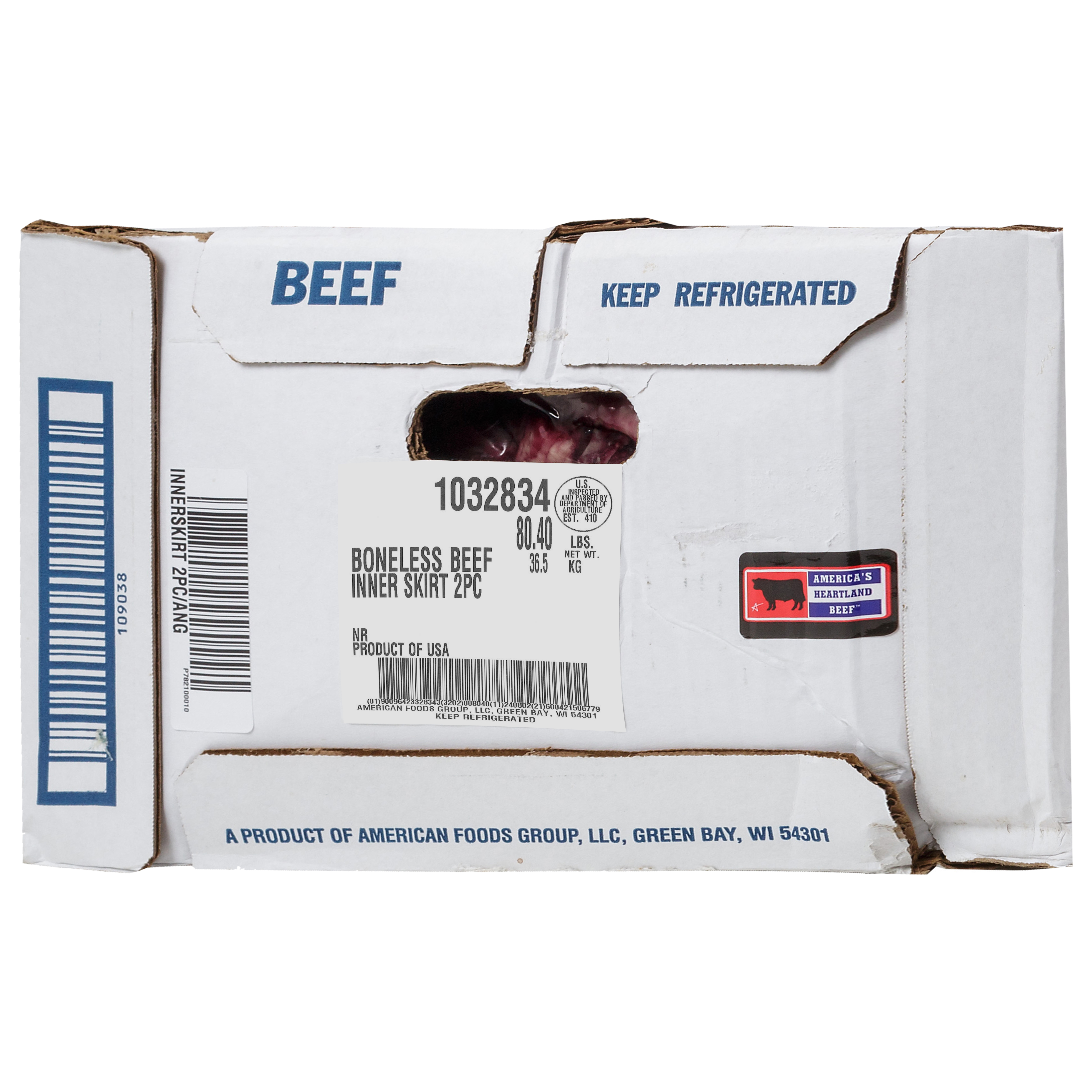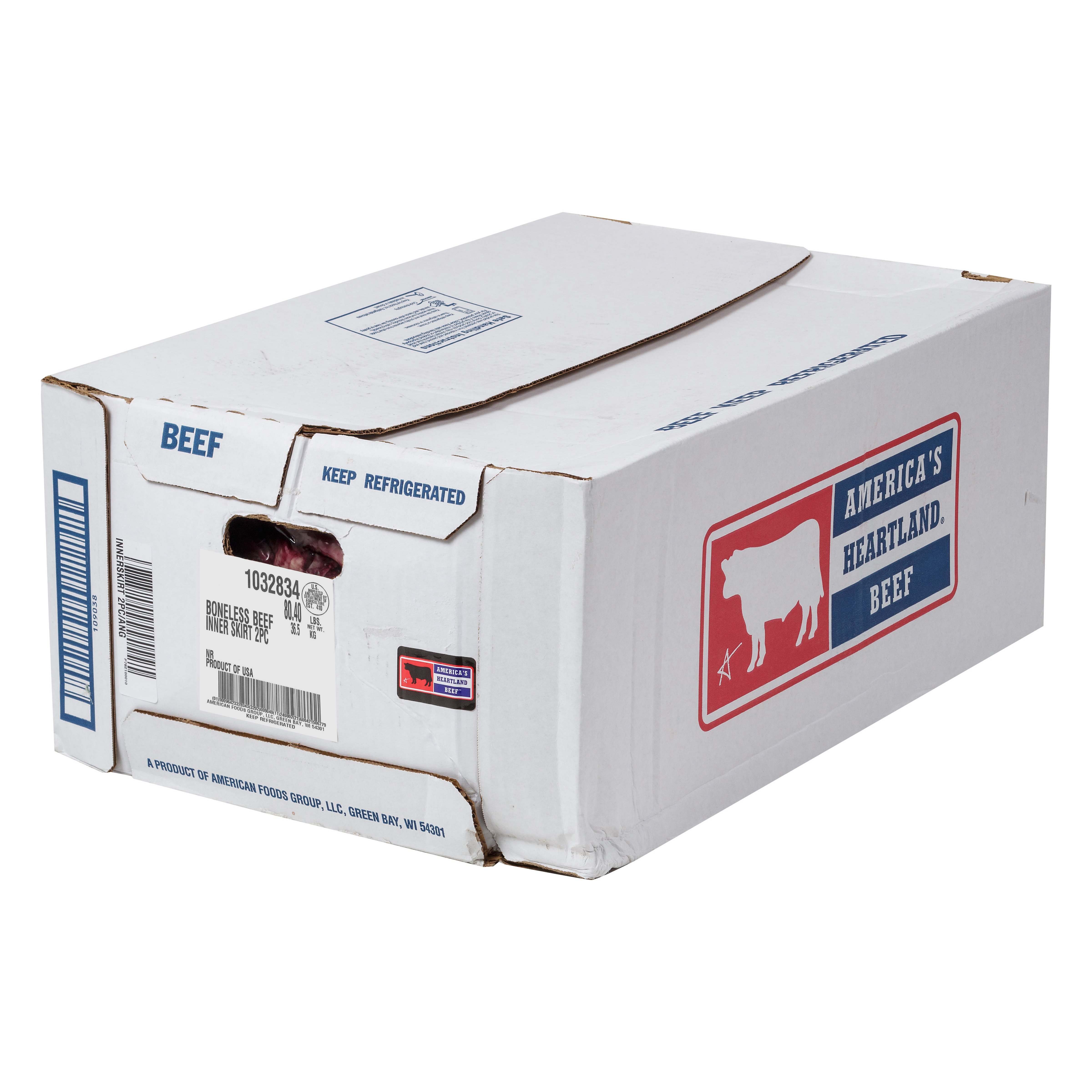 America’s Heartland Fresh Boneless Beef Inner Skirt, No Roll Grade, 14 Bags Per 68 Pound Average Weight Master Case, 2 Inner Skirts Per Bag