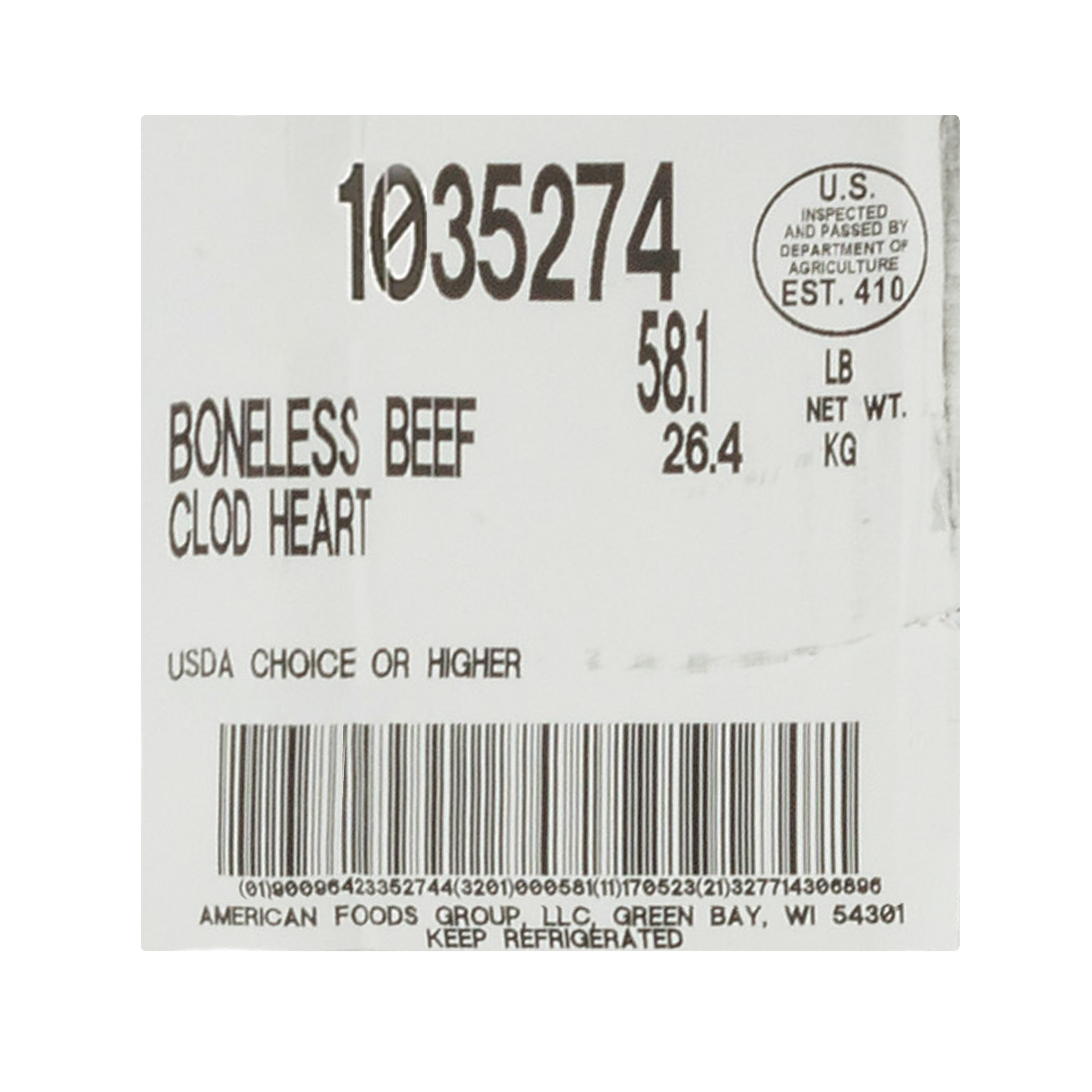 DESCRIPTION – The America's Heartland Boneless Beef Clod Heart is 100% Choice Grade beef and contains no additives.