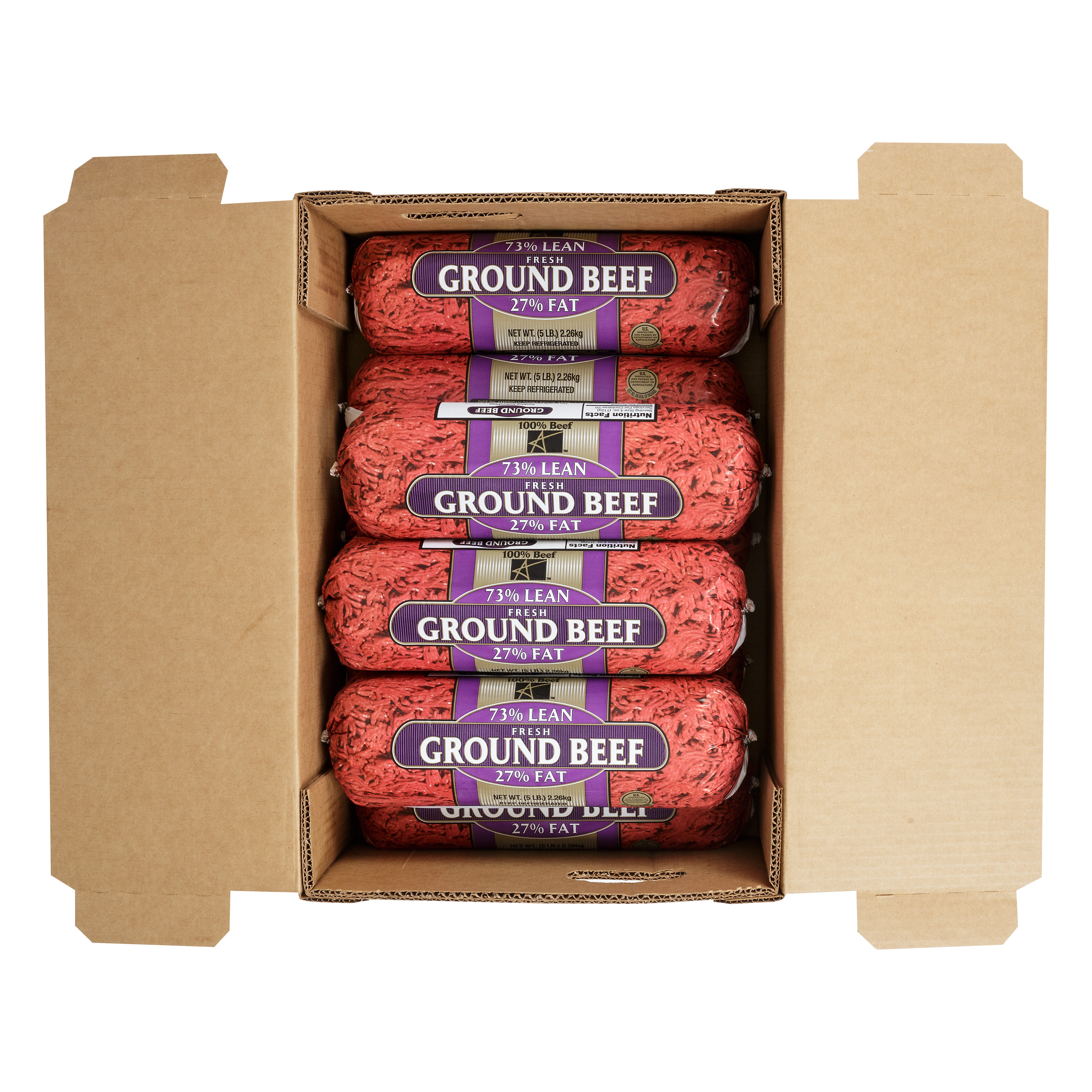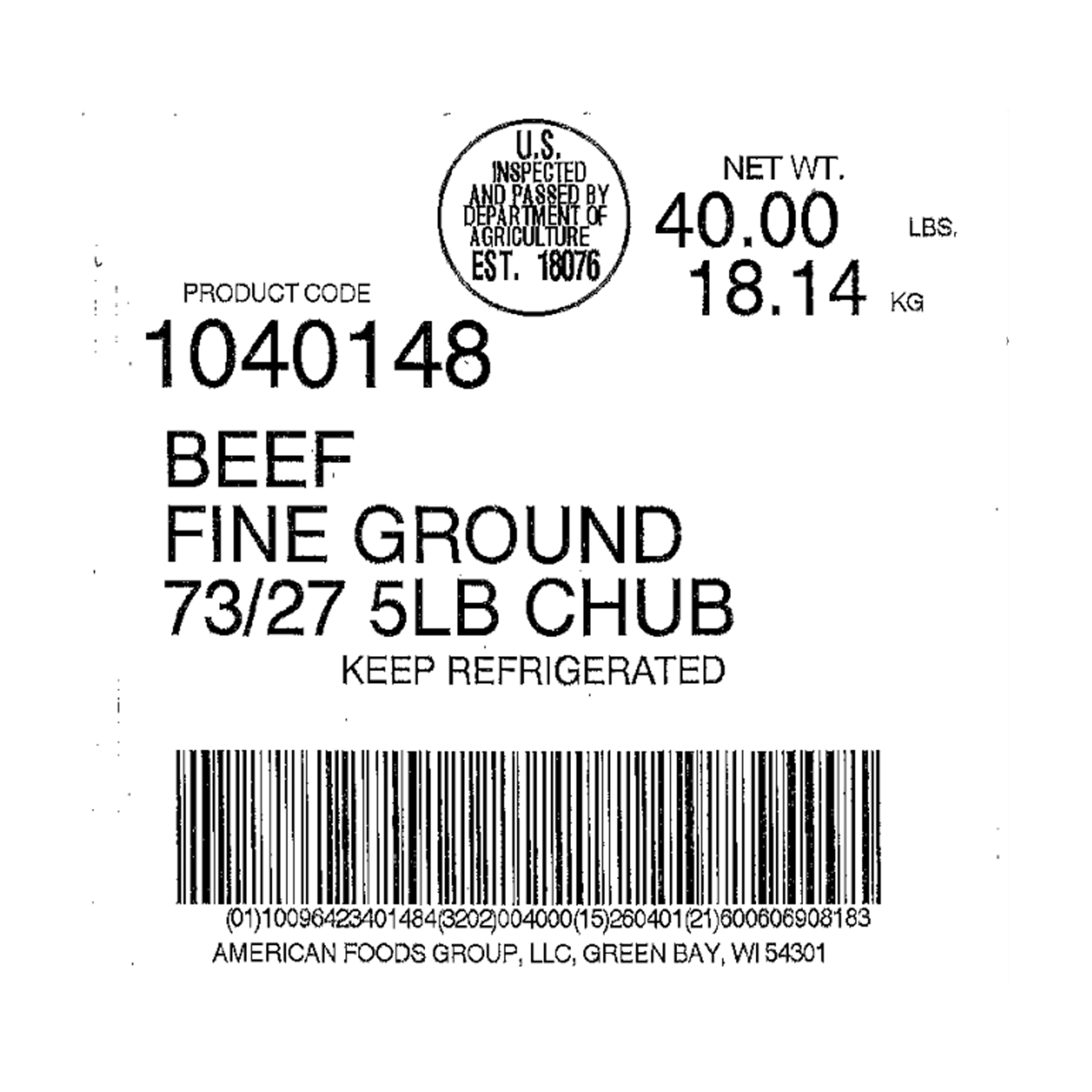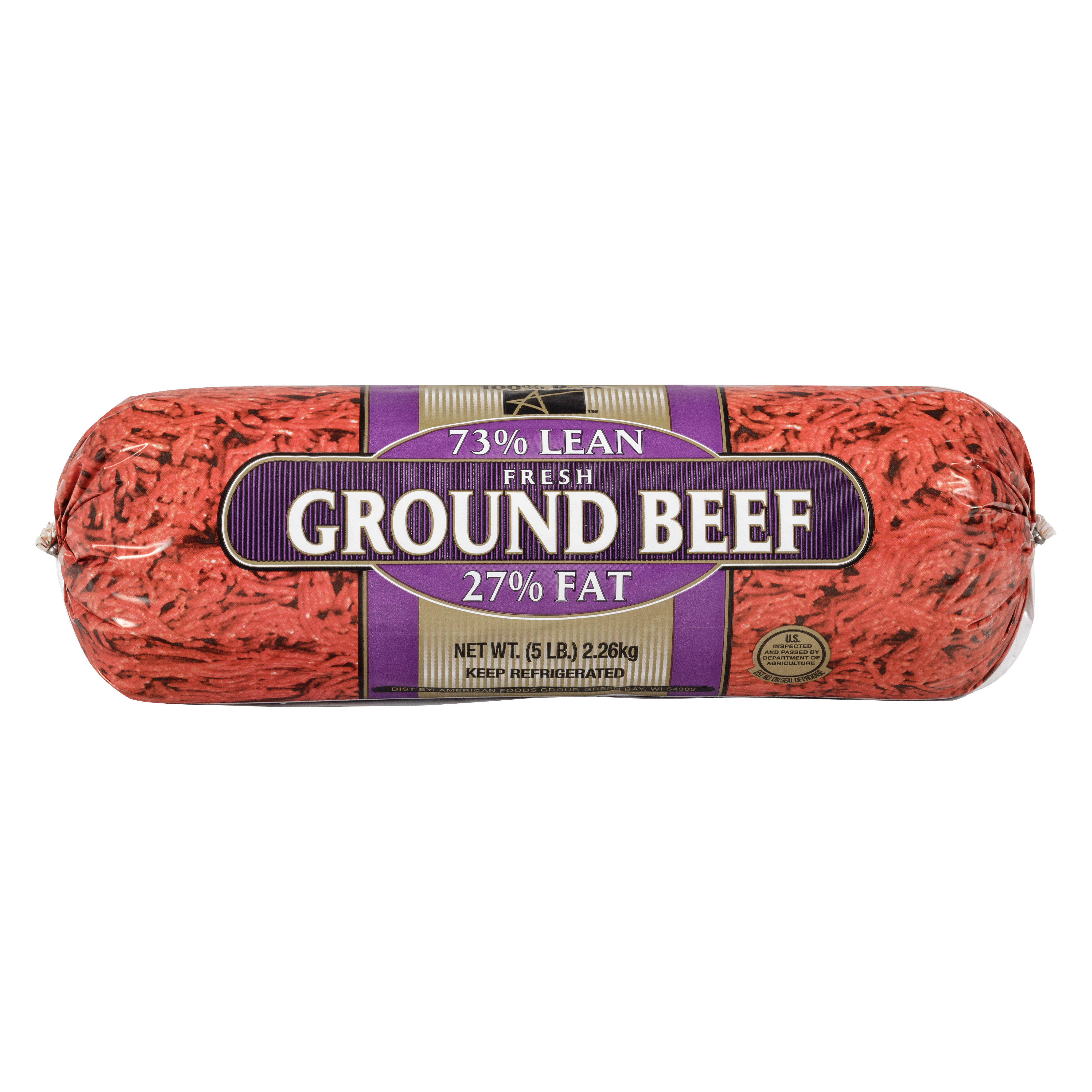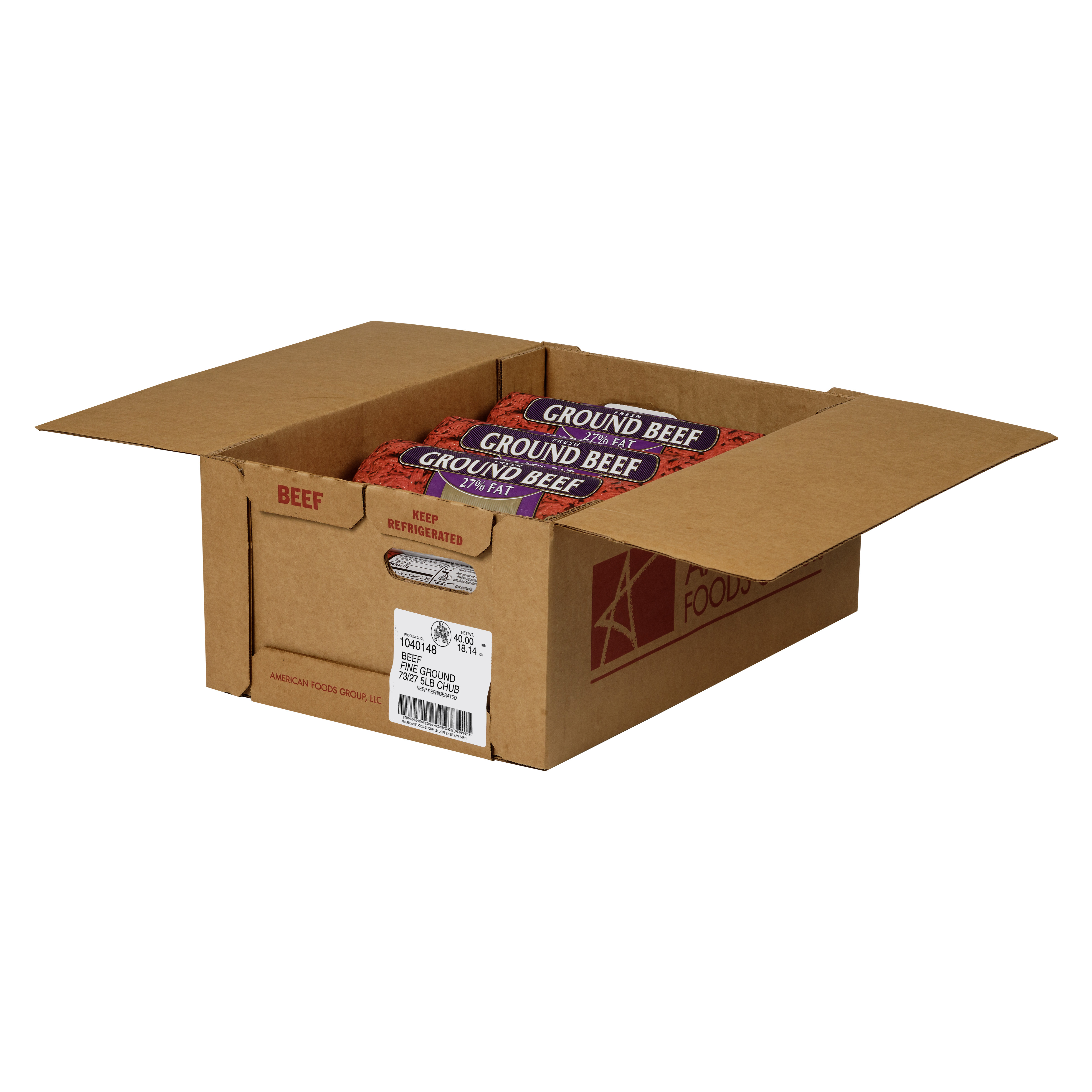 American Foods Group Fresh Fine Ground Beef, 73 Percent Lean 27 Percent Fat, 8-5 Pound Chubs Per 40 Pound Net Weight Master Case