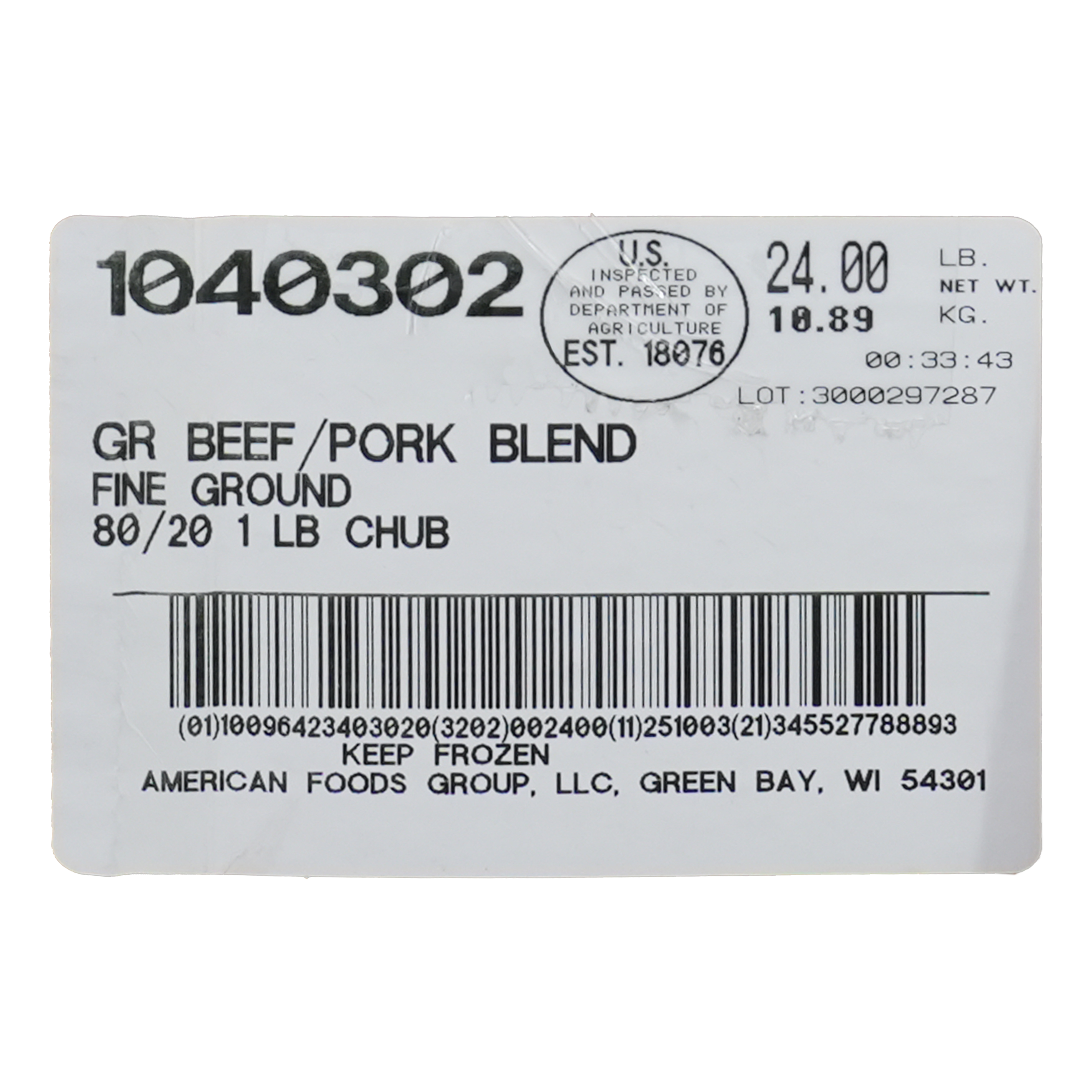 American Foods Group Fresh Fine Ground Beef/Pork Blend, 80 Percent Lean 20 Percent Fat, 24-1 Pound Chubs Per 24 Pound Net Weight Master Case