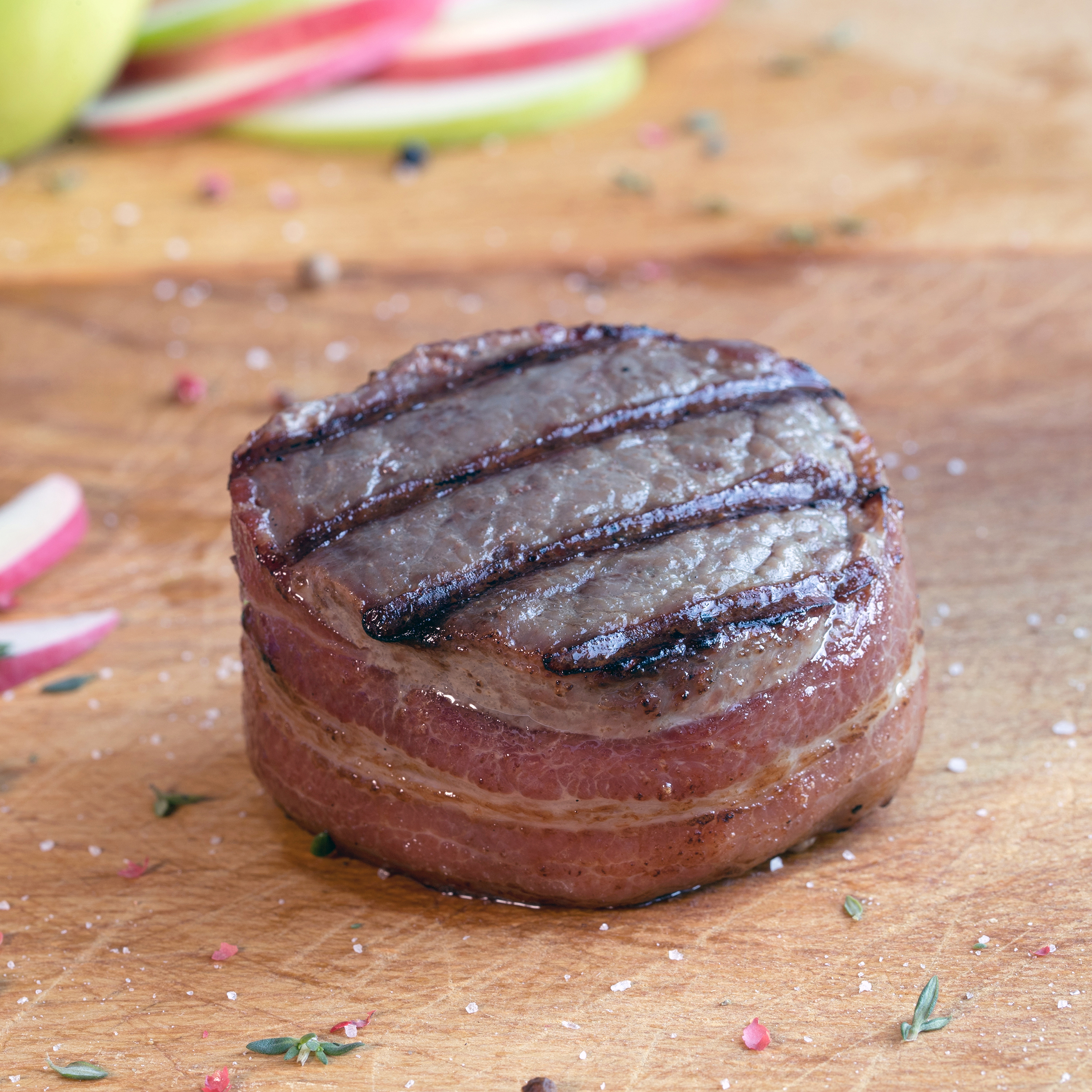 DESCRIPTION – Bring fine-dining steakhouse flavors to your dinner table at a price your wallet will love with Applewood Smoked Bacon Wrapped Beef Filets. Each tenderloin is carefully hand trimmed, packed with flavor and wrapped in sweet, smoky bacon.