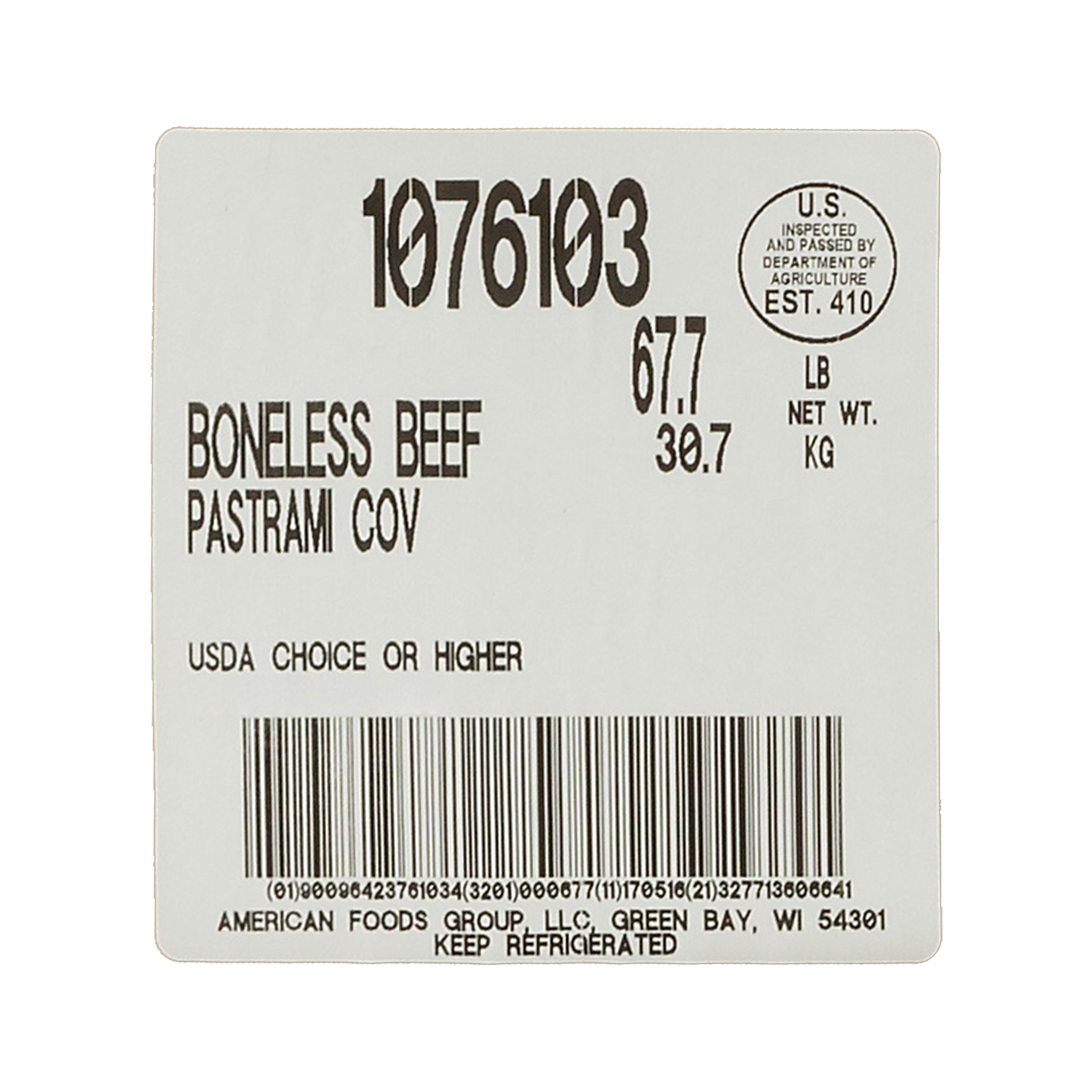 American Foods Group Fresh Boneless Beef Pastrami, Choice Grade, 4 Bags Per 60 Pound Average Weight Master Case, 4 Pastrami Pieces Per Bag