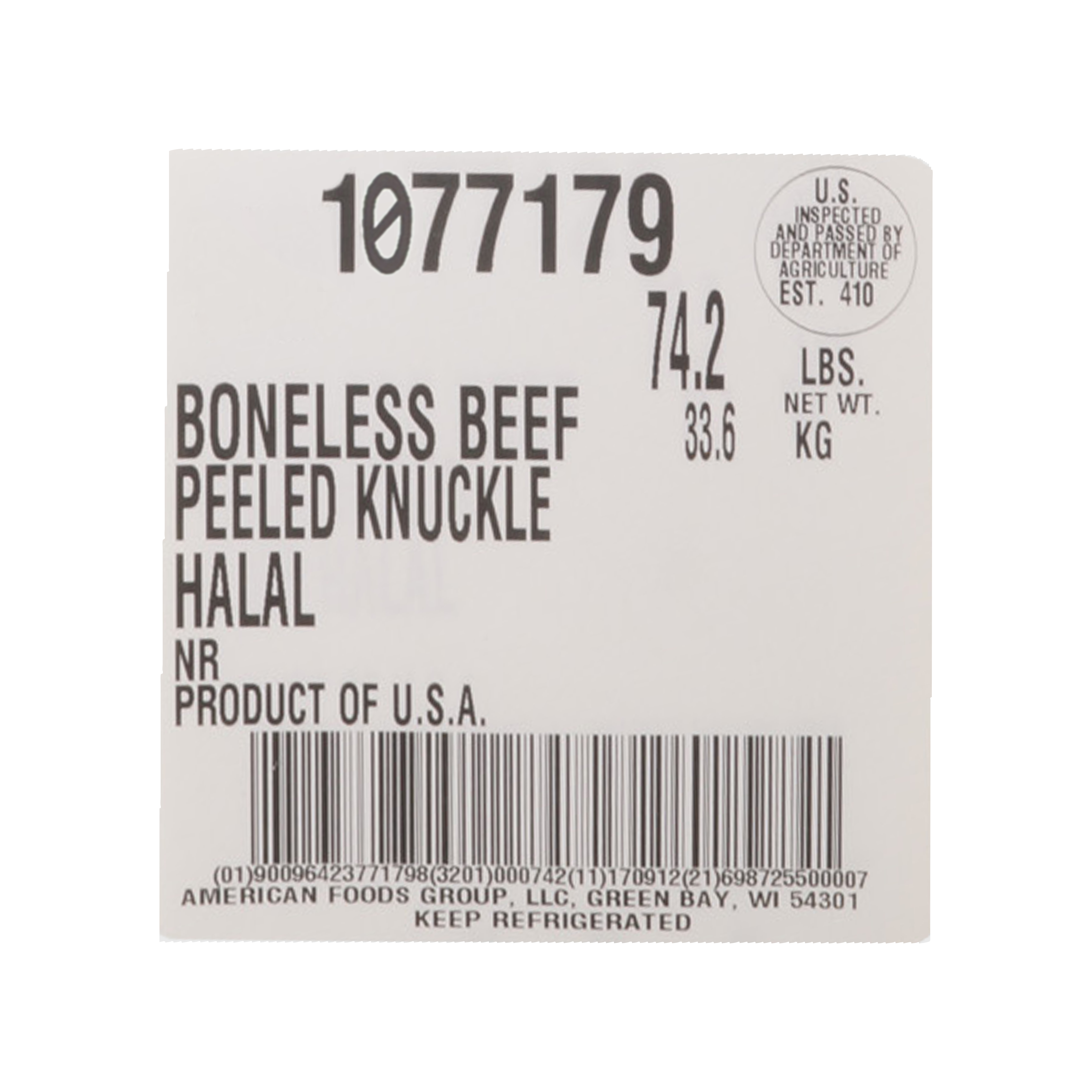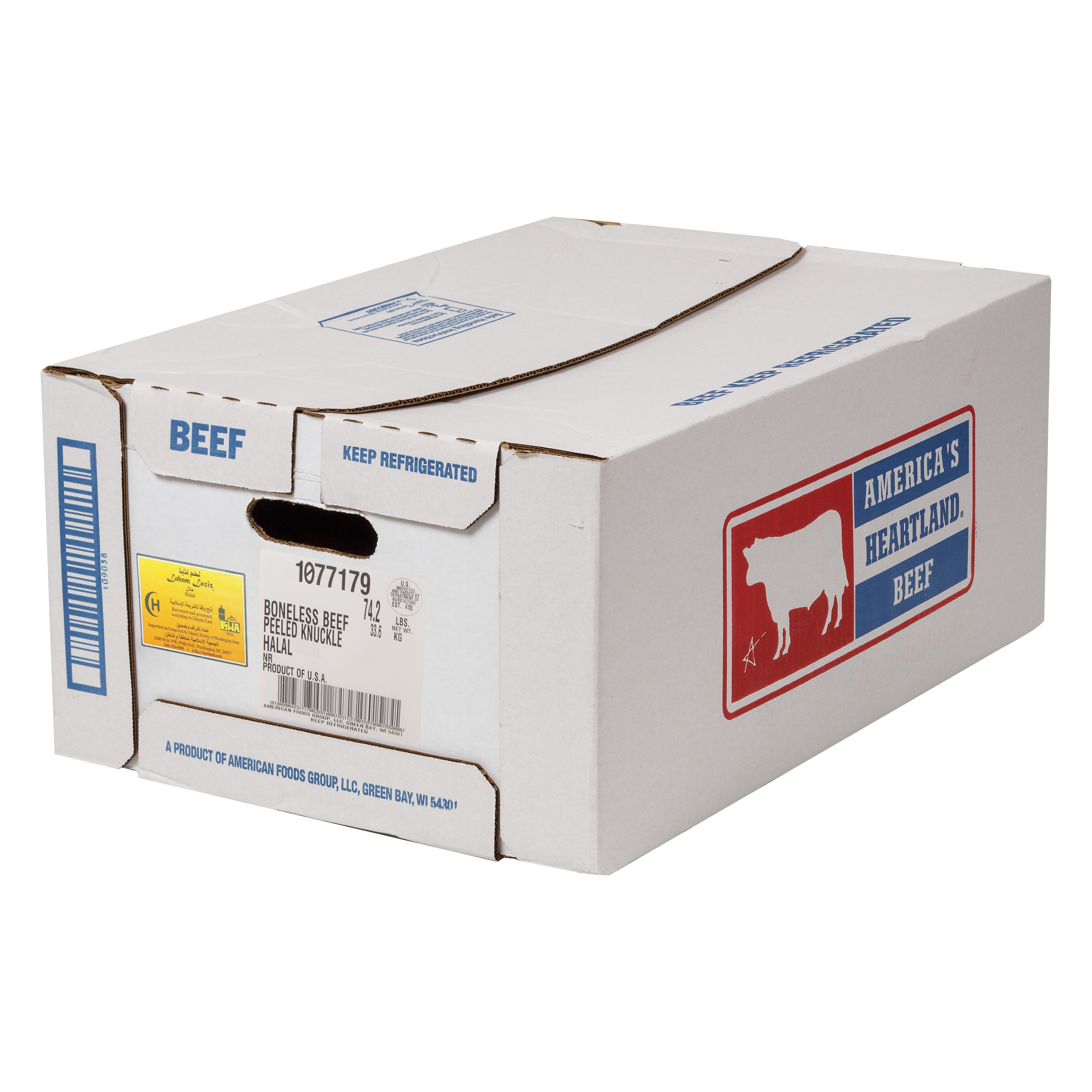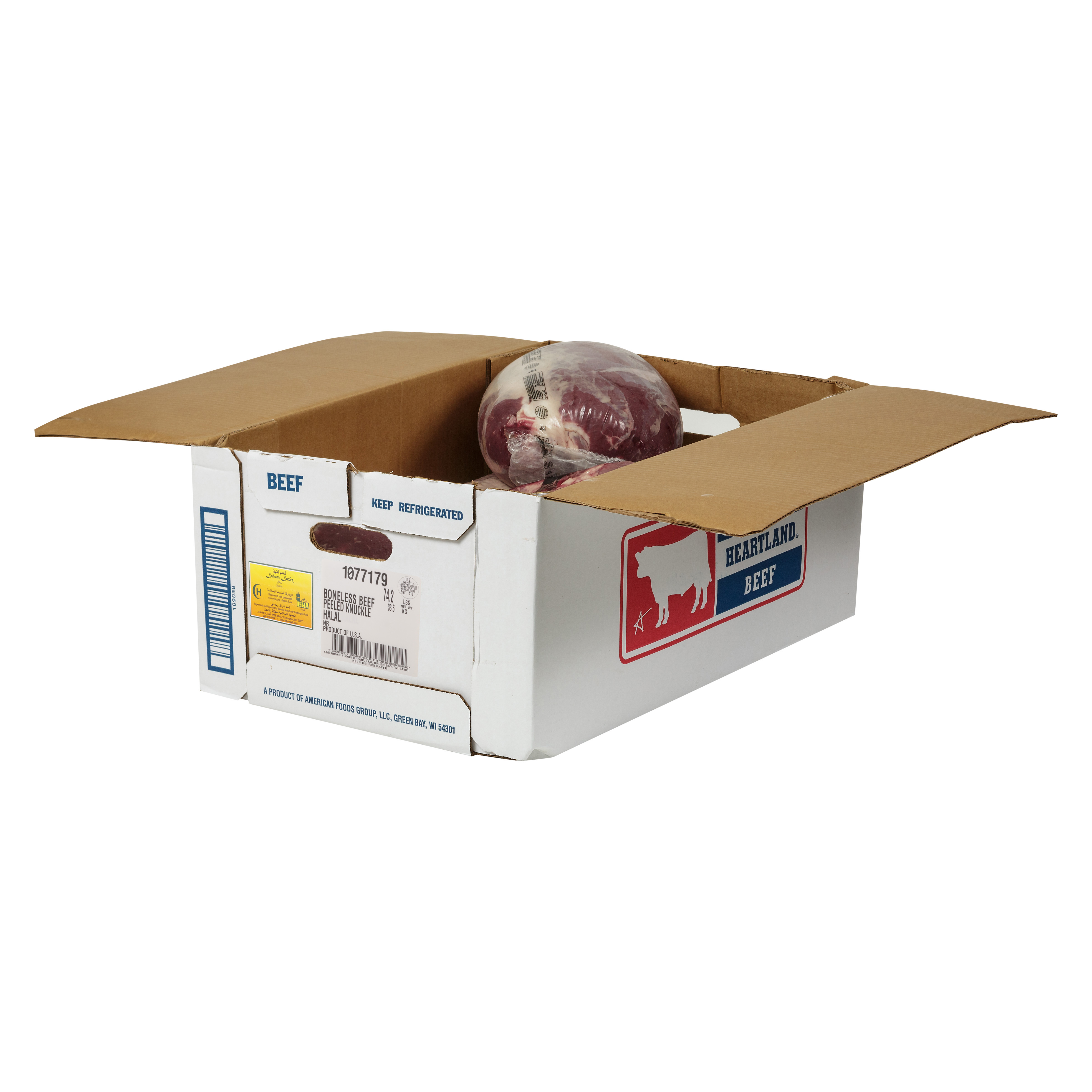 America’s Heartland Halal Fresh Boneless Beef Peeled Knuckle, No Roll Grade, 5 Bags Per 58 Pound Average Weight Master Case, 1 Peeled Knuckle Per Bag