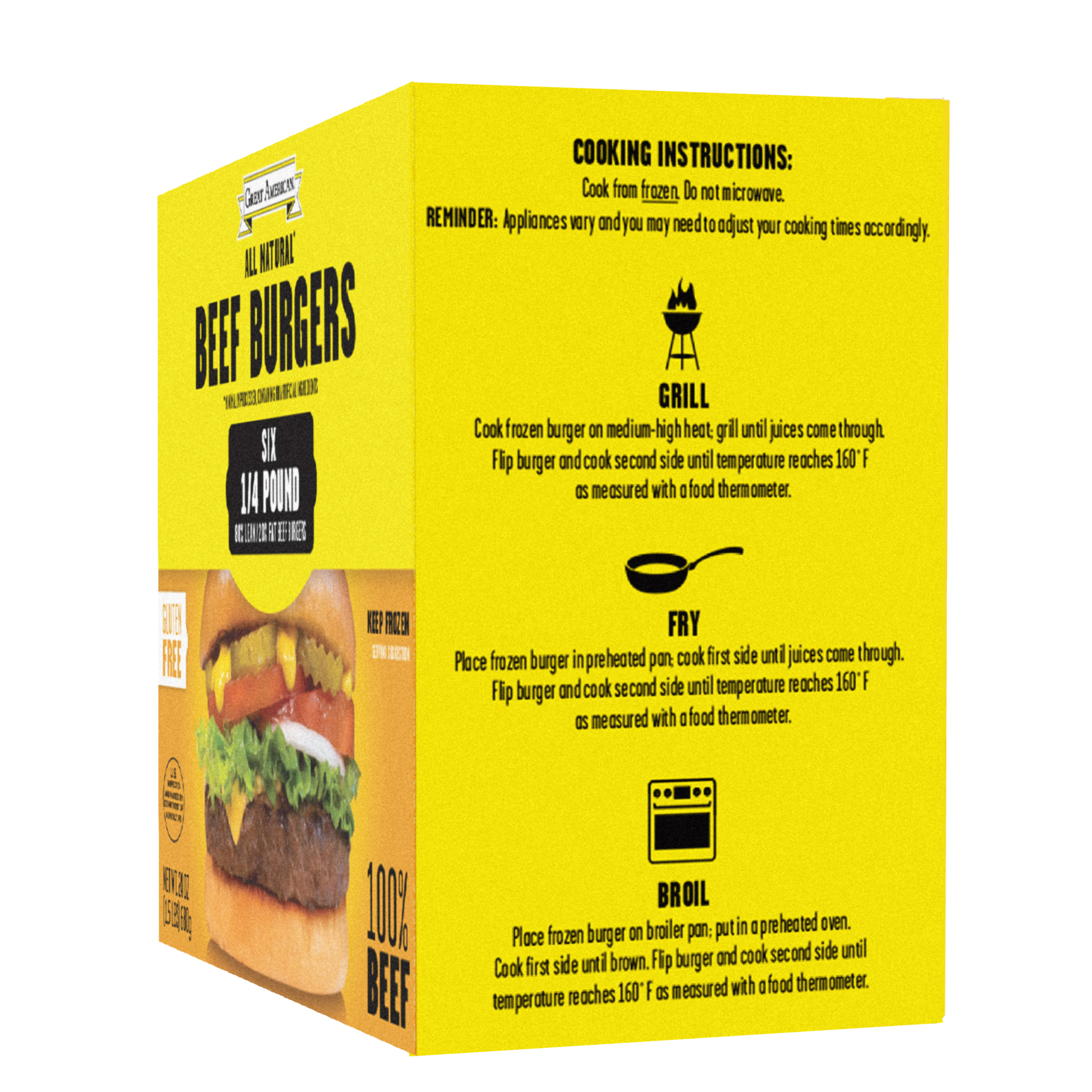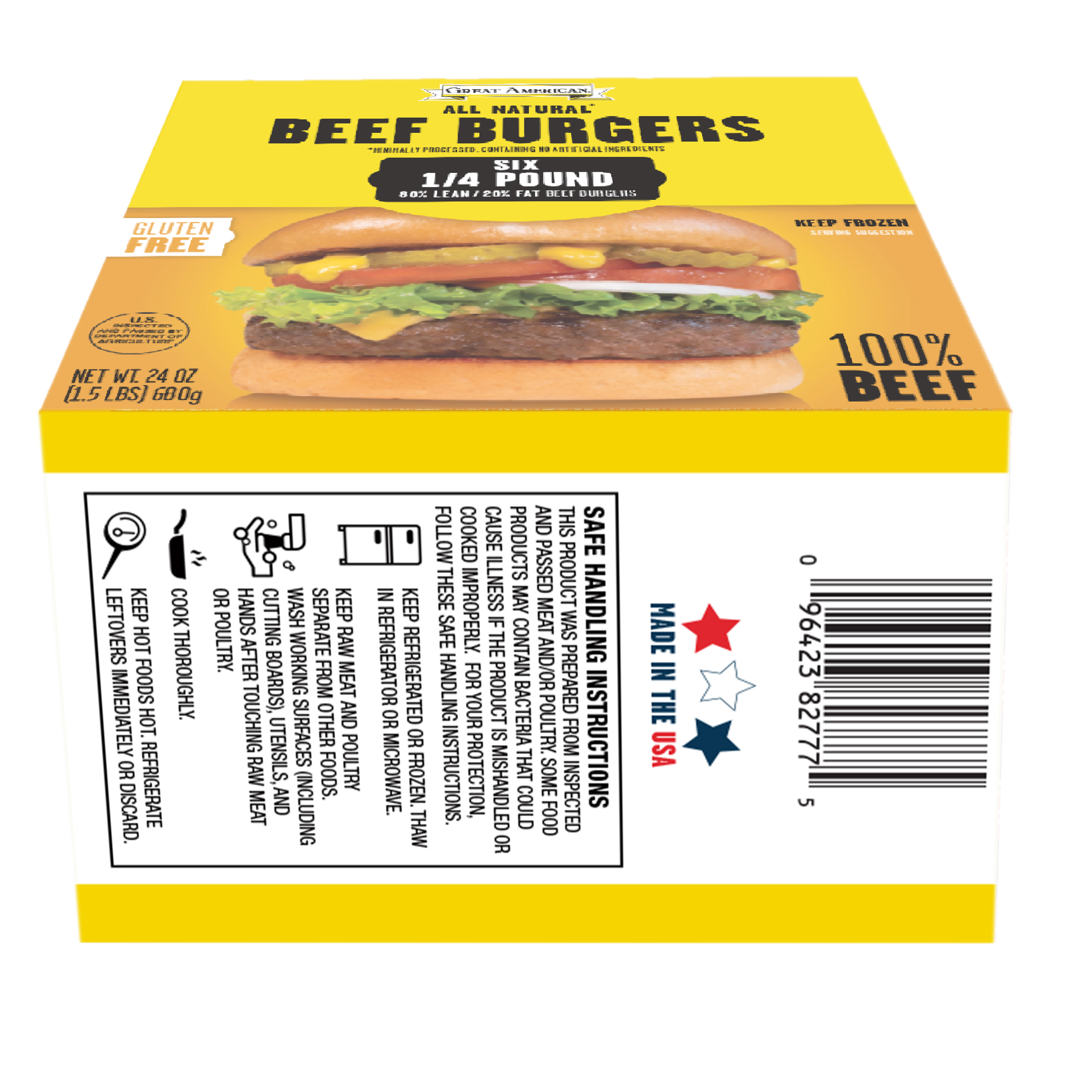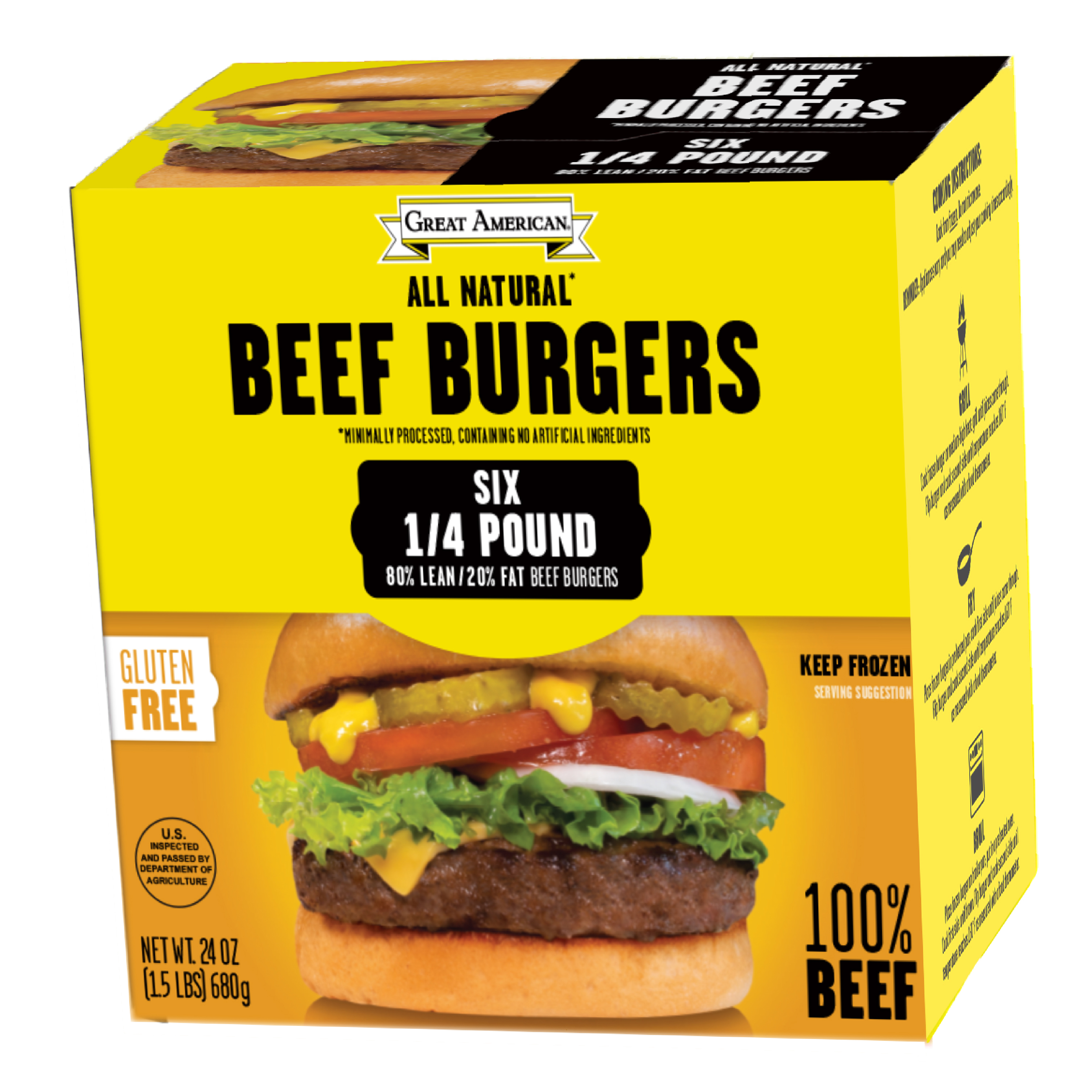 DESCRIPTION – Great American All-Natural 80/20 Beef Burgers are juicy, tender, and satisfying. Made from hand-selected cuts of our premium 100% beef and individually quick-frozen to preserve freshness. Packed with protein, our Beef Burgers are an easy and convenient meal. No need to thaw! Cook from frozen on the grill, fry in a pan, or under a broiler, and serve on a toasted bun piled high with your favorite toppings. For a delicious alternative, serve smothered with sautéed onions and mushrooms. Family-friendly and affordable, these high-quality burgers save you money and time. We offer a variety of options so be sure to try them all.