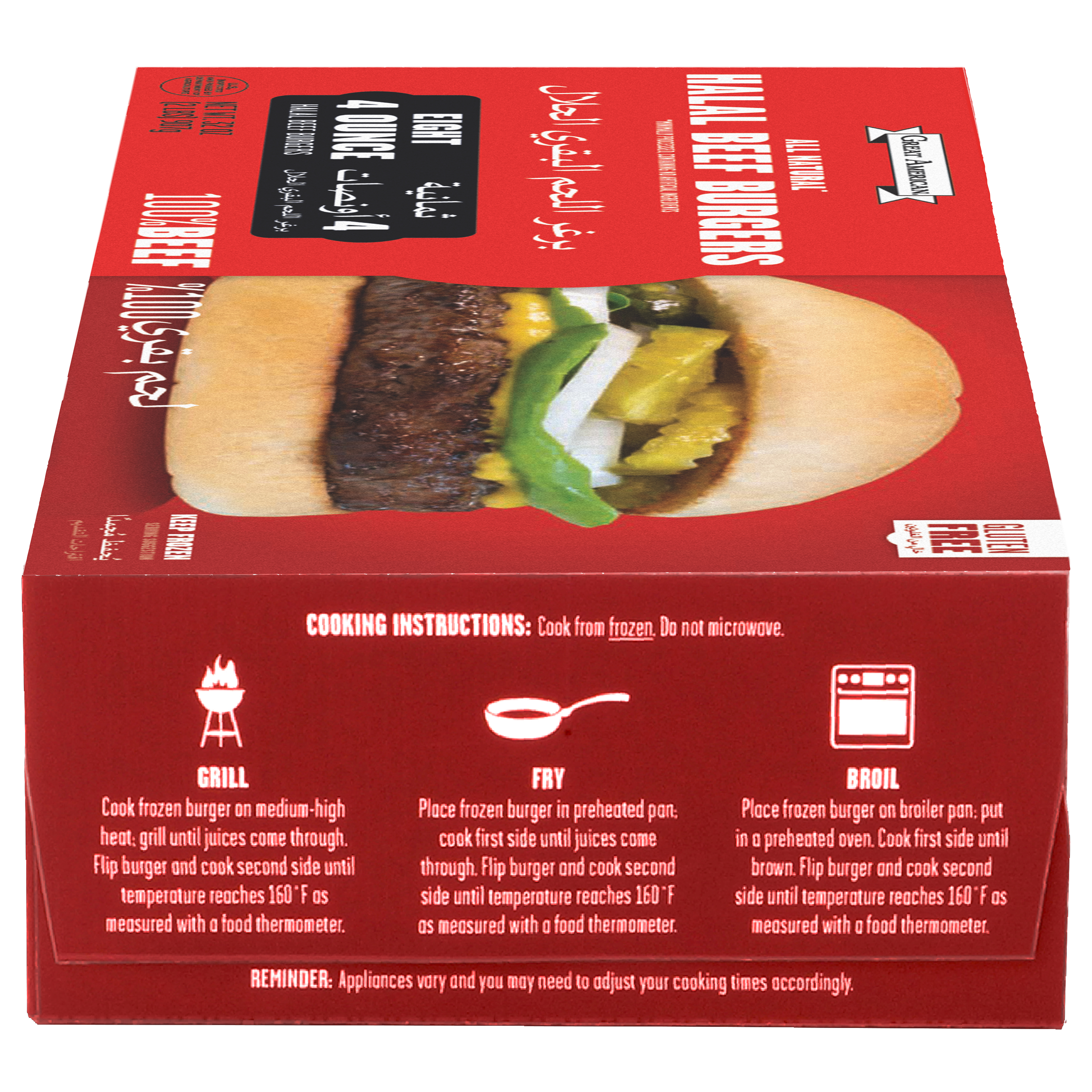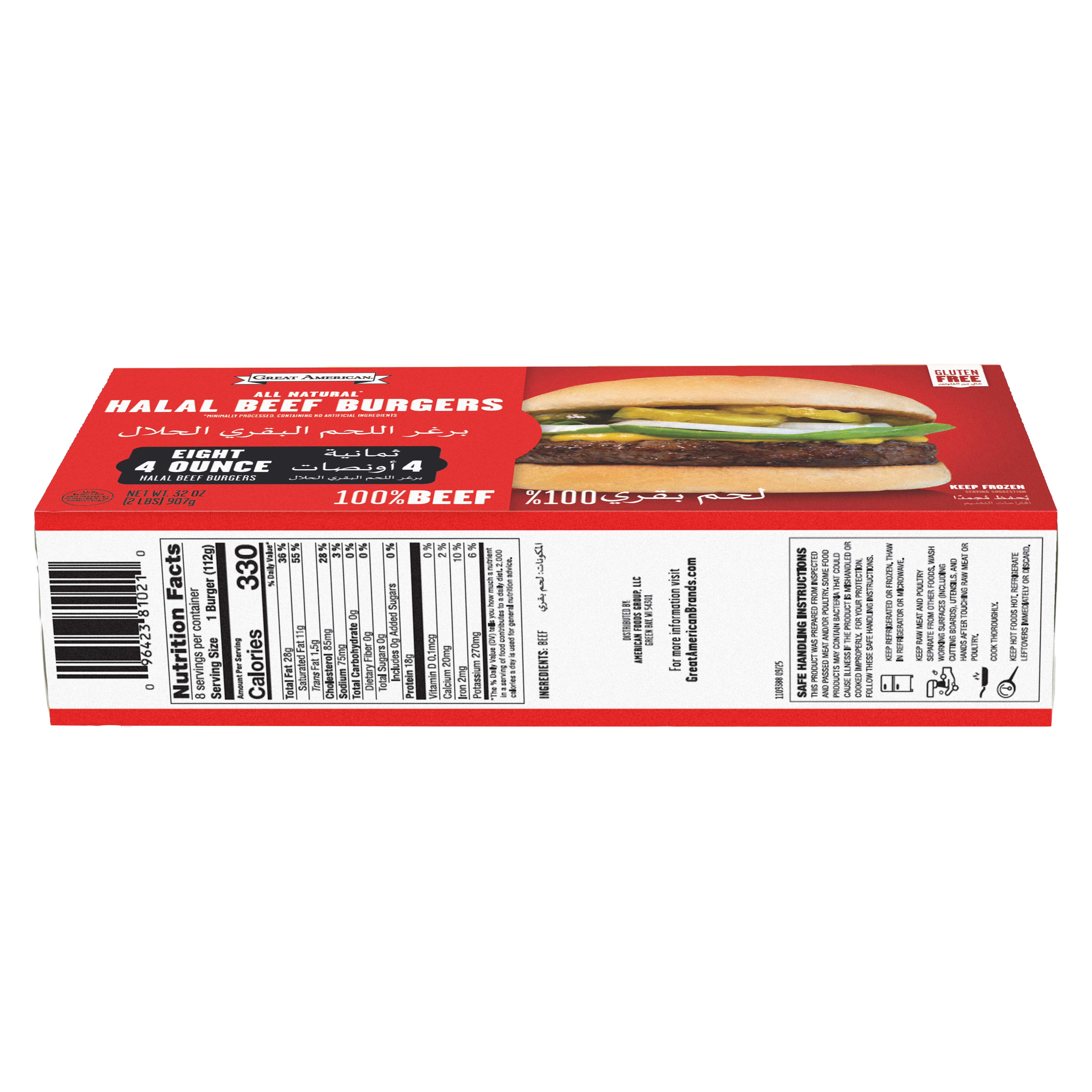 DESCRIPTION – Great American All-Natural Halal 75/25 100% Beef Burgers are juicy, tender, and satisfying. Made from hand-selected cuts of our premium 100% beef and individually quick-frozen to preserve freshness. Packed with protein, our Beef Burgers are an easy and convenient meal. No need to thaw! Serve on a toasted bun piled high with your favorite toppings. Family-friendly and affordable, these high-quality burgers save you money and time. We offer a variety of options so be sure to try them all.