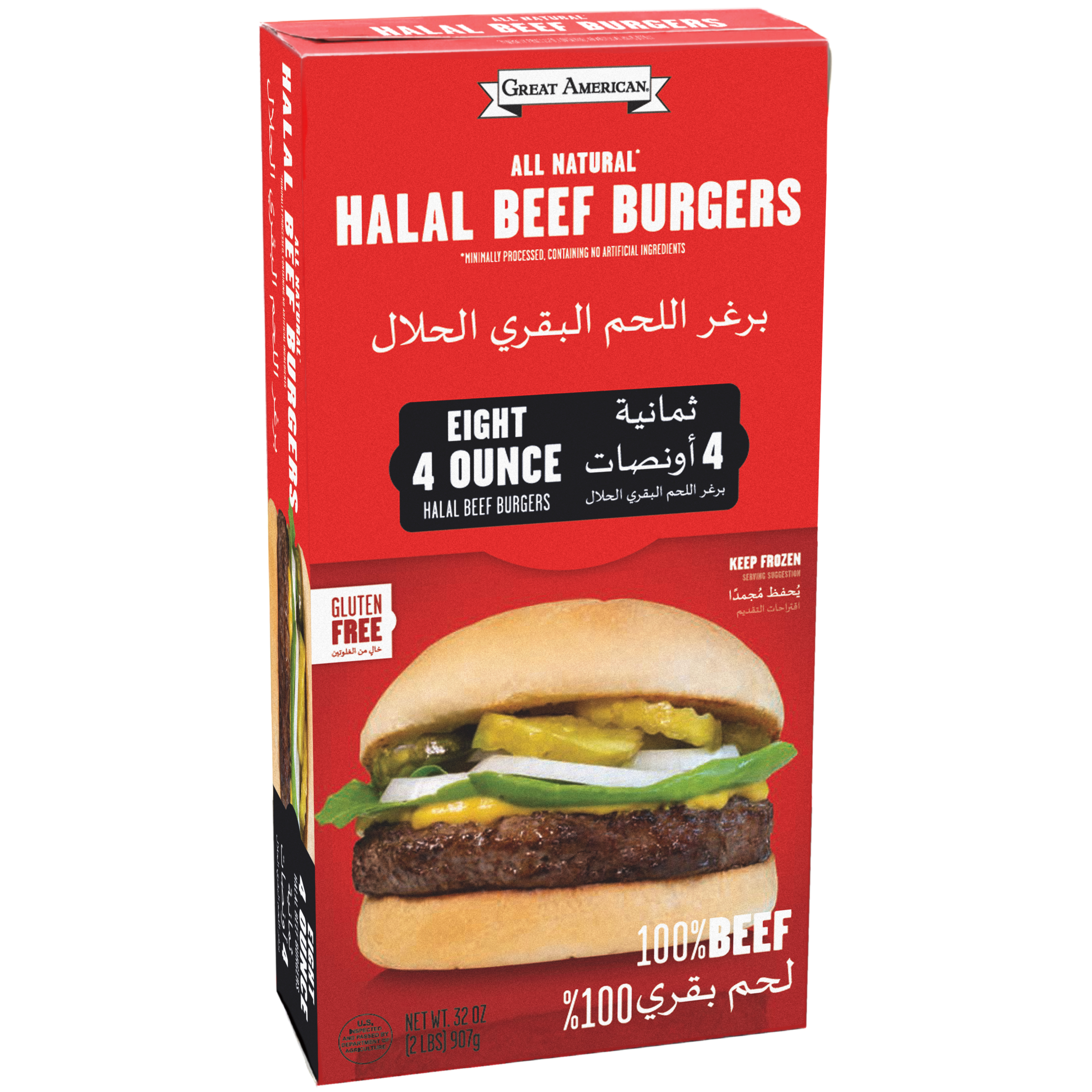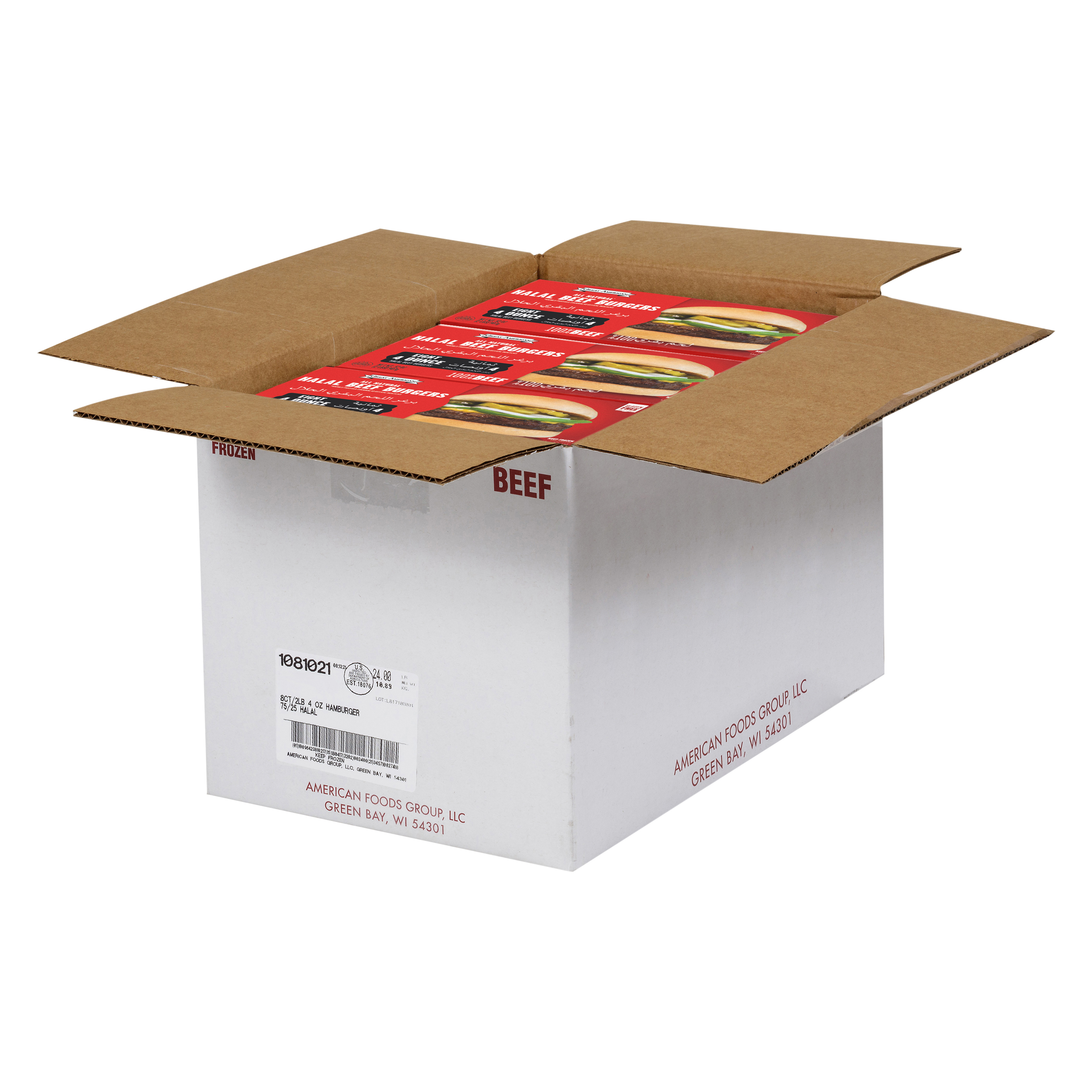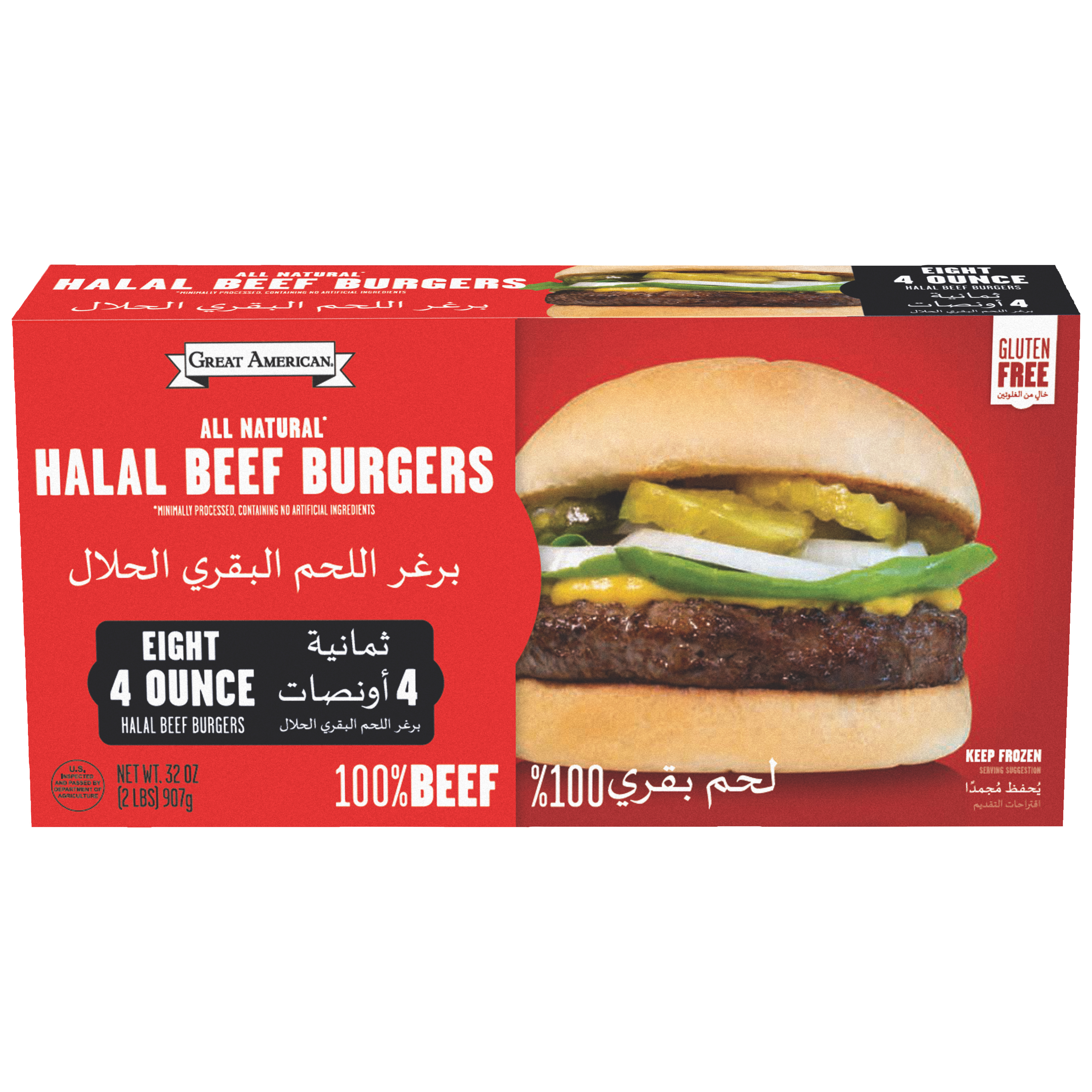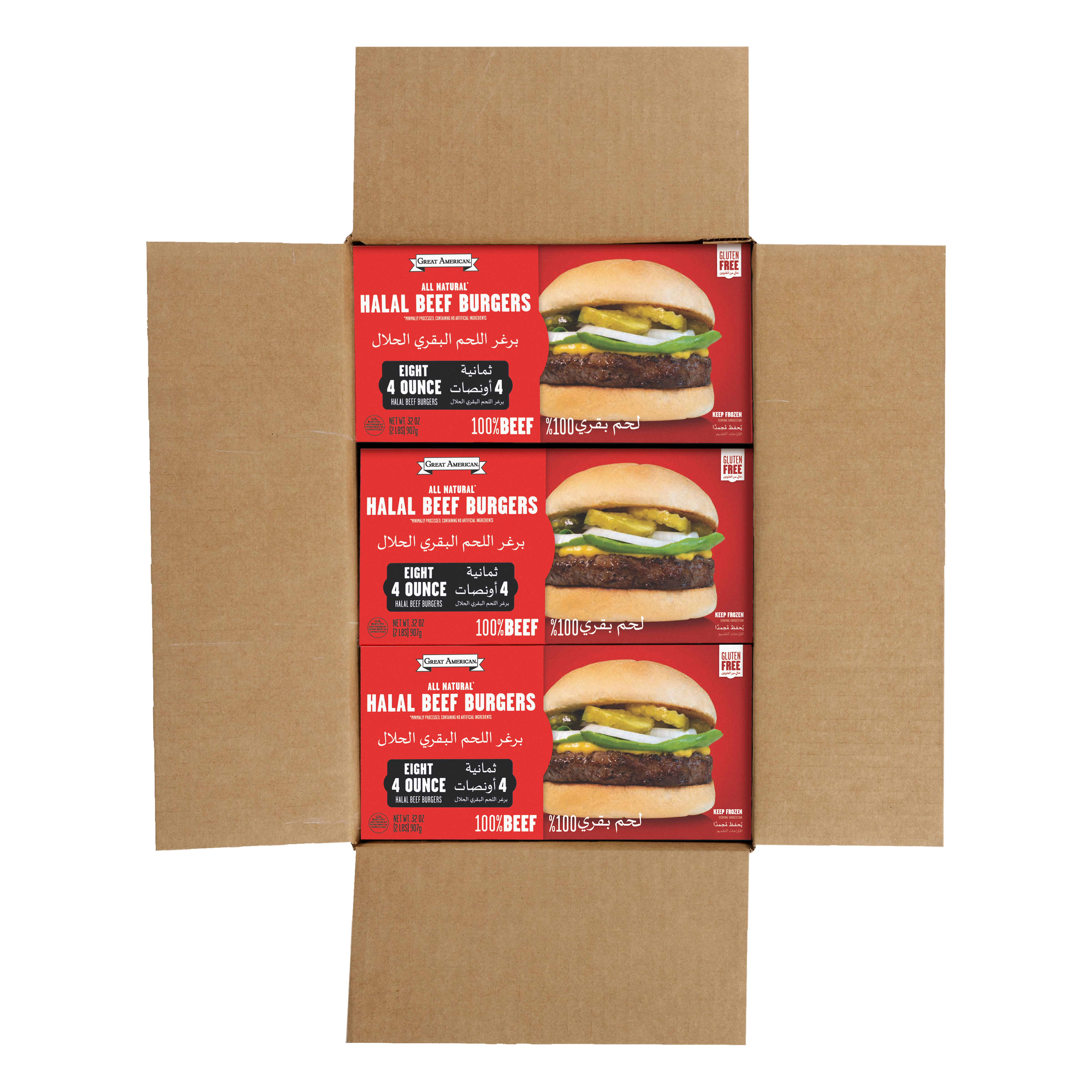 Great American Brands All Natural Ground Beef Burgers Halal, 75 Percent Lean 25 Percent Fat, 12-2 Pound Boxes Per 24 Pound Net Weight Master Case, 8-4 Ounce Burgers Per Box