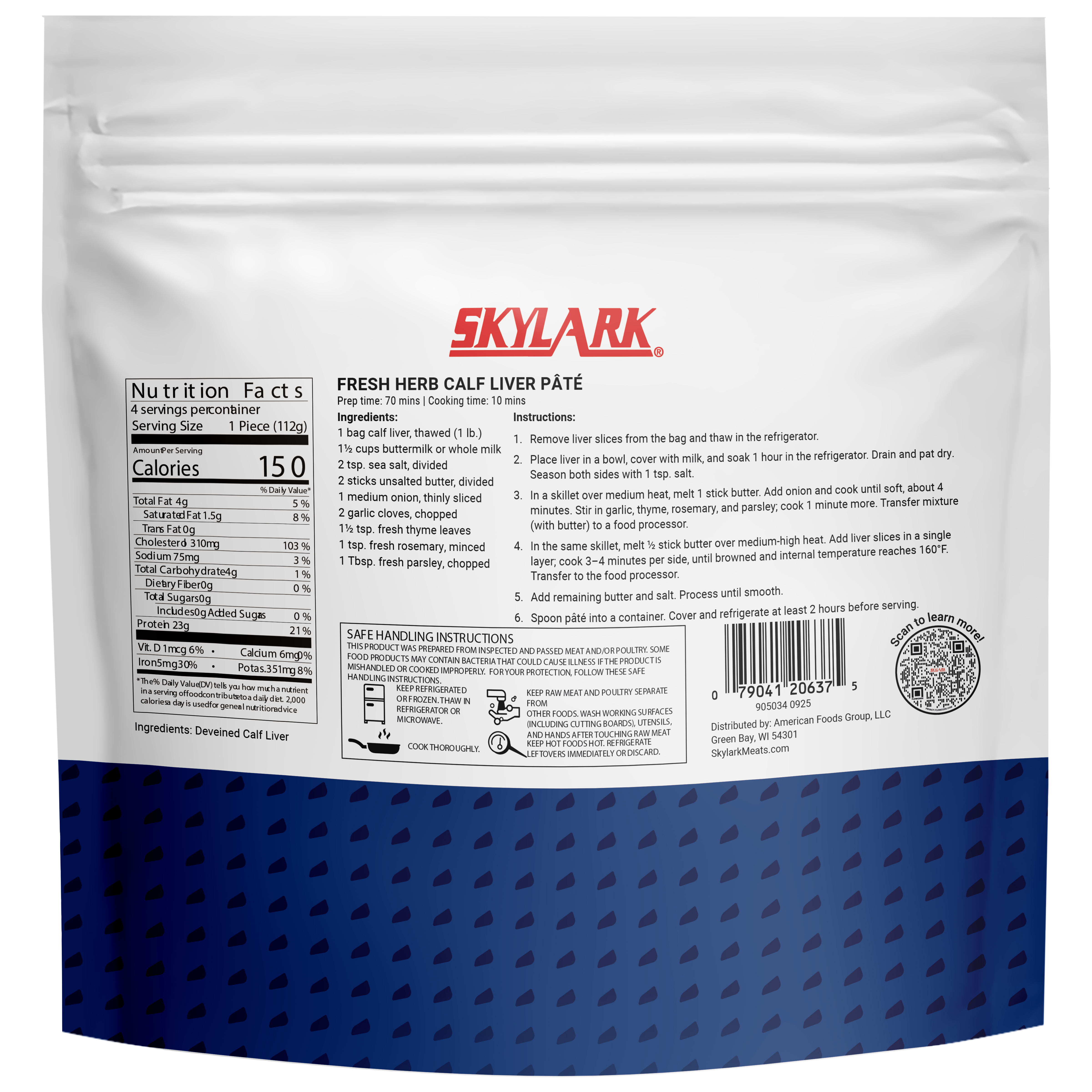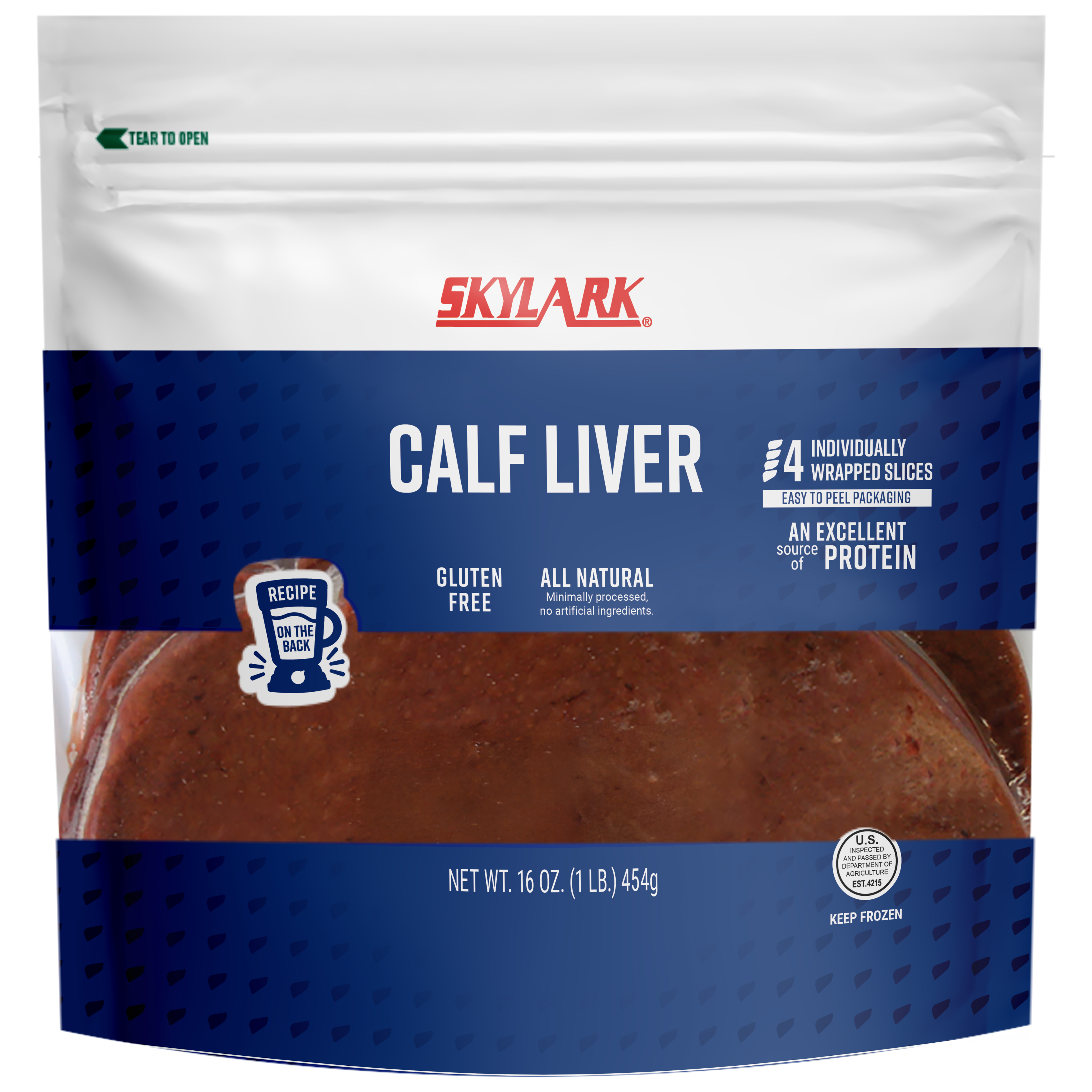 DESCRIPTION – Skylark Meats Calf Liver is a classic that is sure to bring the tastes of home to your dinner table. This highly nutritional, USDA approved protein can be sautéed with onions, stir-fried with your favorite vegetable, or turned into a savory calf liver pâté for a tasty appetizer. Liver is not only an excellent source of Protein but Vitamin A and Iron as well. Each serving is individually wrapped in easy-peel packaging. Nutritious and delicious, our liver will give a powerful punch of nostalgia that will have you making liver a weekly meal!