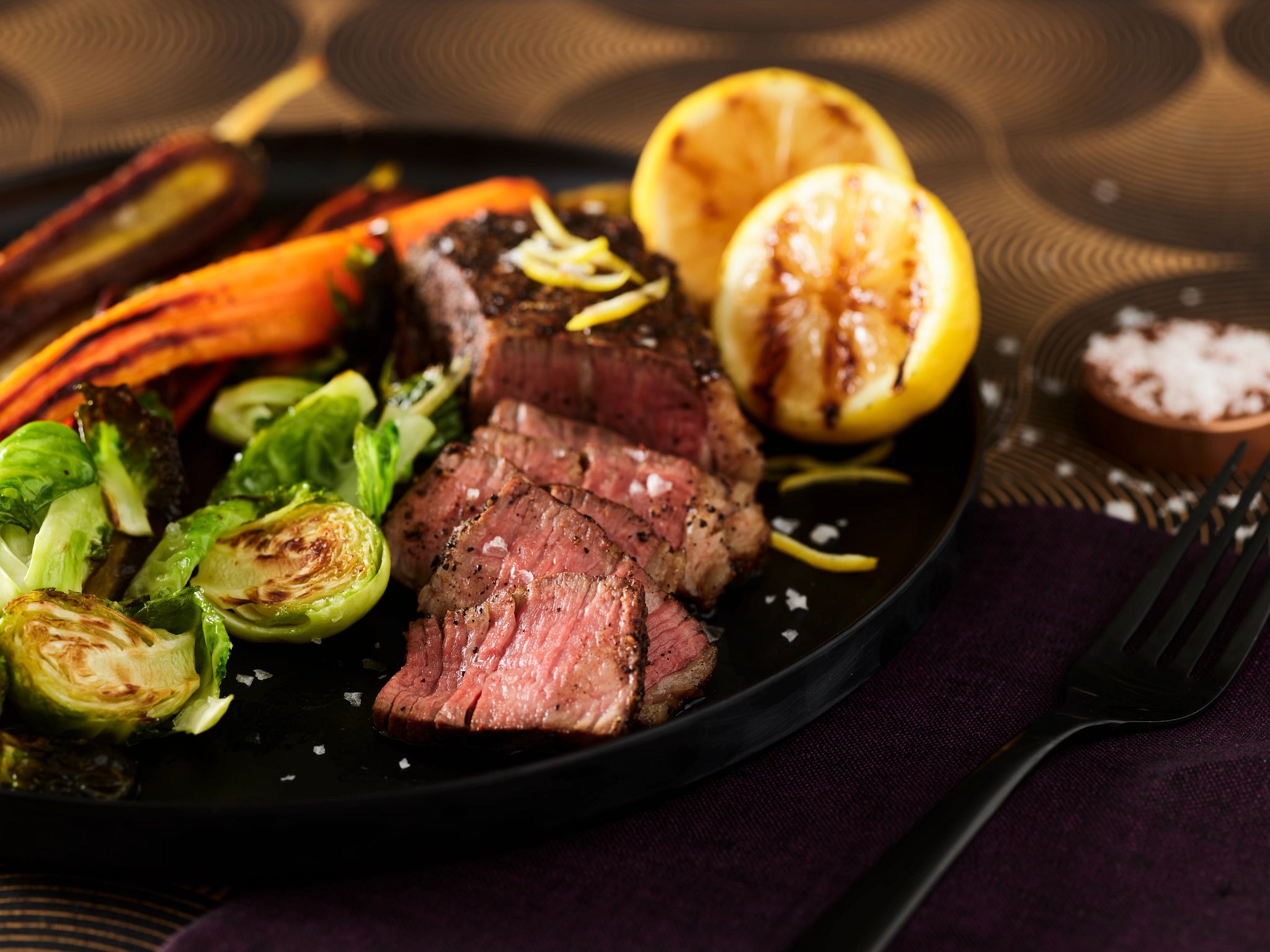 - Carve steaks into slices. Season with salt, as desired. Garnish with green onions, lemon wedges and lemon peel, if desired