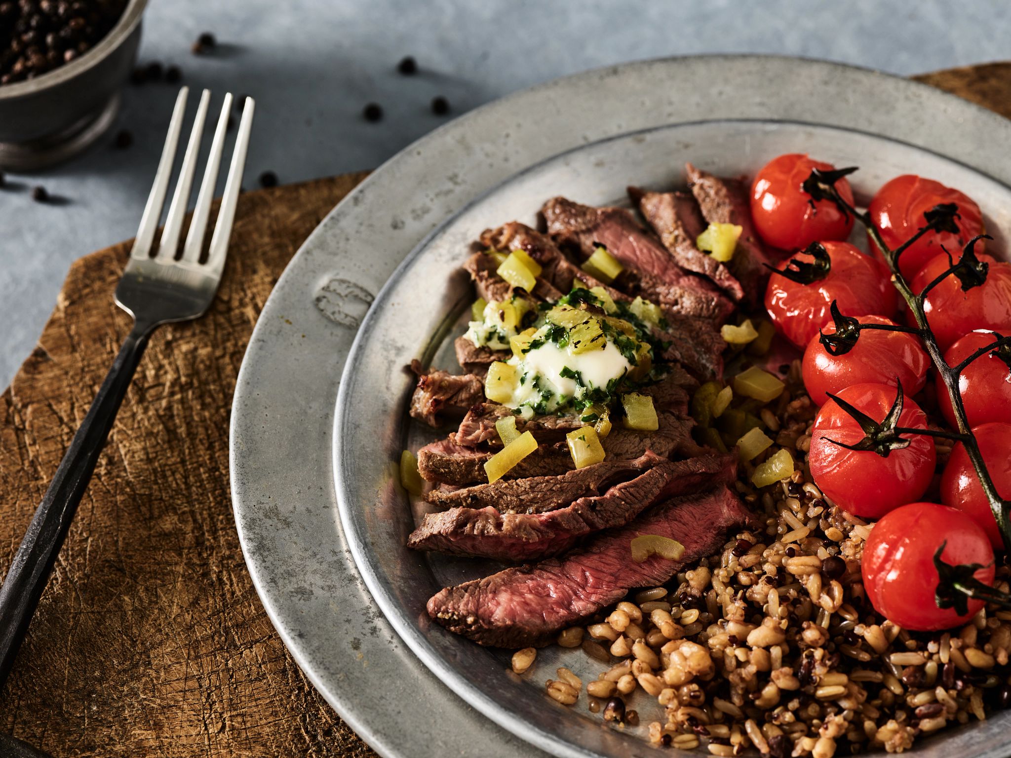 Pepper Beef Steaks with Chile-Cilantro Butter