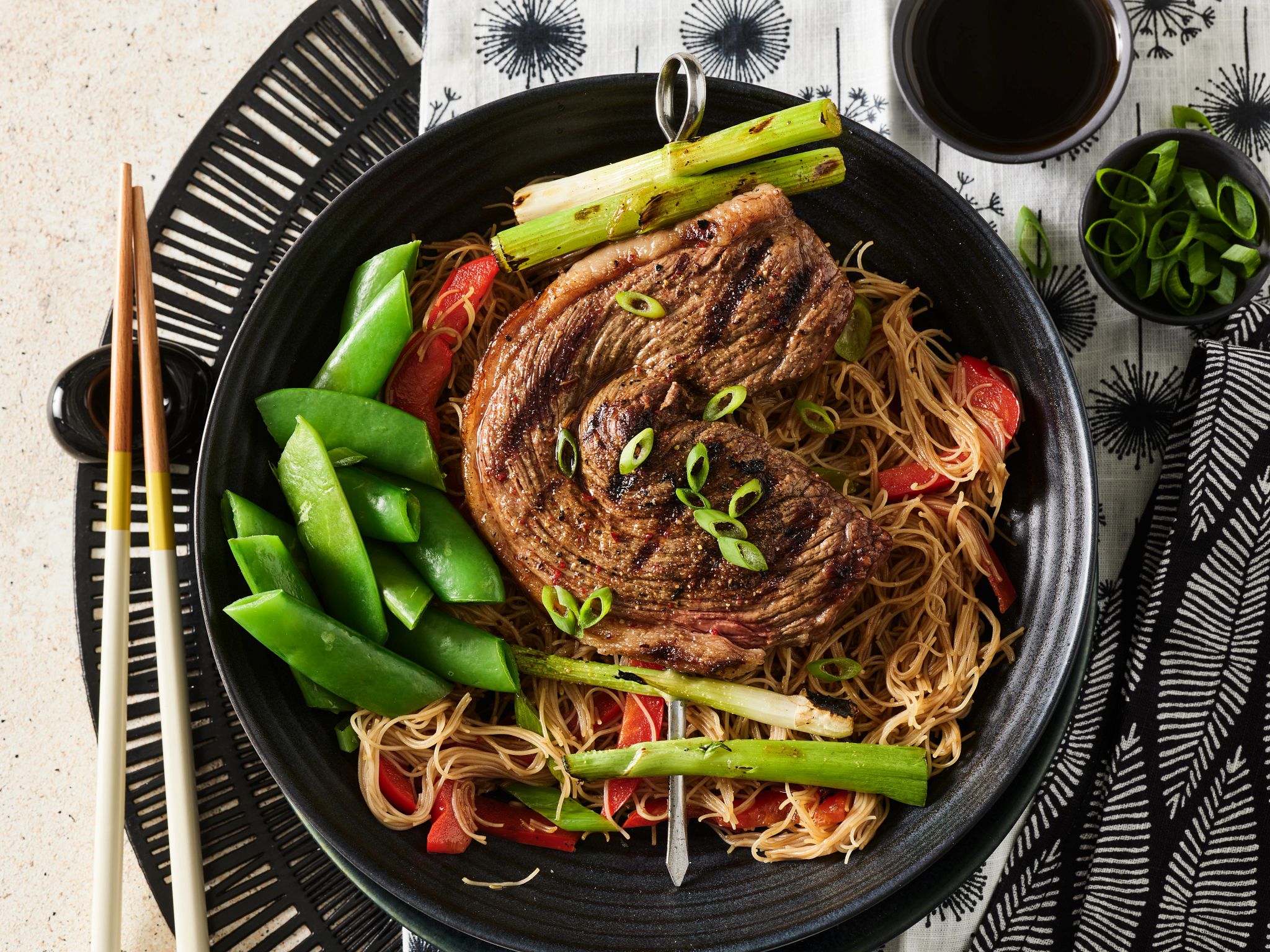 Our spin on traditional Filipino pancit. Grilled Coulotte Steaks in a soy glaze with grilled scallions and vermicelli rice noodles.