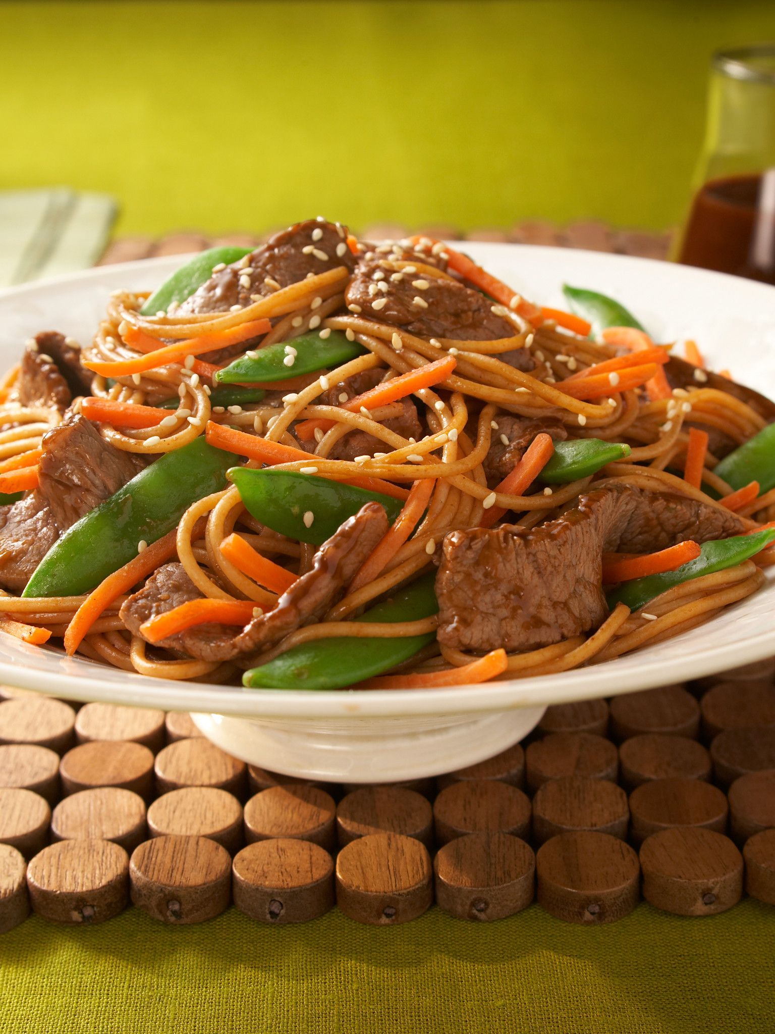 - Add beef with juices and reserved marinade to pasta and vegetables; toss to combine. Sprinkle with sesame seeds, if desired.